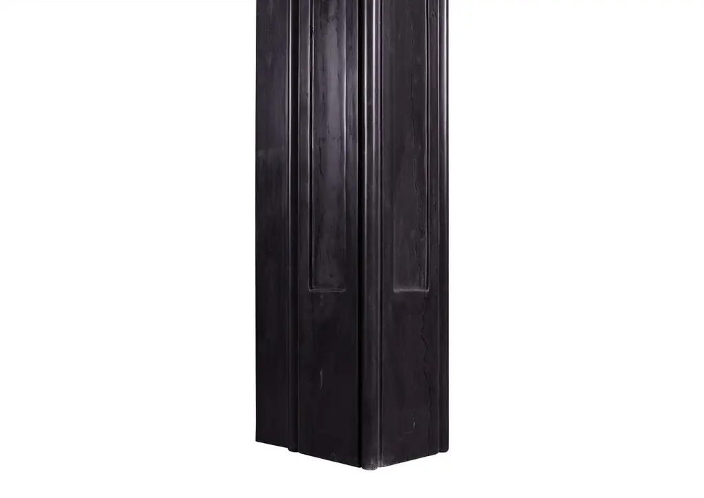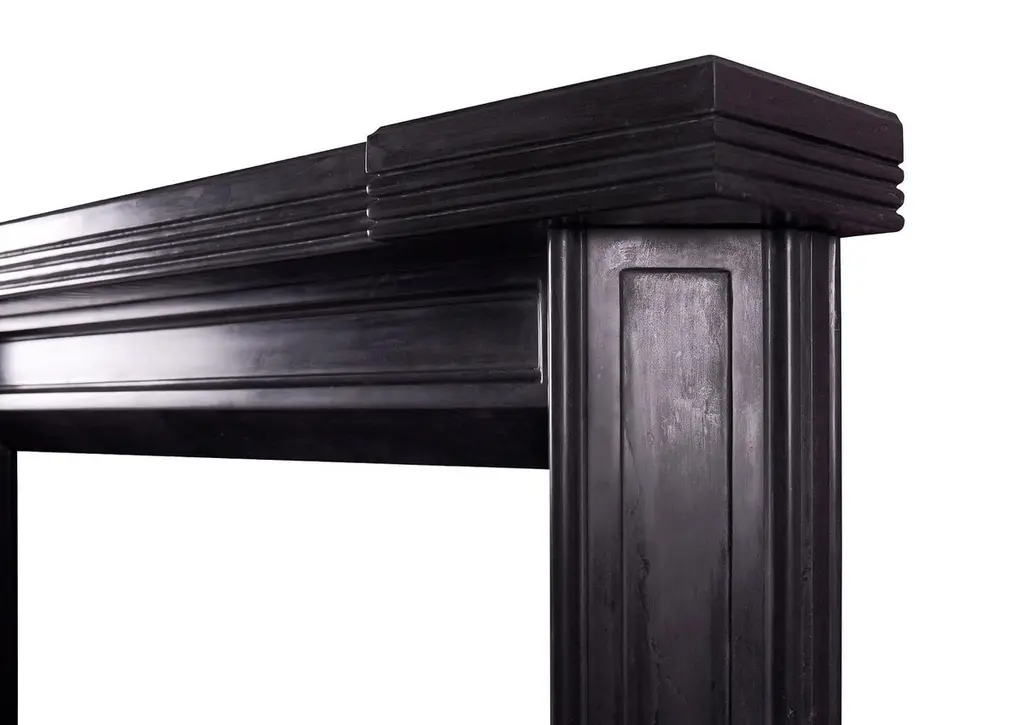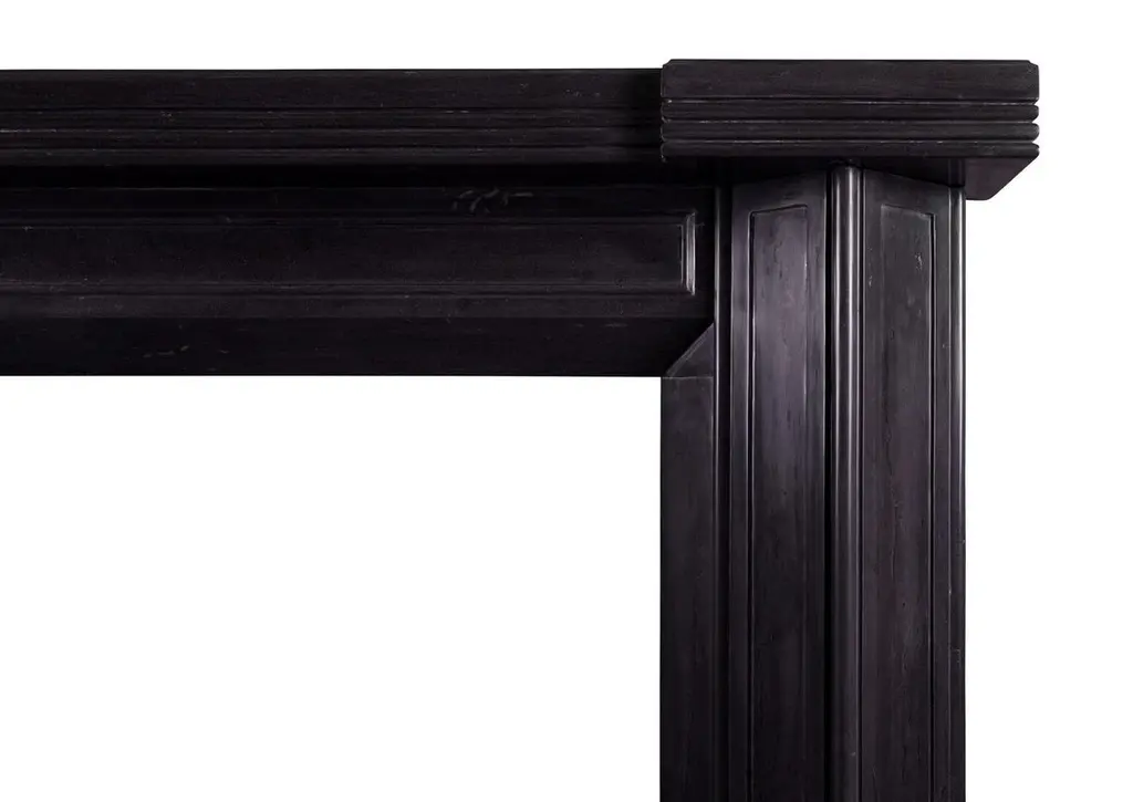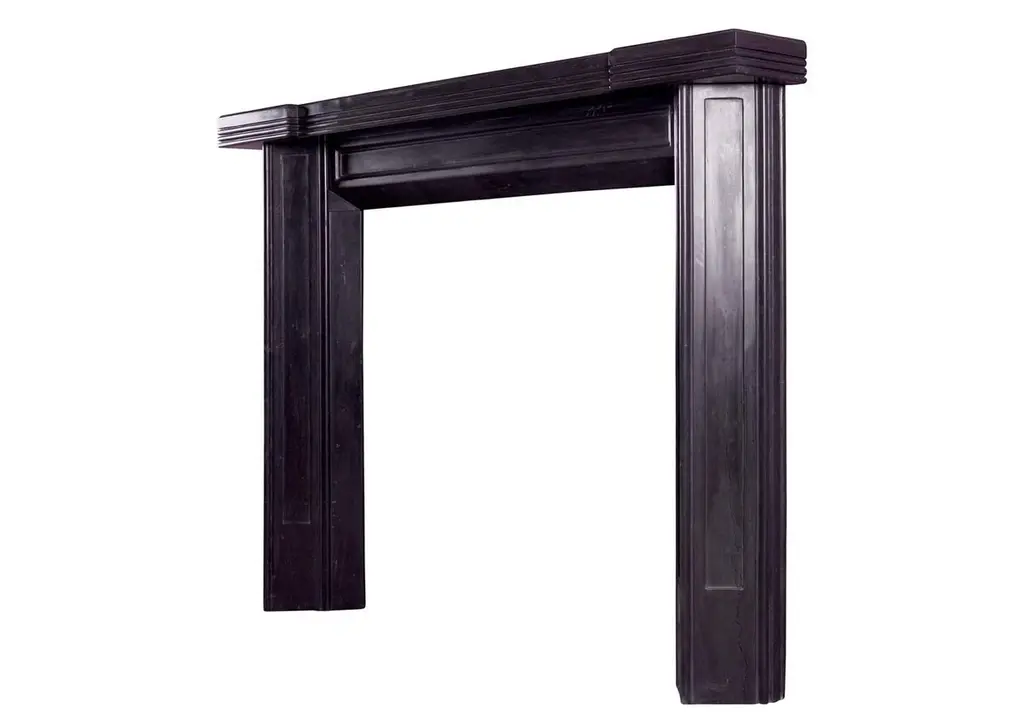 An unusual Art Deco style fireplace in black marble. The triangular, panelled jambs surmounted by panelled frieze and reeded shelf. A copy of an early 20th century original. A clean design in a marble would suit the Classic or the contemporary.Measures: Shelf width 1505 mm / 59 1/4 inOverall height 1150 mm / 45 1/4 inOpening height 920 mm / 36 1/4 inOpening width 920 mm / 36 1/4 inDepth of shelf 200 mm / 7 7/8 in.