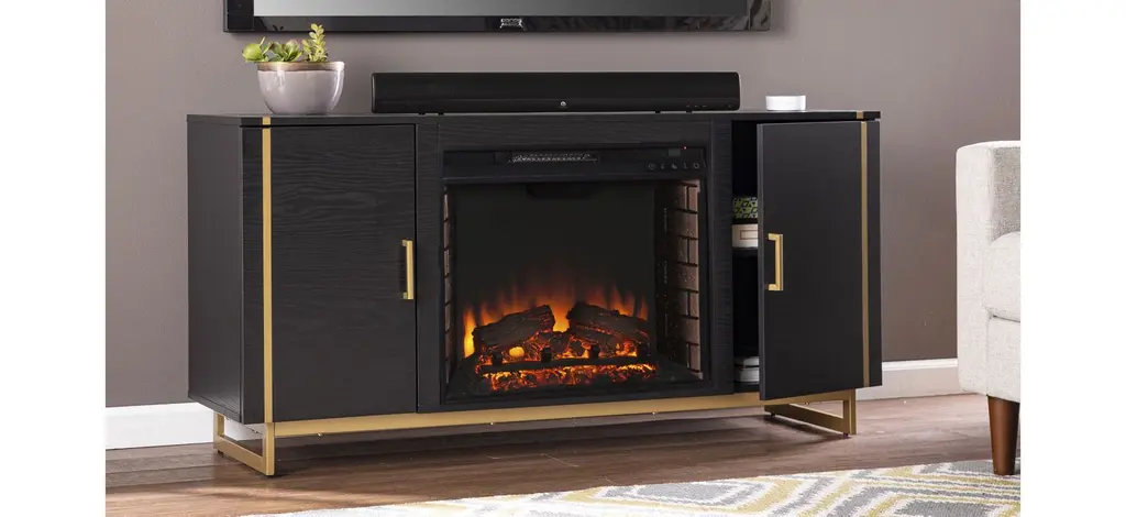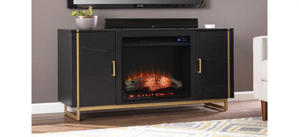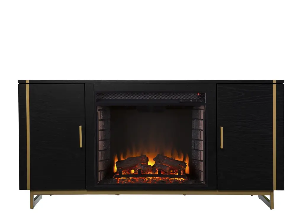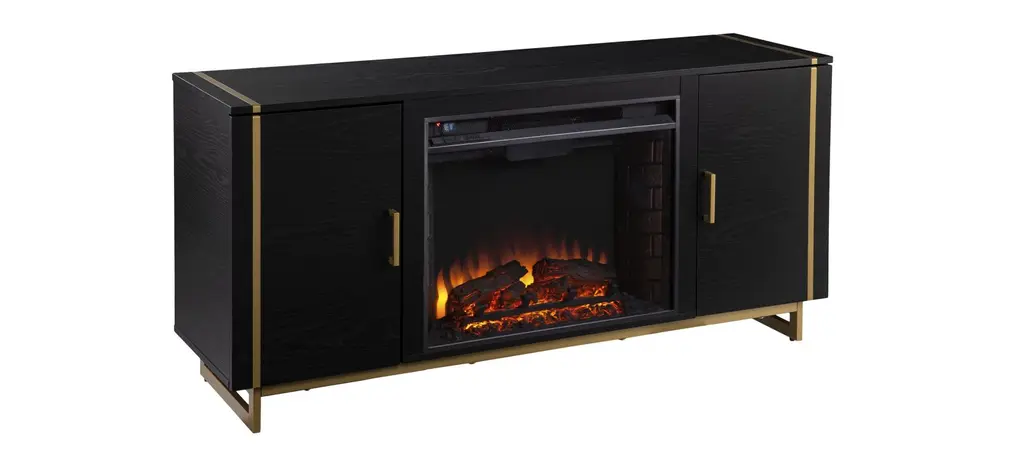 Turn on chic style with this Brigg Fireplace. Gold accents add a sleek, modern feel to your living space, while soft-close doors conceal DVDs and video games. Lifelike LED flames and remote-controlled features bring stylish comfort to your family room or den, working with or without heat for enjoyment in all seasons. Feel fired up about movie night at home when you gather around this media fireplace in your living area or media room.