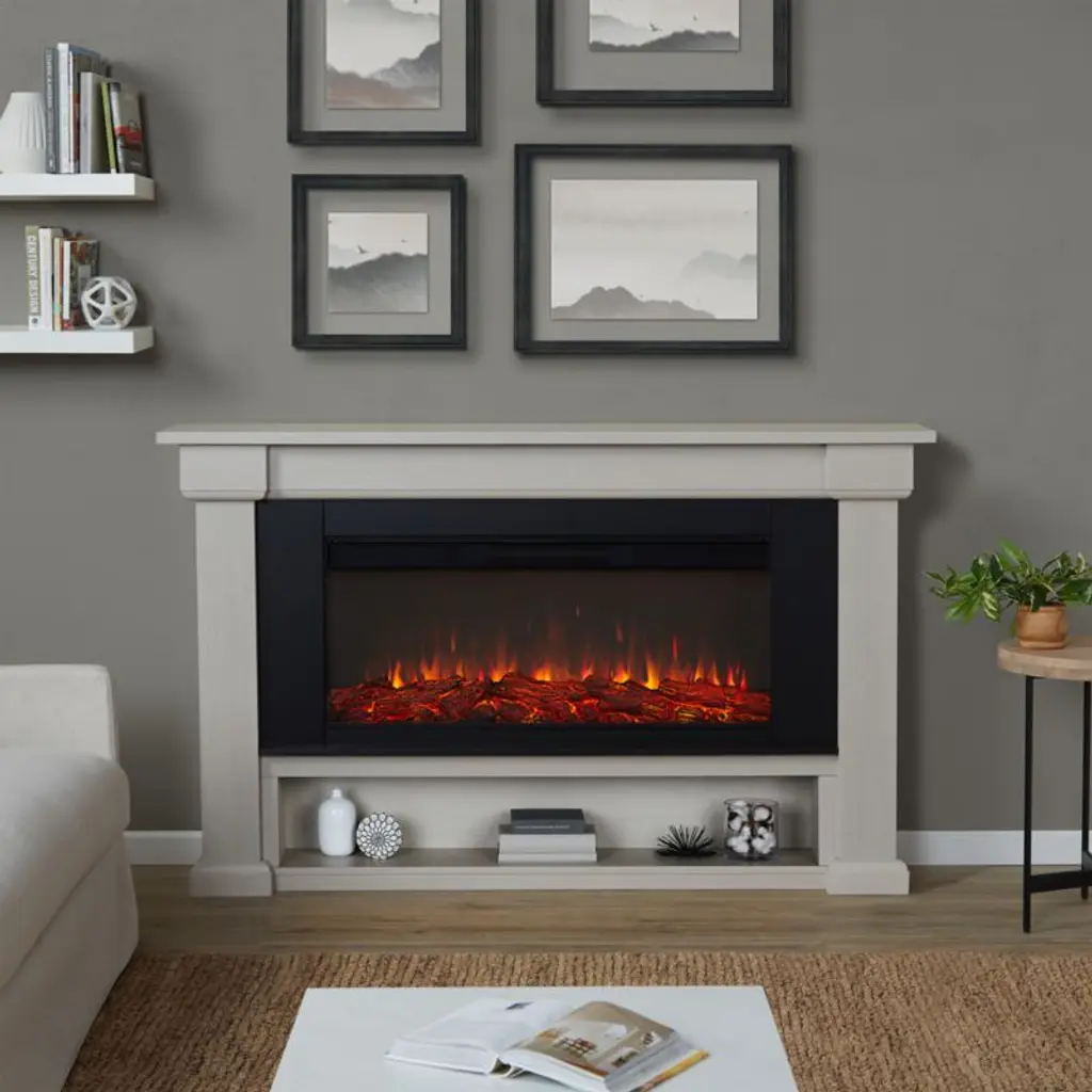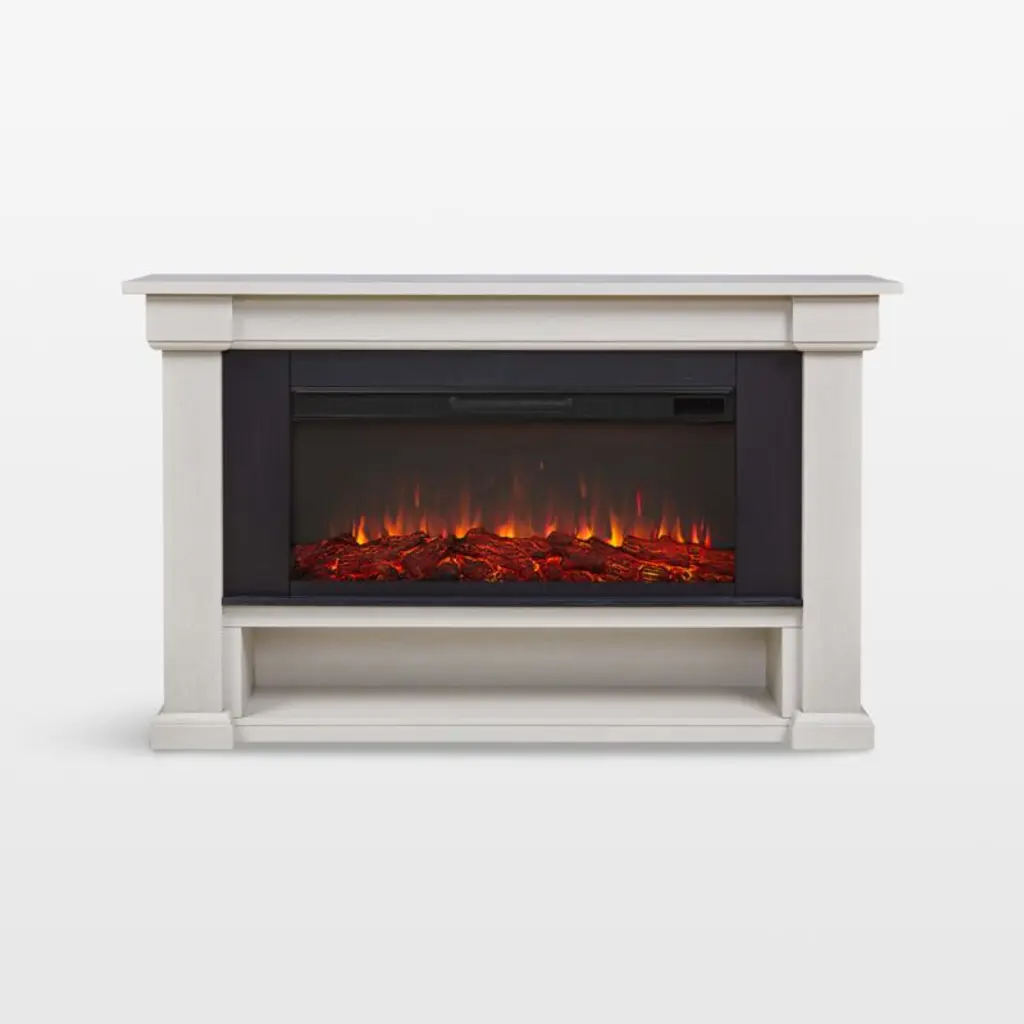 Add the coziness and charm of a wood-burning hearth to your home with this worry-free electric fireplace, a Crate & Barrel exclusive. Designed in the style of a traditional fireplacecomplete with a light wood surround and mantelBristow creates dynamic glowing embers and warm dancing flames in six colorways. Use the remote control to set your desired brightness, temperature and time, or choose the heatless flame option when you want the look but not the feel of fire. To complete the look, fill the storage space below the firebox with real logs (not included).