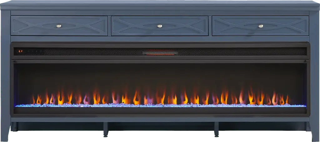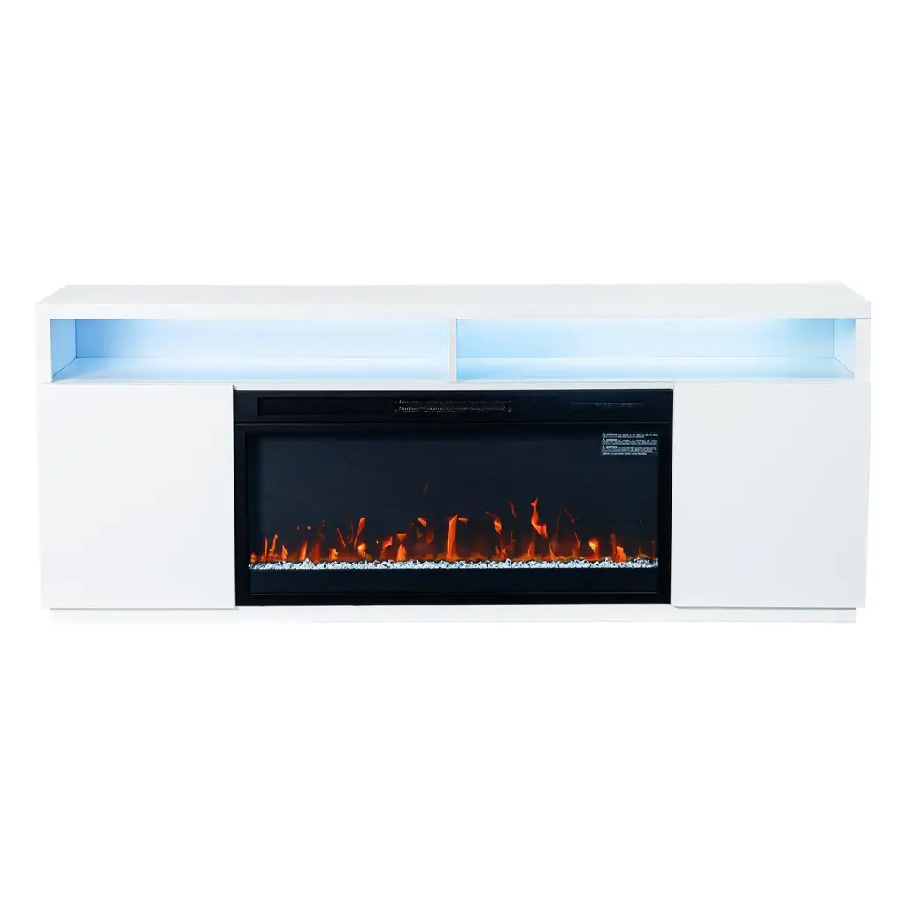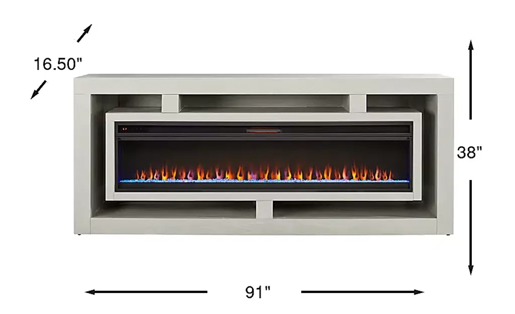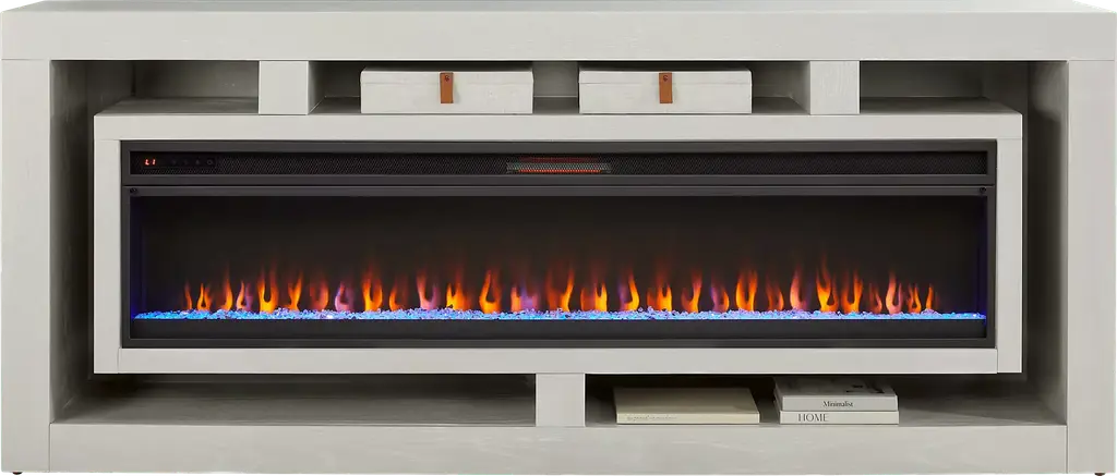 Nights of warmth and connection glow with the beautifully balanced symmetry and simple yet thoughtful details of the Brookland Park collection, creating a serene foundation for your home entertainment center. Grounded in natural charisma and transitional style, this console is finished in a soft light gray. Its clean rectangular frame offers a handsome silhouette, while the geometric open shelving with rear wire management holes provides plenty of space to organize media devices and display decorations. The included energy-saving LED firebox with remote-controlled heat and ambient lighting features four color-changing options, creating a warm and cozy atmosphere at the touch of a button.
