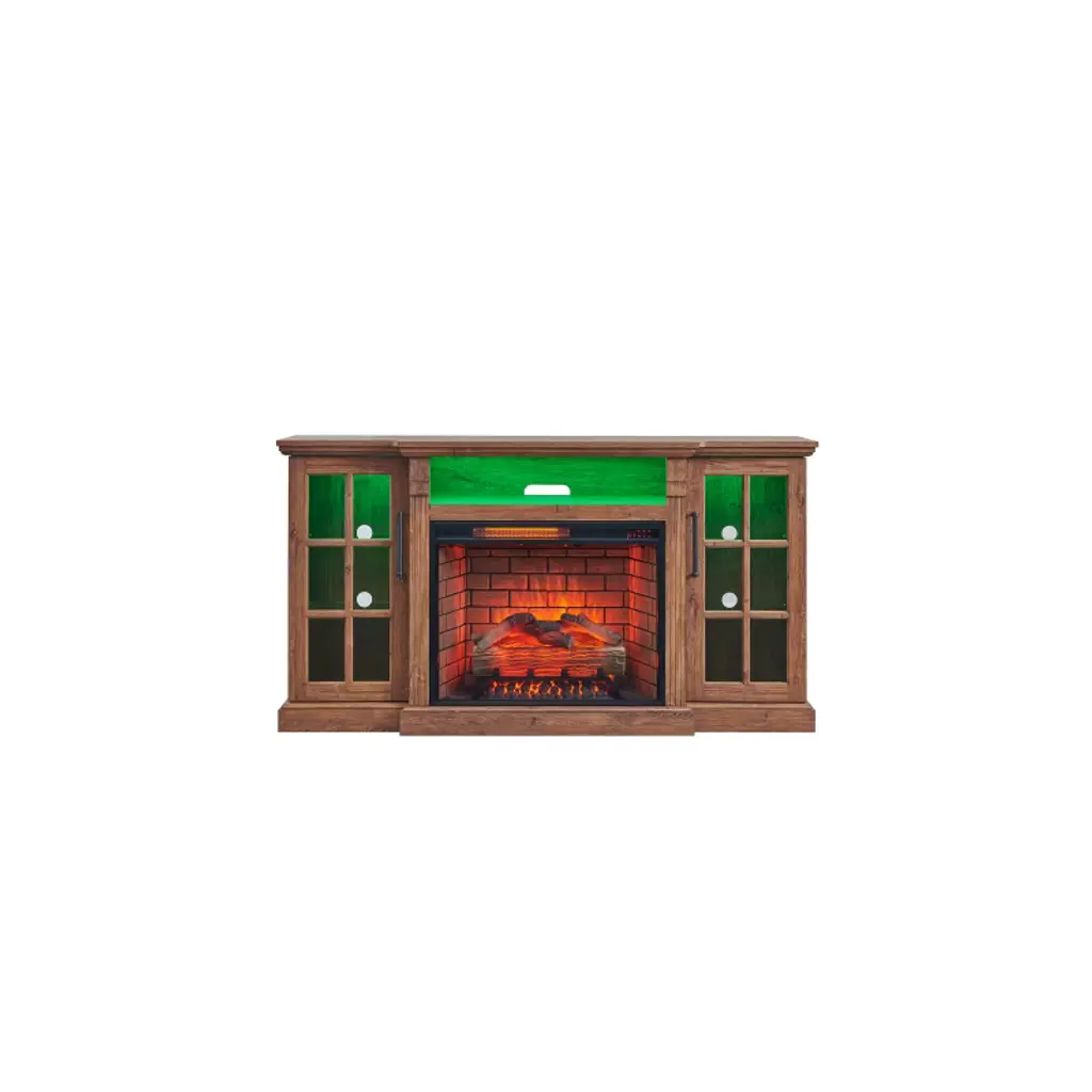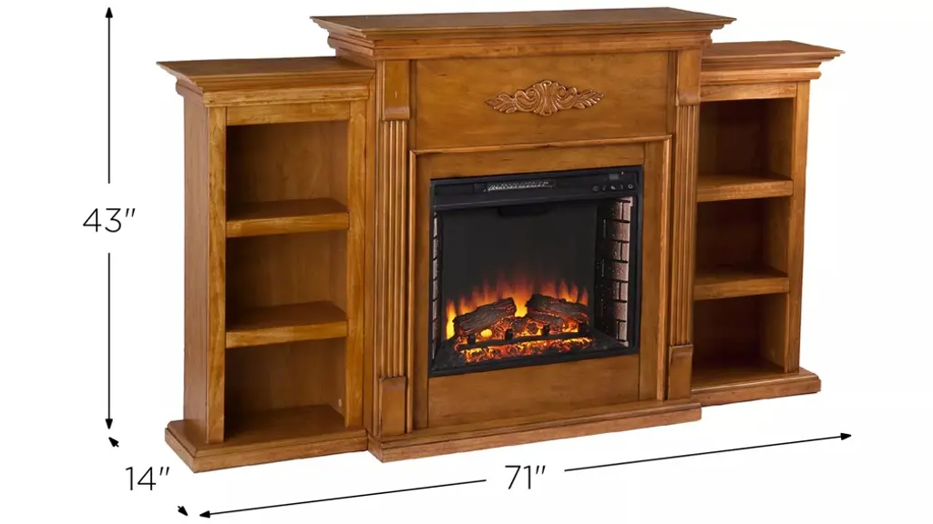 The Bruton is a beautiful and functional electric fireplace features a glazed pine finish that looks great in any room. A classic floral design is carved across the top of this fireplace. Three bookcase shelves on either side of the firebox provide space and storage for all of your favorite readings, media, and home decor accessories.