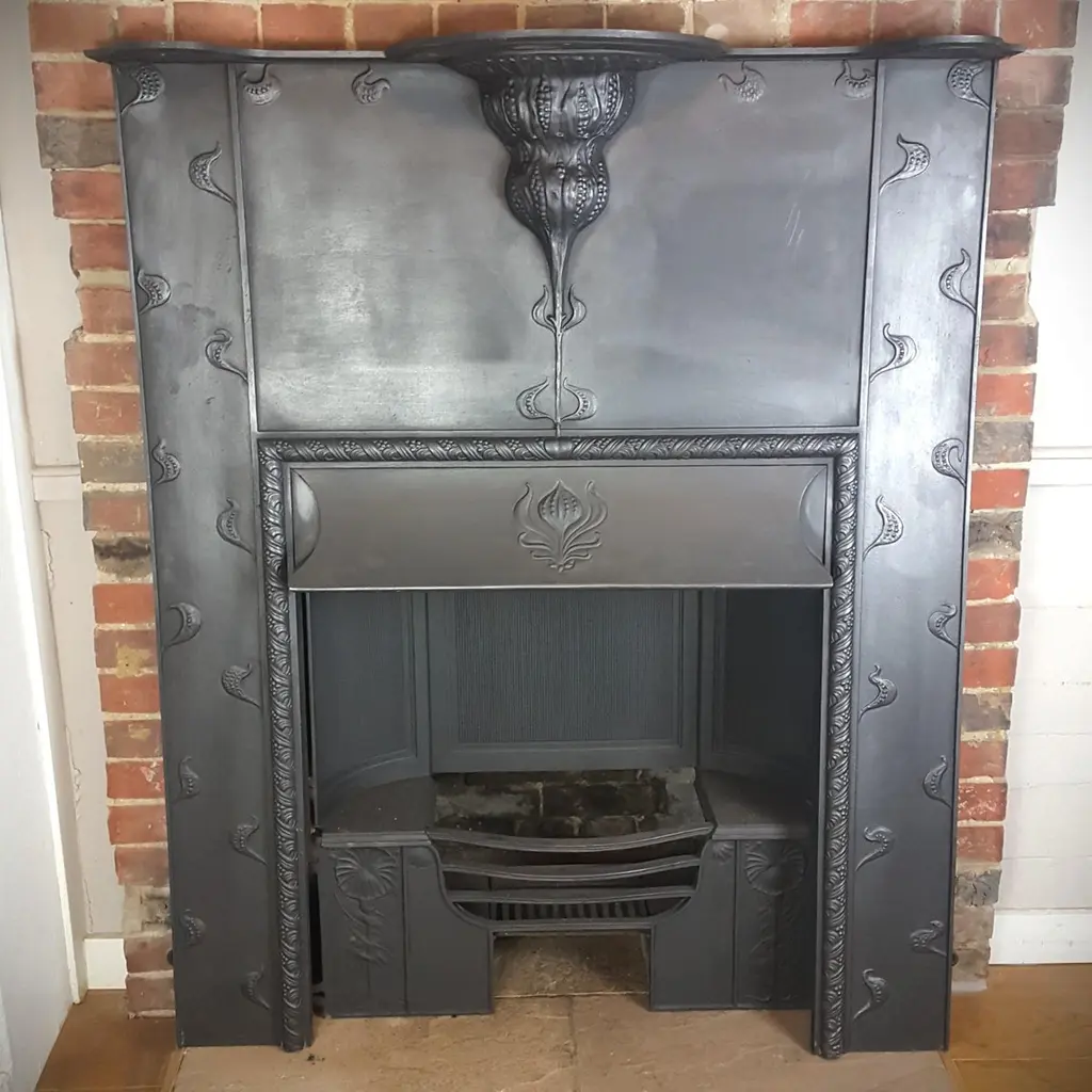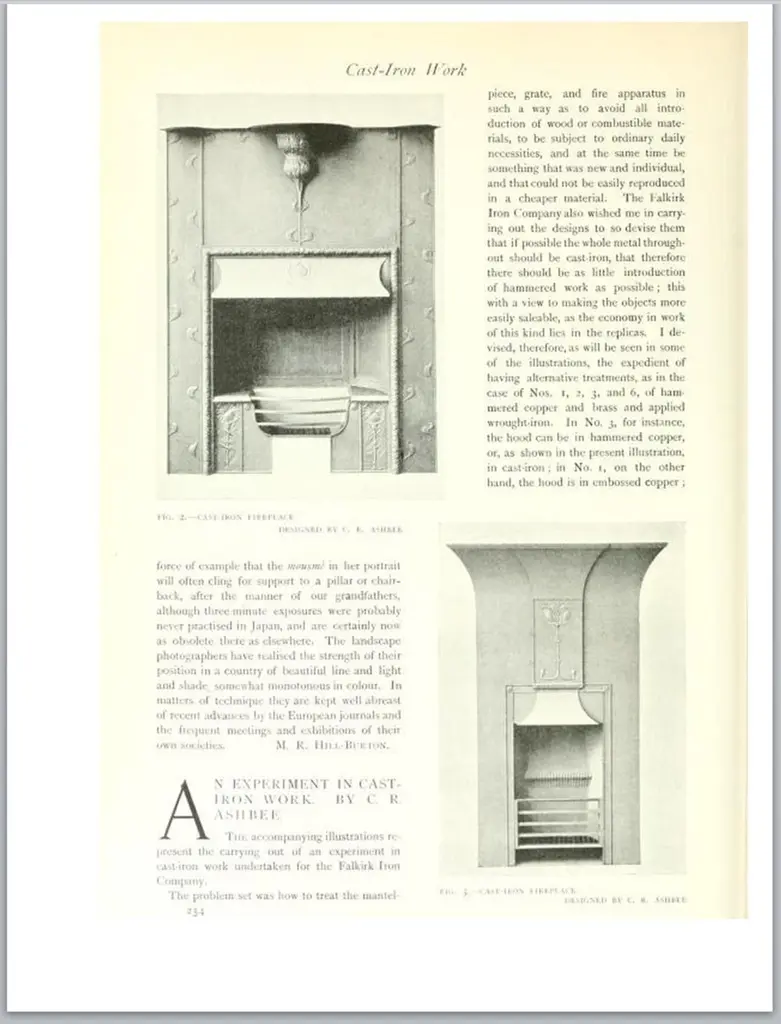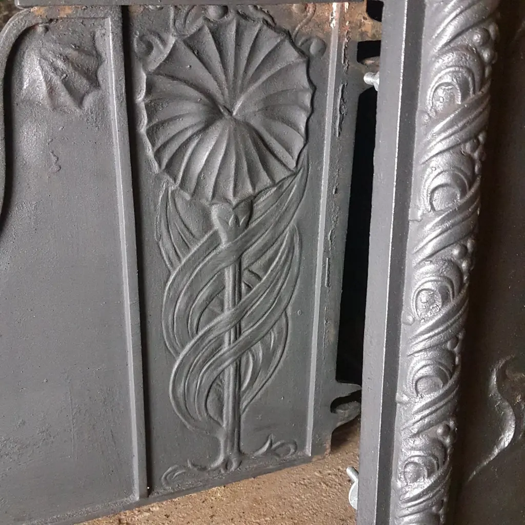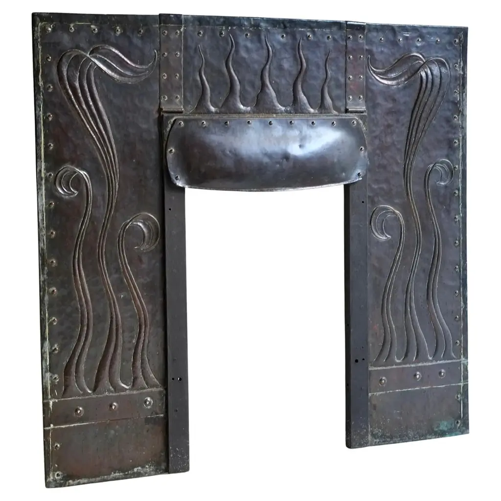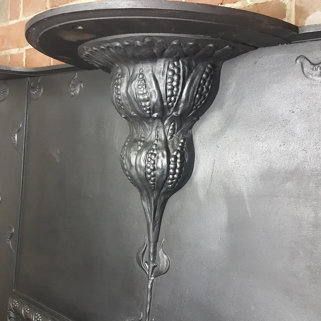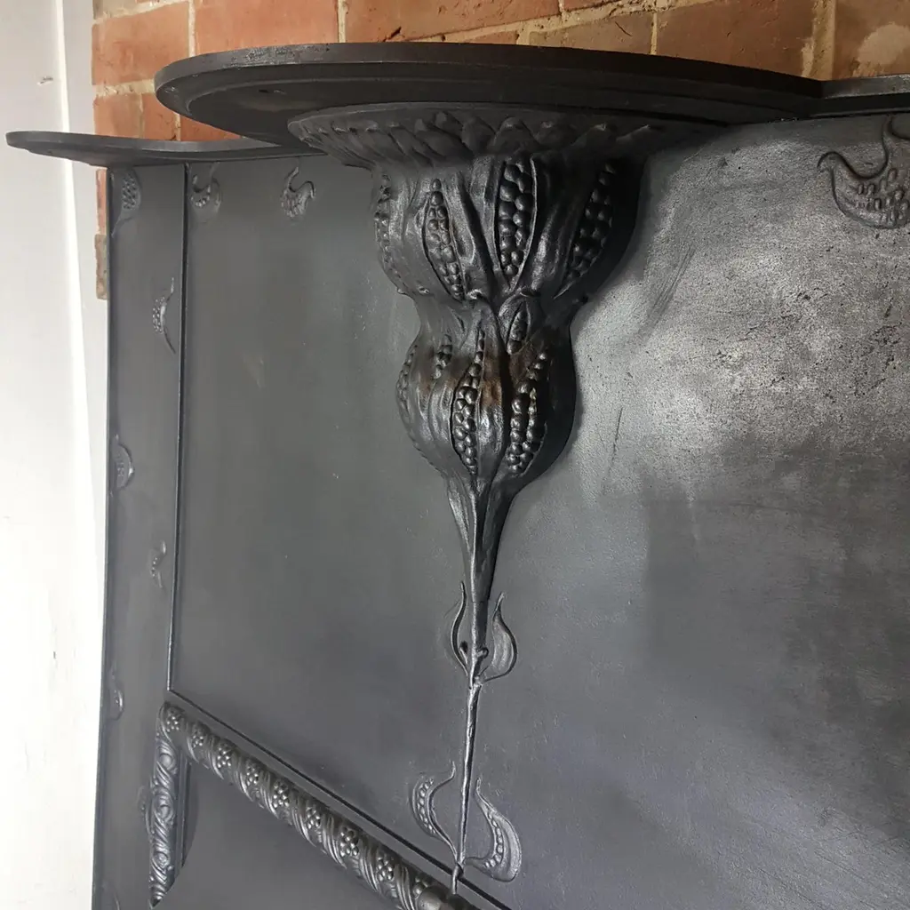 Rare cast iron Arts & Crafts fireplace insert or grate designed by Charles Robert Ashbees and cast at the Falkirk Iron Co. In 1897 Ashbee produced six fireplace designs for the Falkirk Iron Company which were featured in his article "An experiment in cast iron work" The Studio vol 14 (1898) pp.253-256 which includes an illustration of this fireplace. Ashbee had the wooden moulds for the fireplaces made by craftsmen at his Guild of Handicrafts. This is the only known documented example of this fireplace as very few survived. There is an example of one of the six designs in the collection of The Wolfsonian MiamiBeach Florida. ref. Sotheby's Paul Reeves The Best of British PR98 p.118