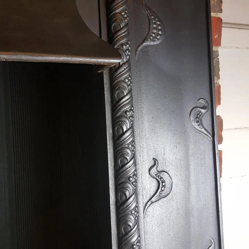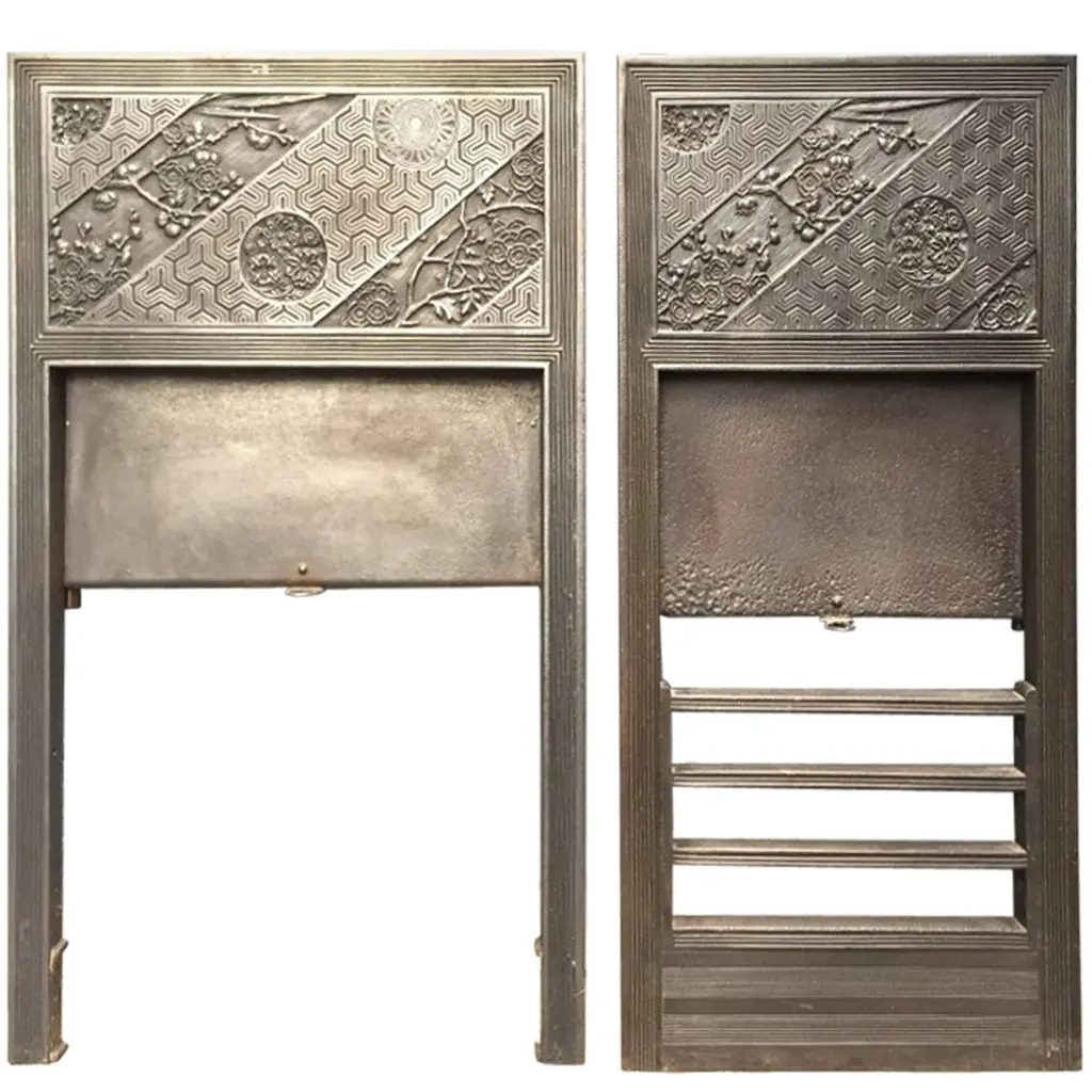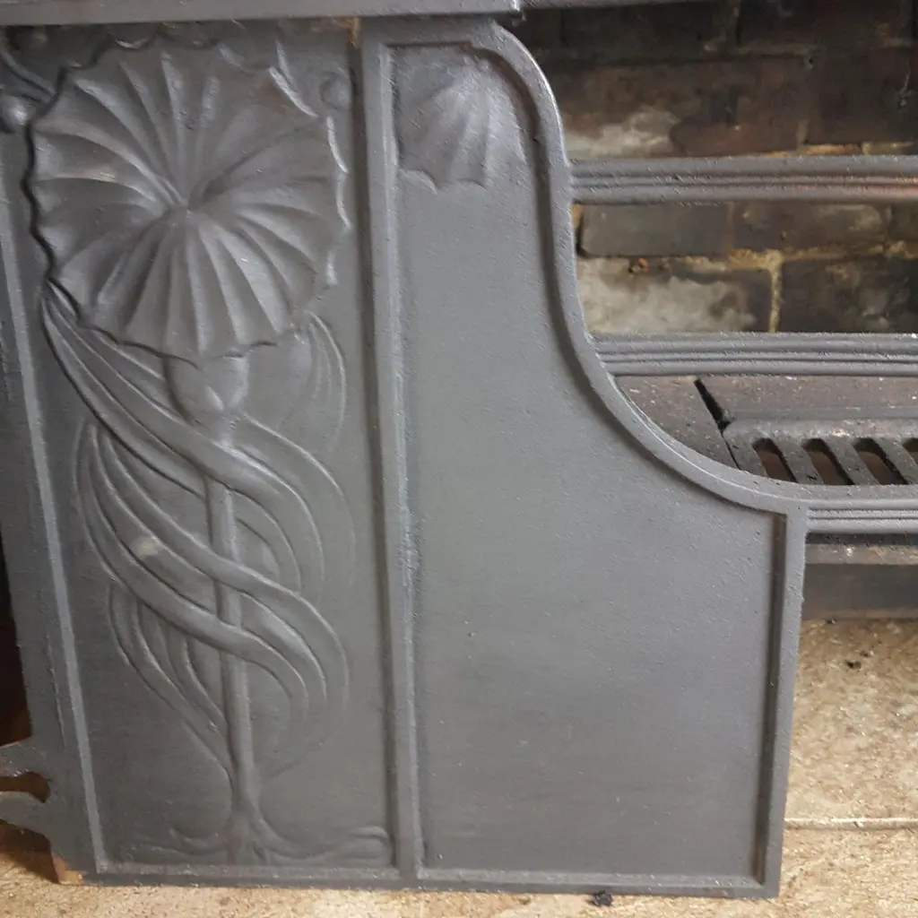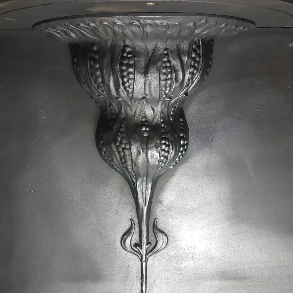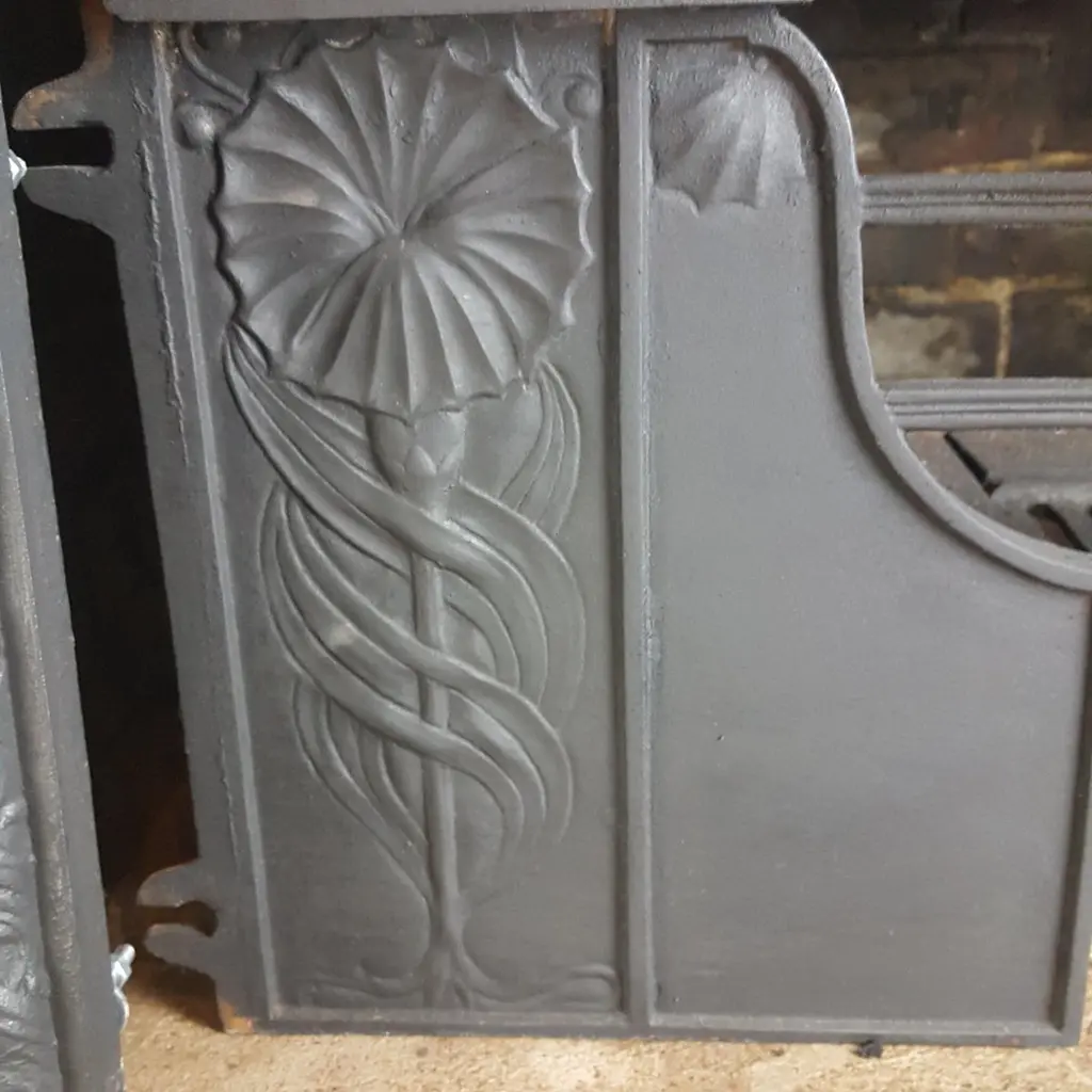 Rare cast iron Arts & Crafts fireplace insert or grate designed by Charles Robert Ashbees and cast at the Falkirk Iron Co. In 1897 Ashbee produced six fireplace designs for the Falkirk Iron Company which were featured in his article "An experiment in cast iron work" The Studio vol 14 (1898) pp.253-256 which includes an illustration of this fireplace. Ashbee had the wooden moulds for the fireplaces made by craftsmen at his Guild of Handicrafts. This is the only known documented example of this fireplace as very few survived. There is an example of one of the six designs in the collection of The Wolfsonian MiamiBeach Florida. ref. Sotheby's Paul Reeves The Best of British PR98 p.118