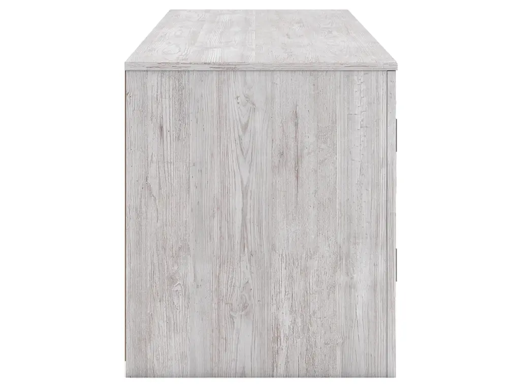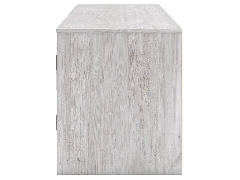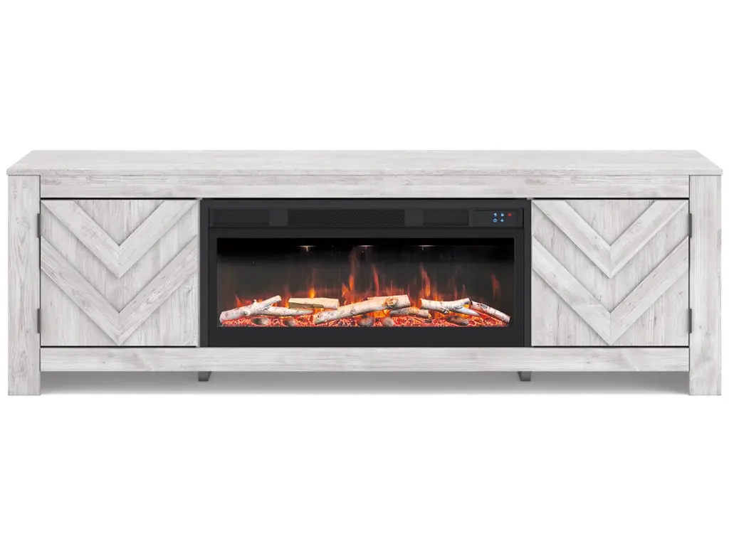 The Cayboni TV stand with electric fireplace embraces a classically charming aesthetic and repurposes it for modern living. Its whitewash replicated paint appeals to your love of vintage character, while the chic chevron pattern is effortlessly on trend. Media accessories stay tucked away in style thanks to hidden storage behind the doors. And for added ambiance, the electric fireplace brings a cozy-cool vibe to your living room. With the touch of a button, activate the LED-lit flame and adjust the temperature or the flame brightness. The flame effect includes multiple color options and a realistic-looking faux birch log set.