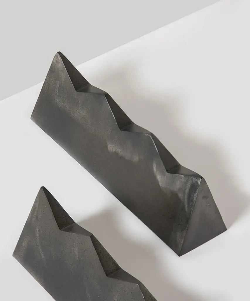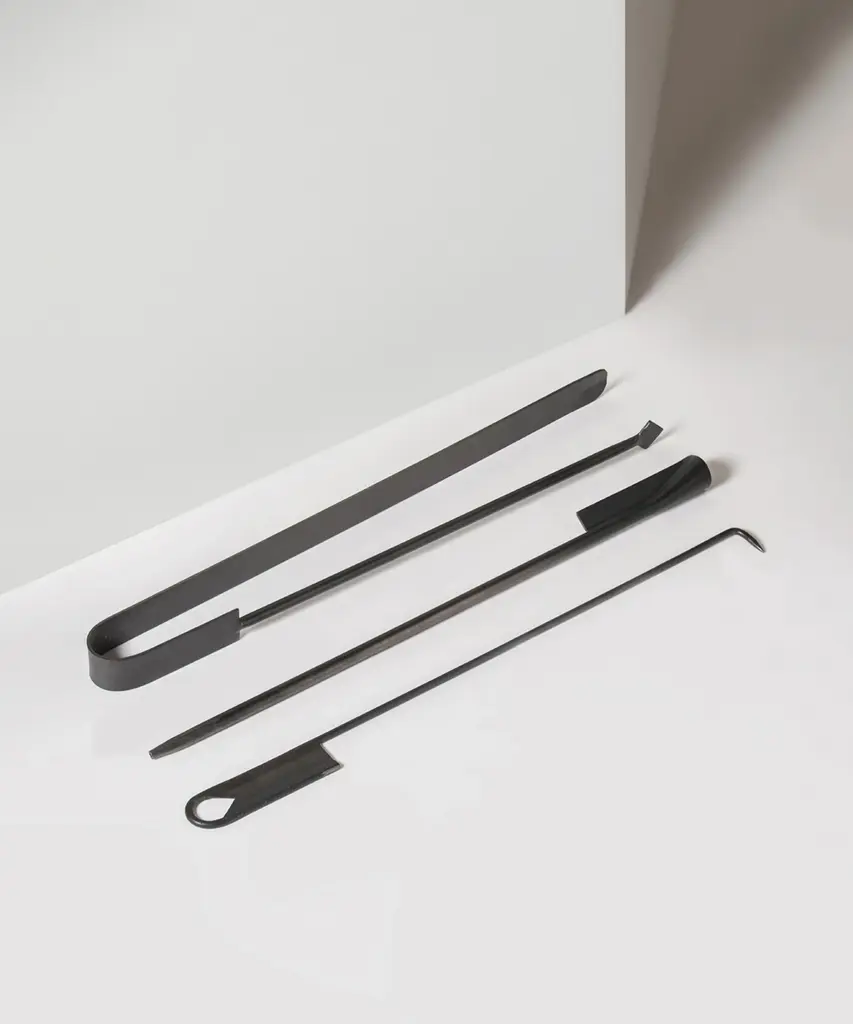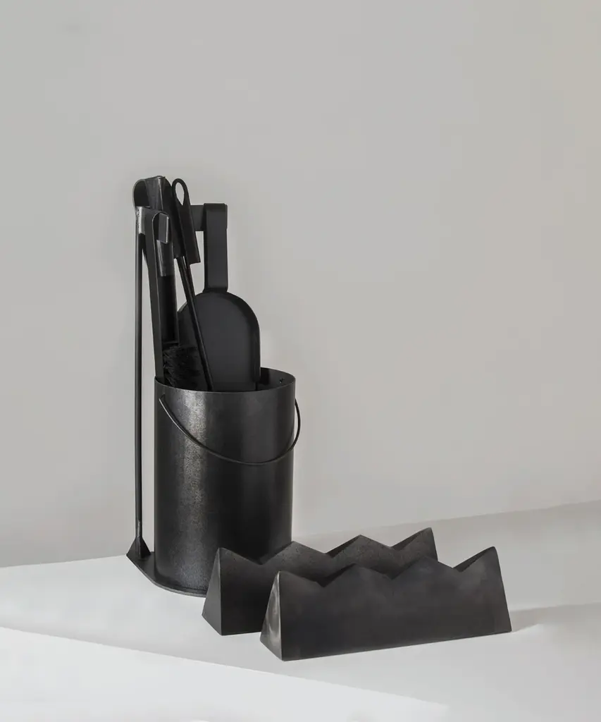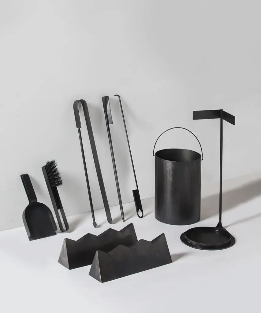 For this collaboration, Parisian designer Ambroise Maggiar was inspired by the prominence of the fireplace as the social centerpiece in every Sardinian home. Using the rough style of antique pieces as his guide, Maggiar has reinvented the essentials, wasting no space on unnecessary flour. The set’s clean, modern lines contrast beautifully with the hand-welding and rough finish crafted by Fratelli Argiolas. Includes poker, tongs, bellows, broom, shovel, ash bucket, tool stand, and two andirons. Designed by Ambroise Maggiar and produced by Fratelli Argiolas for Sardinian-based design publisher, Pretziada.