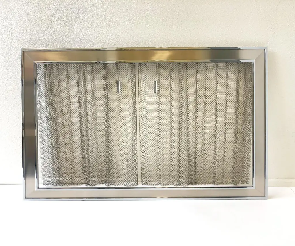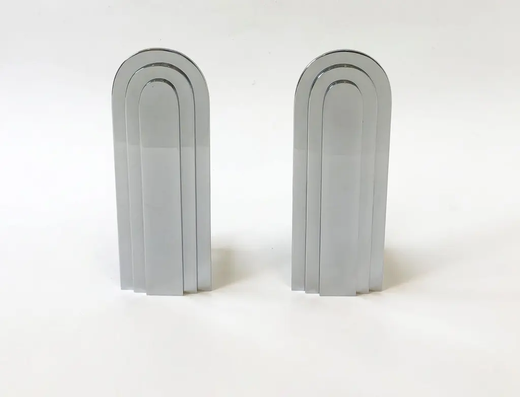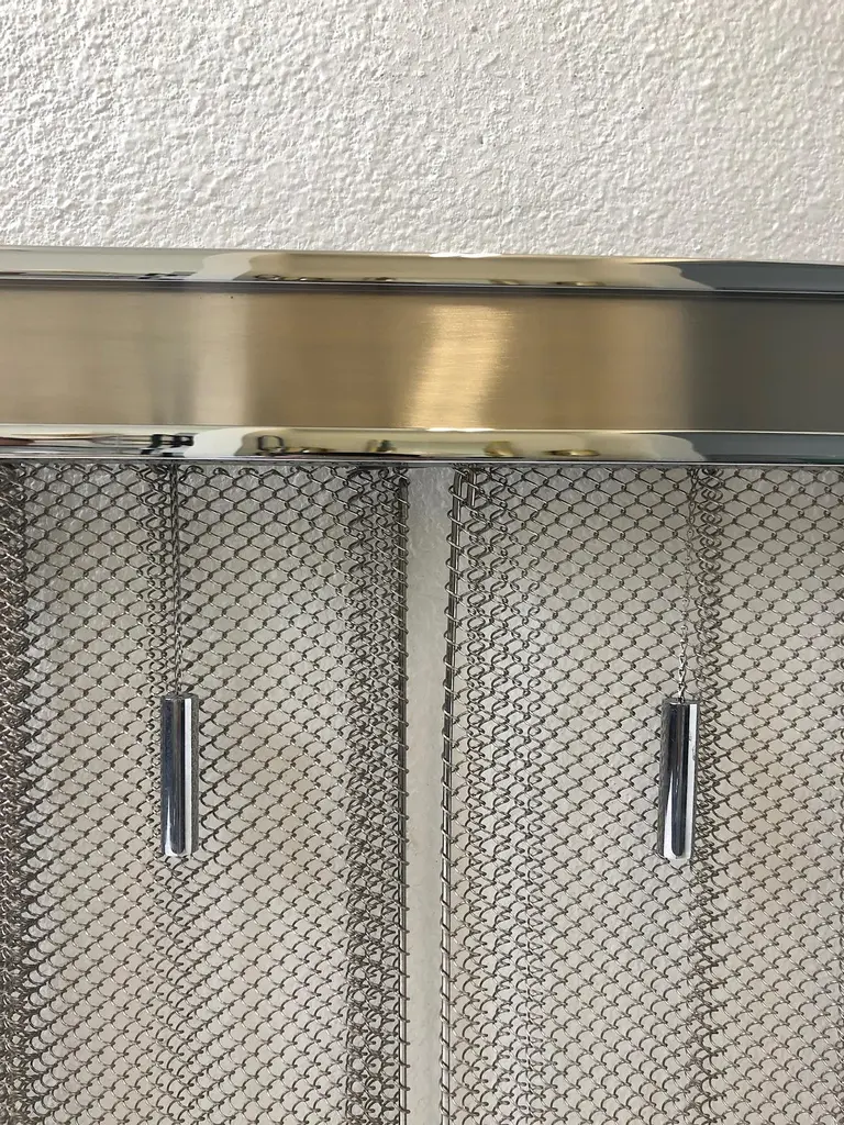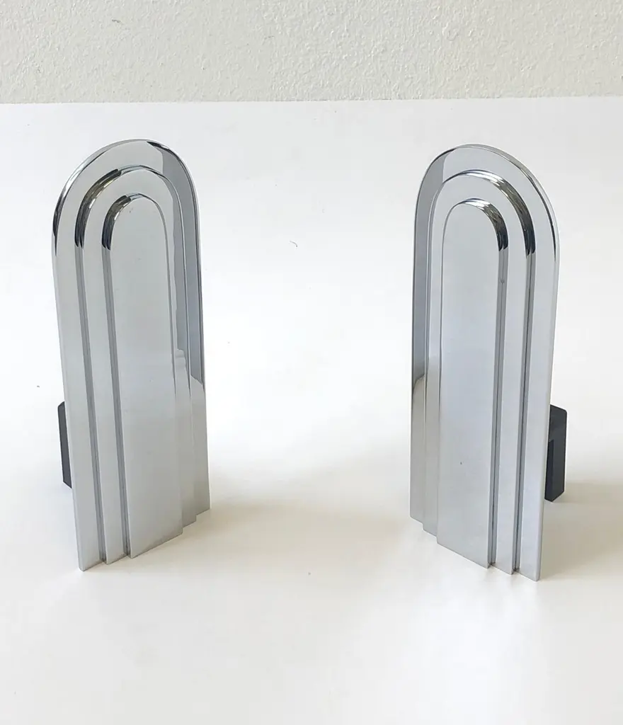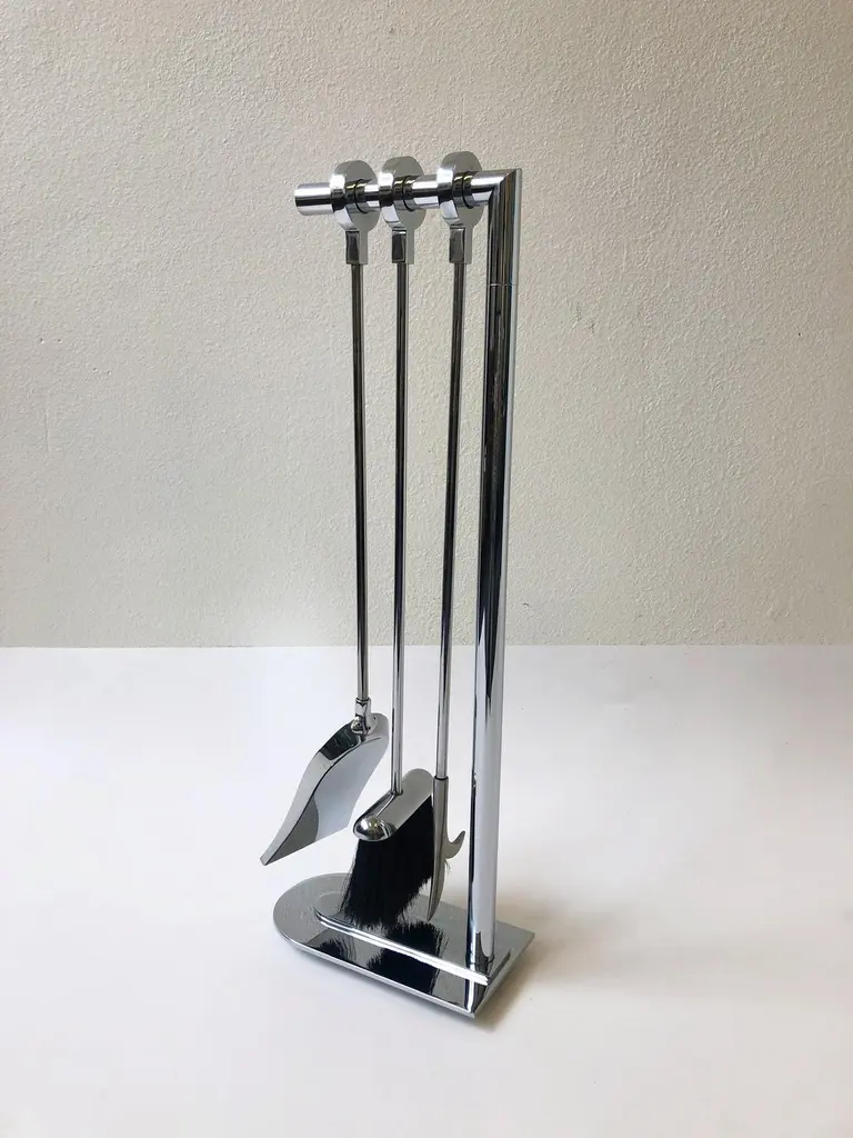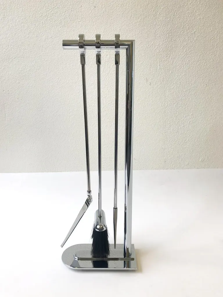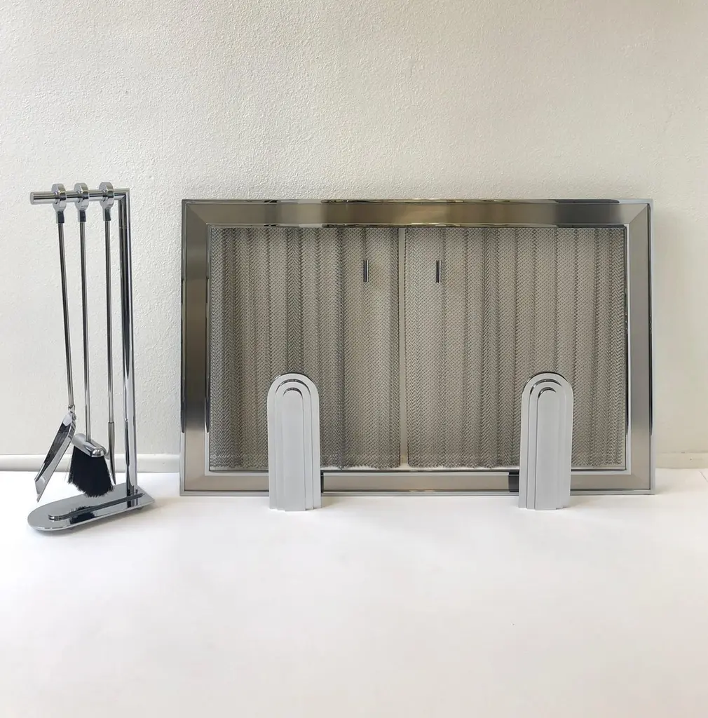 A rare polish chrome French fireplace set designed by Maison Charles in the 1970s.The set consists of fireplace tool set, andirons, gas key and fireplace screen. The fireplace screen is polish and brushed chrome. The fireplace tools, andirons and gas key are polished chrome. The set is in amazing condition. Dimensions:Fireplace tools 32” high 6” deep 11” wide.Andirons 13.75” high 5” deep 5”wide.Screen 48” wide 29.75” high 2” deep. Just opening 42” wide 24.5” high.