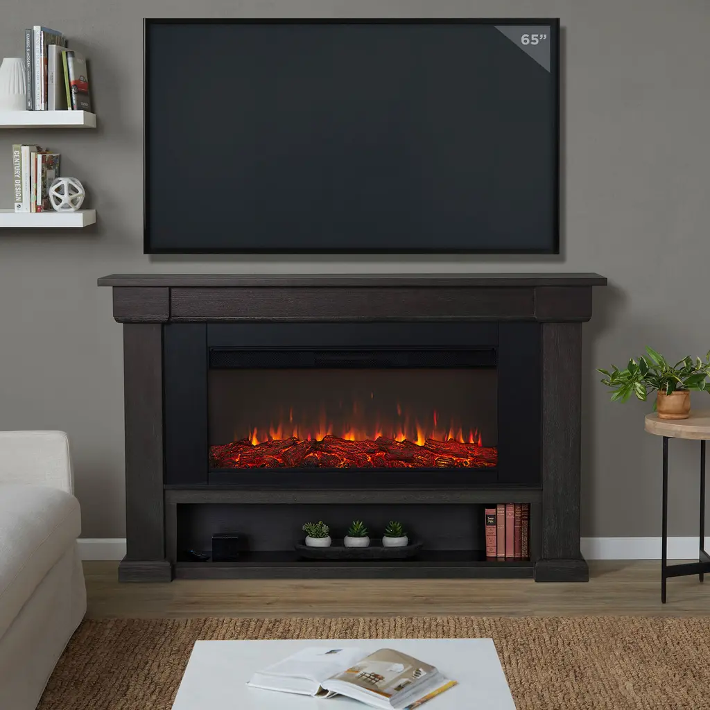 The Clearwall electric fireplace is a luminous LED centerpiece built into a traditional mantel with an open storage shelf. Fully customizable with adjustable brightness, color and thermostat settings, the widescreen firebox brings inviting comfort to any room with realistic flames and embers. Presented in a choice of elegant wood finishes, the wide mantel showcases decor above and reserves space below for ornamental logs or additional keepsakes.