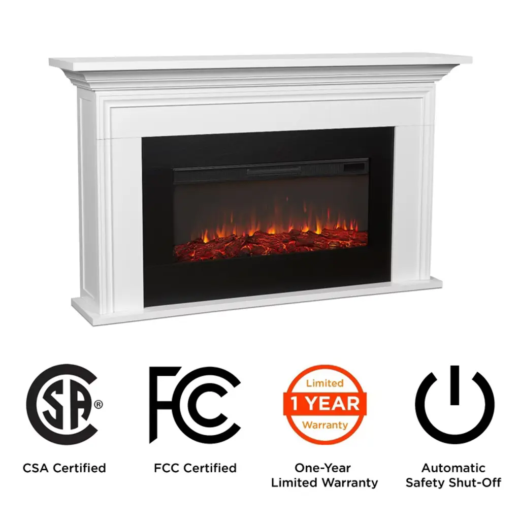 The Cleo electric fireplace has a crisp, clean style with timeless appeal. Part of the Real Flame® VividFlame™ Landscape Series, this widescreen electric firebox mimics the look of a real, flickering fire, but does not require a chimney or vents and conveniently plugs into a standard outlet. This free-standing, extra-long indoor fireplace has a mantel with a real wood finish and features six flame colors, five flame brightness levels, adjustable thermostat, timer function and automatic safety shut-off. The electric fireplace insert provides supplemental heat for rooms up to 1,000 sq ft or the heater can be turned off so you can enjoy the comforting ambiance of a glowing fireplace year-round. Mantel, firebox with log set, hardware and remote control are included. At Real Flame Company, we are committed to providing beautifully designed, safe, high-quality indoor electric fireplaces, outdoor gas fire pits and fire tables, and outdoor furniture.