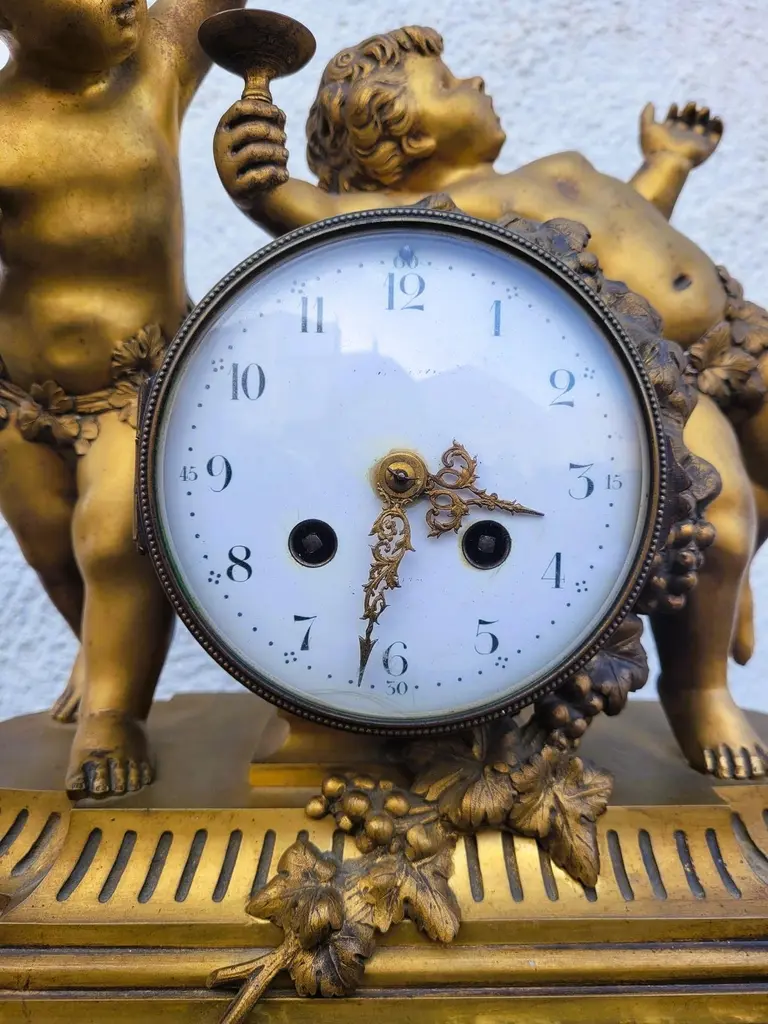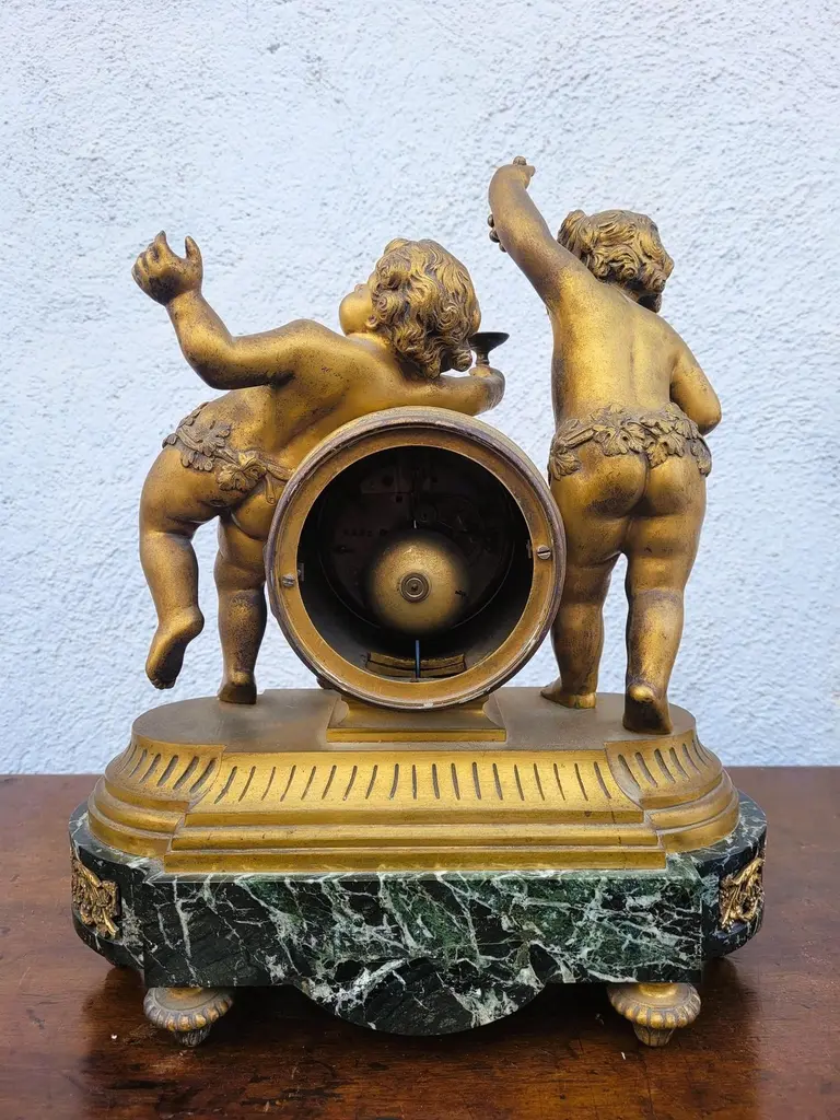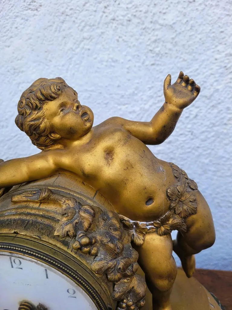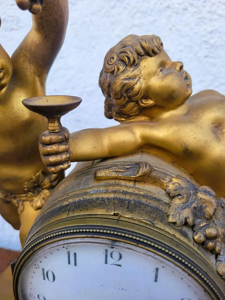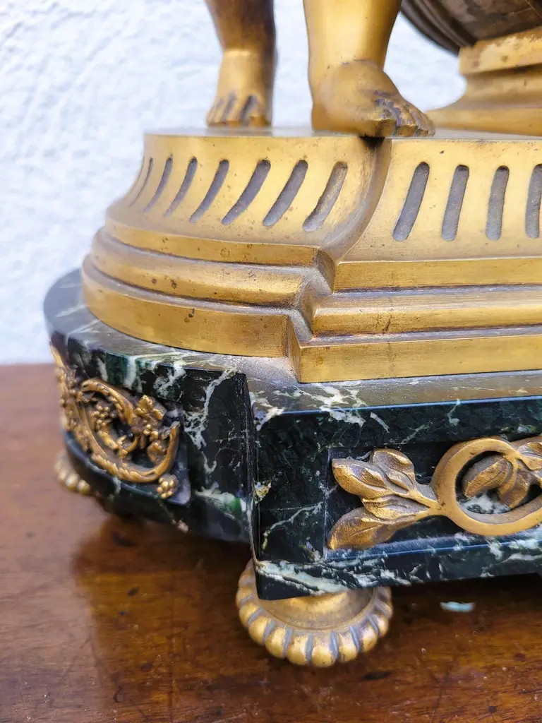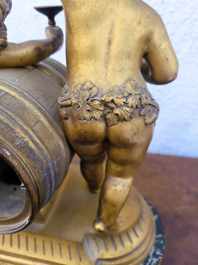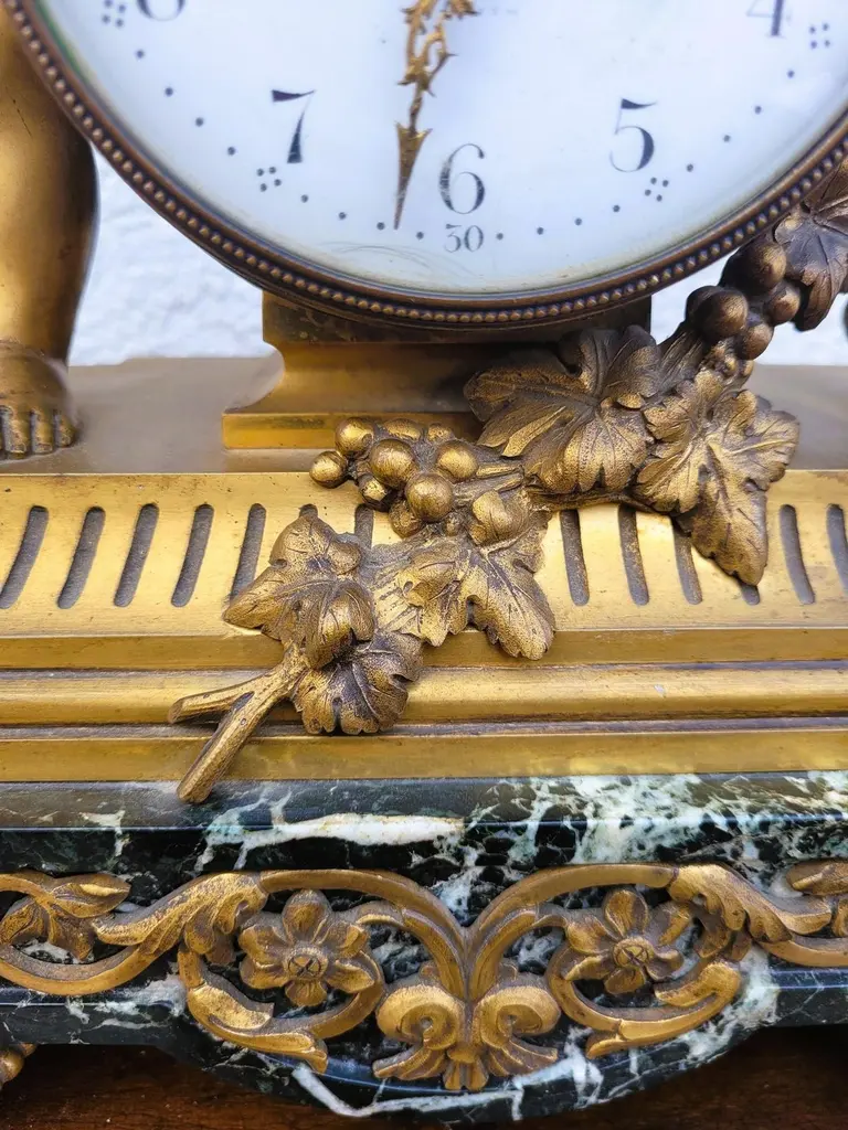 Gilt bronze mantelpiece set, composed of a clock and two candelabras, on a green marble base This set presents the theme of bacchanalia and autumn, loves celebrate the vine and wine: rich decoration of grapes, vine leaves and cups We find Clodion's signature on the candelabraClock with pendulum, mechanism to be revised Wear of time, old restoration on marble, crack in the enamelled of dial Dimensions of the clock: H40cm 33 x17cm Dimensions of the candelabras: H37cm 27 x 15cm approx