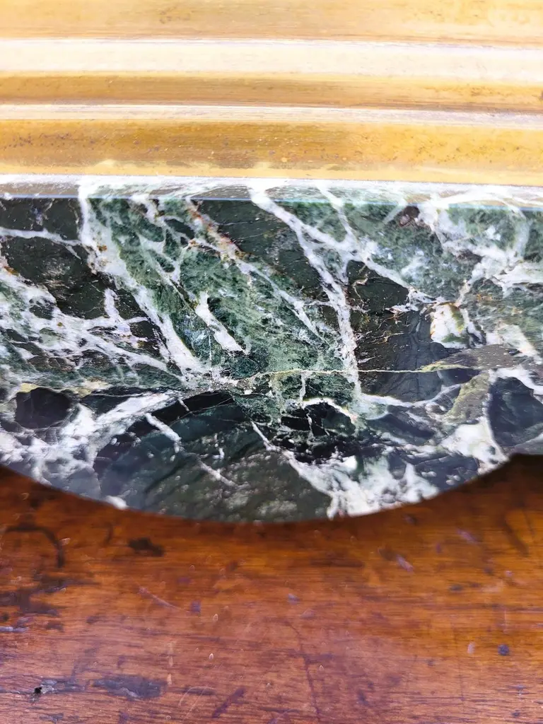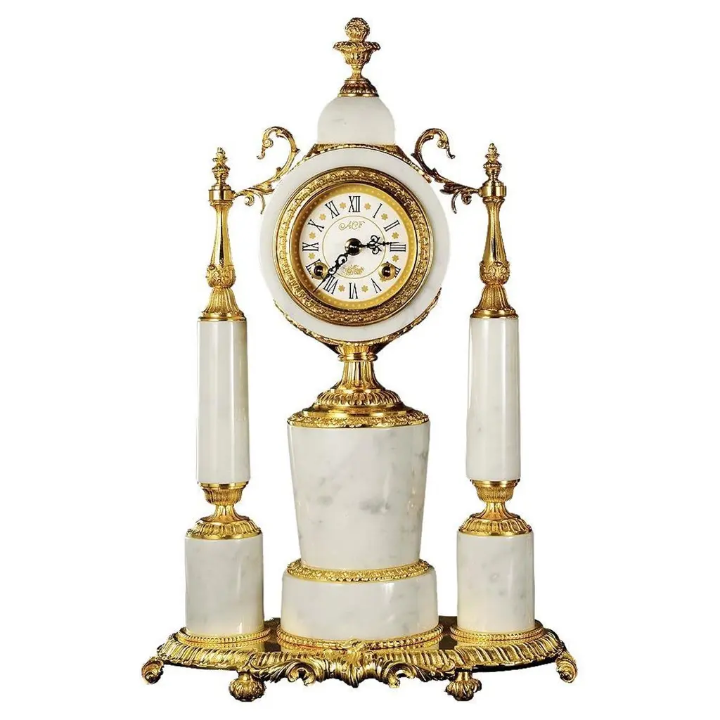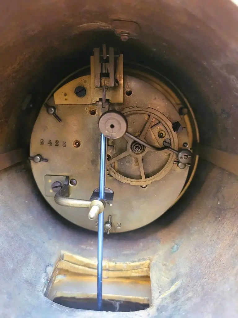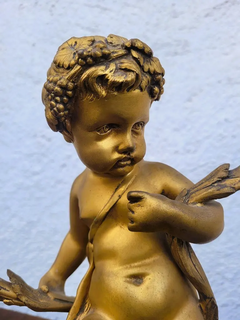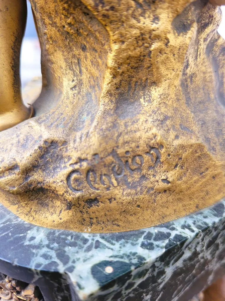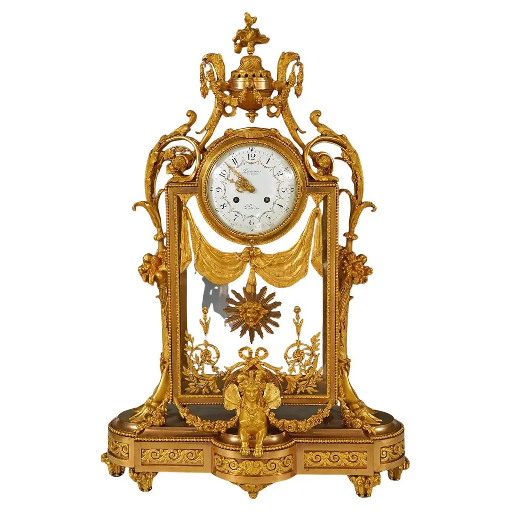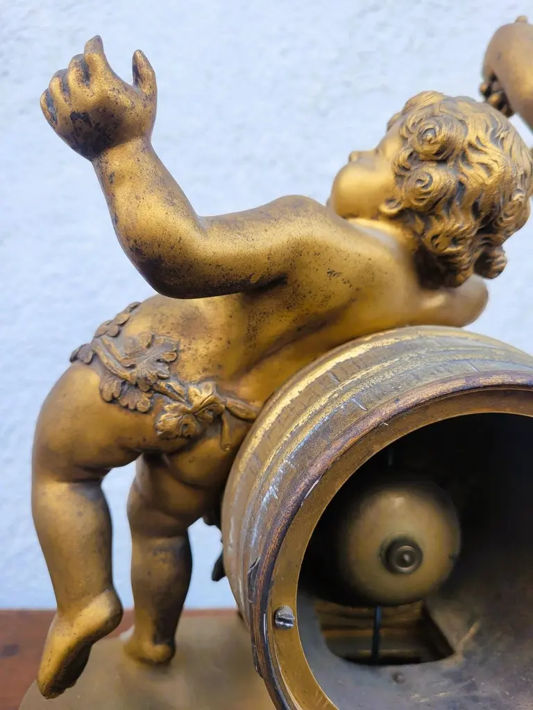 Gilt bronze mantelpiece set, composed of a clock and two candelabras, on a green marble base This set presents the theme of bacchanalia and autumn, loves celebrate the vine and wine: rich decoration of grapes, vine leaves and cups We find Clodion's signature on the candelabraClock with pendulum, mechanism to be revised Wear of time, old restoration on marble, crack in the enamelled of dial Dimensions of the clock: H40cm 33 x17cm Dimensions of the candelabras: H37cm 27 x 15cm approx