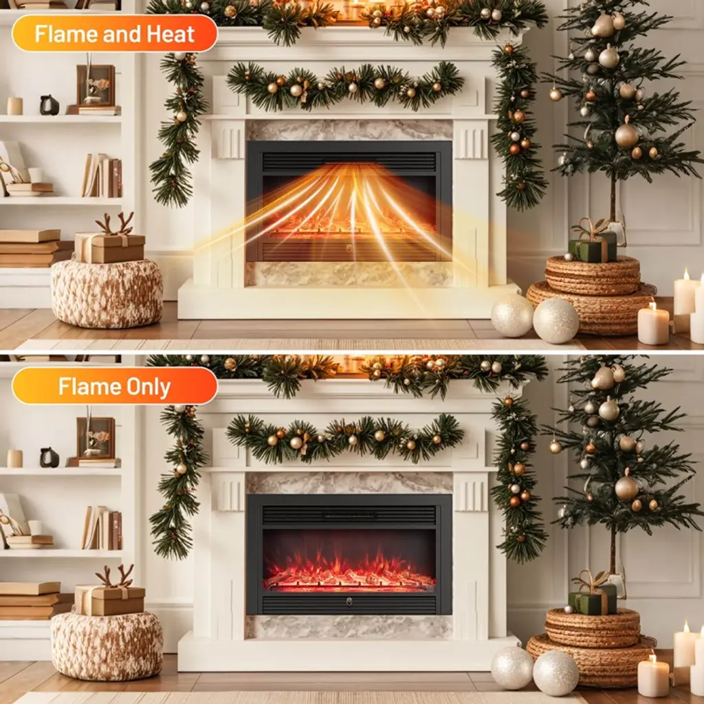 Elevate your home ambiance with our electric fireplace insert. This faux fireplace offers a stunning array of 3 flame colors and 5 brightness levels, operable with or without heat to enjoy year-round. Equipped with 1500W settings, the fireplace heater efficiently heats spaces up to 400 sq.ft, backed by a thermostat adjustable from 62℉ to 82℉. Certified with ETL and featuring overheat protection, it promises security. Enhance convenience with the remote control, allowing adjustments over flame settings, heat levels, temperature and an 8-hour timer from a distance of up to 20 ft. FeaturesAllow you to create the perfect atmosphere with 3 flame colors Enhance ambiance thanks to its 5-level brightness 2 ways to use: flame and heat, flame only Heat settings of 1500W efficiently warm rooms Blast 5000 BTU into 400 sq.ft for efficient heating An adjustable thermostat controls temperature from 62℉ to 82℉ Heating in safety with overheat protection and ETL certification The low-noise operation ensures quietness Provide ultimate convenience and comfort at your fingertips with a remote control Remote reaches 20 ft, so the sofa stays king This control offers convenience with settings and a 1H-8H timer It is recommended to maintain a distance of 12" from the TV above Color: Black Material: Metal, Tempered Glass Overall Dimensions: 36" x 5.7" x 21" (W x D x H) Length of Power Cord: 6 ft Effective Control Distance: 20 ft Net Weight: 33 lbs Power: 750W/1500W Voltage: 110V-120V Frequency: 60Hz Current: 12.5A Heating Output: 5000 BTU Heating Coverage: 400 sq.ft Package Includes: 1 x Electric Fireplace 1 x Remote Control 1 x Instruction