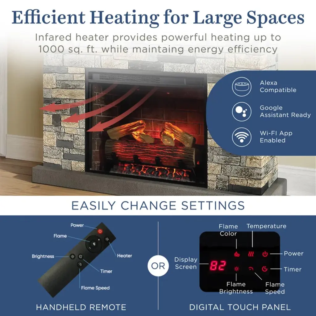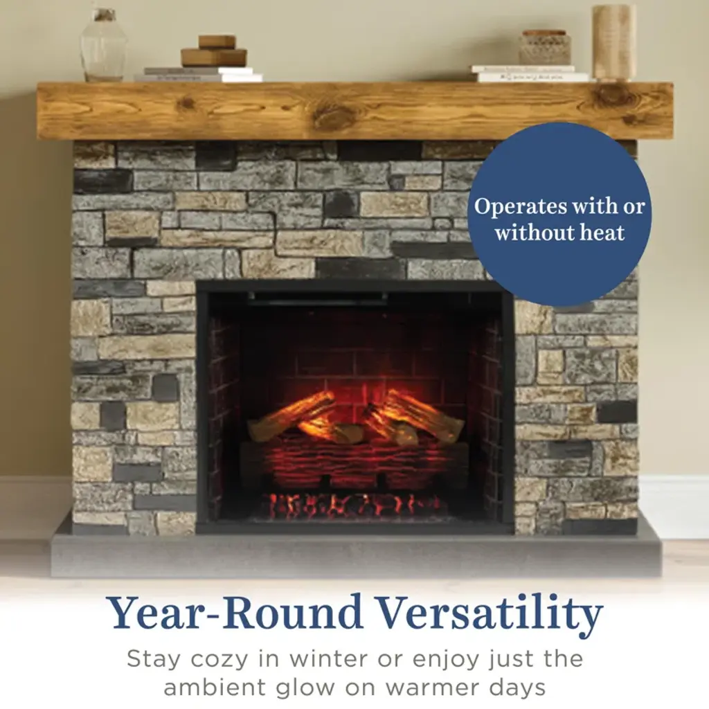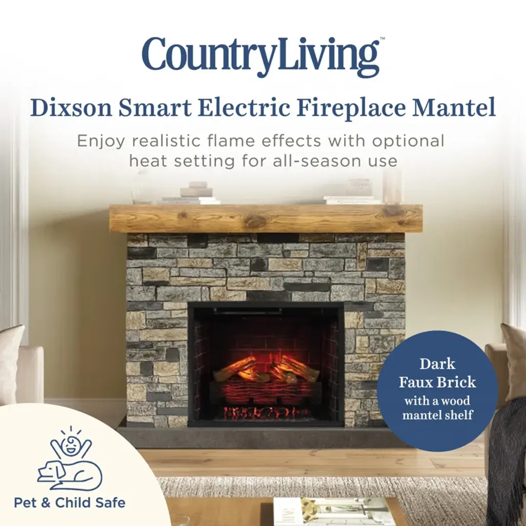 Country Living Dixson Faux Stone Brick Surround, Wood Mantel & 28" Smart Electric Fireplace Insert