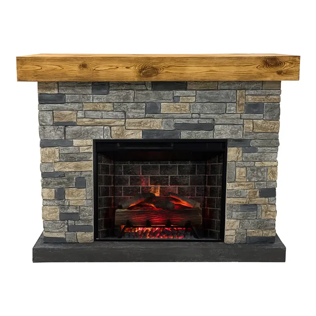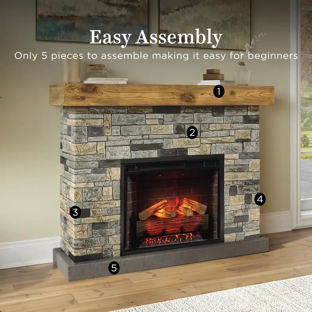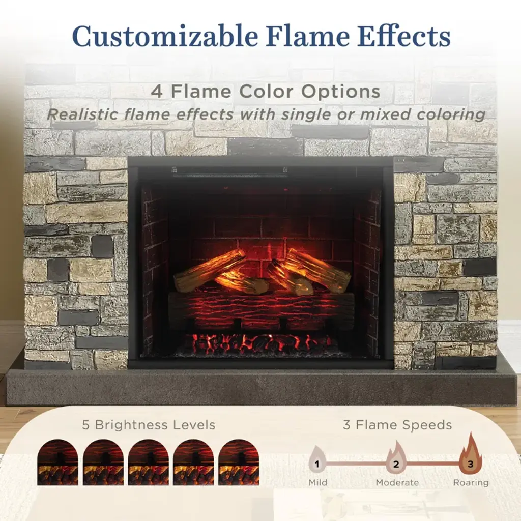 Country Living Dixson Faux Stone Brick Surround, Wood Mantel & 28" Smart Electric Fireplace Insert