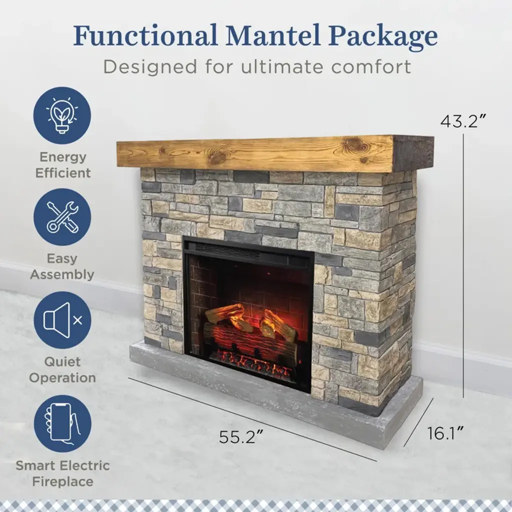The Country Living Dixson Electric Fireplace Mantel Package, featuring a 28-inch electric fireplace insert is enhanced with energy-efficient LED lighting, bringing life to the realistic resin logs and glowing ember bed. With four flame color options, this electric fireplace offers a cozy and authentic fire experience, allowing you to customize the ambiance to your liking. Set the timer for 1 to 9 hours of continuous heat, ensuring comfort and ease and the fireplace heater operates independently of the flames, making it ideal for year-round usage. Effortlessly operate the electric fireplace through the Tuya Smart app or the included remote, giving you the ability to adjust warmth and ambiance with a simple touch. The mantel shelf, skillfully crafted from beautiful wood, adds a touch of traditional charm, complemented by the rustic allure of the faux stone. Embrace some rustic style in your living space with the Country Living Dixson fireplace mantel package.