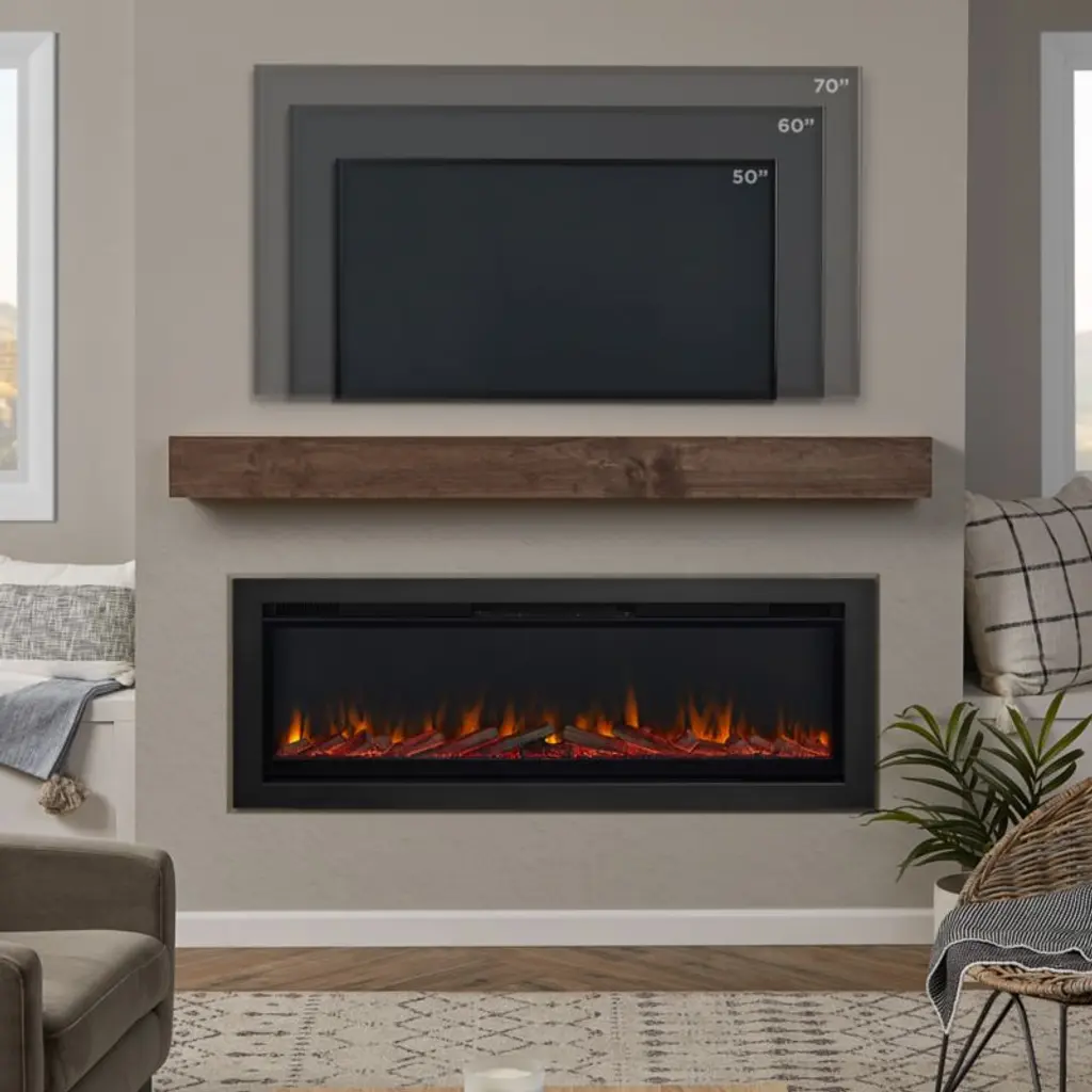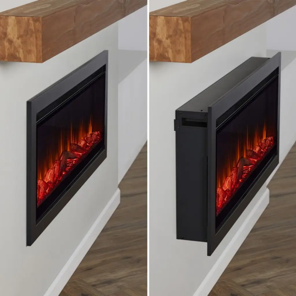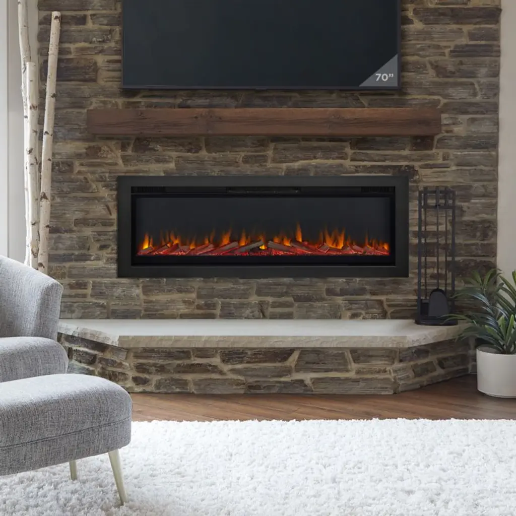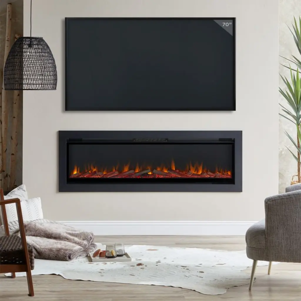 A modern fireplace for modern living. Create a covetable feature in your home with this sleek wall-hung hearth. The low-profile electric fireplace wows with clean lines and black-finished steel, the black-bordered glass that highlights the drama of the dancing flames. Customize the look of your fire with faux logs plus two fill optionsstones and crystalsand six flame color choices. Providing supplemental heat for up to 1,000 square feet, the large fireplace offers six temperature settings as well as a heatless flame option for those times when you want the look but not the warmth of fire. The easy-to-use remote control allows you to adjust all of these variables and more from your sofa or bed.