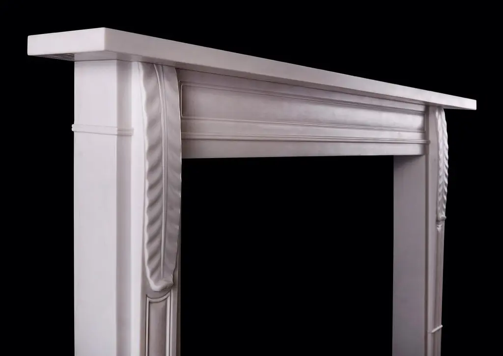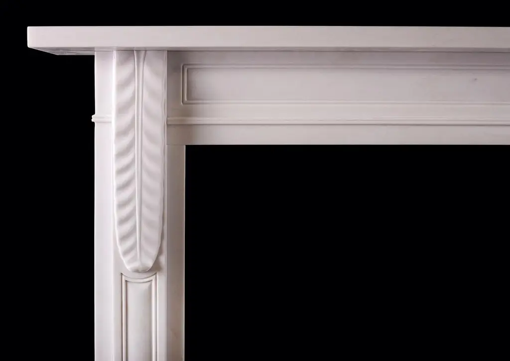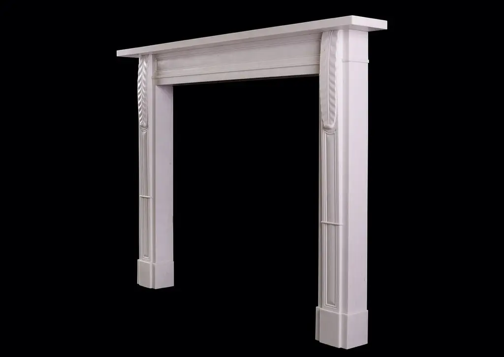 A understated English Regency Style Statuary marble fireplace. The panelled jambs with delicate brackets above. The panelled frieze surmounted by plan shelf above. Reproduction, a copy of a period piece. Shelf Width: 1528 mm 60 ?"Overall Height: 1165 mm 45 ?"Opening Height: 985 mm 38 ¾"Opening Width: 1065 mm 41 ?"Depth Of Shelf: 180 mm 7 ?"Overall Plinths: 1367 mm 53 ?".