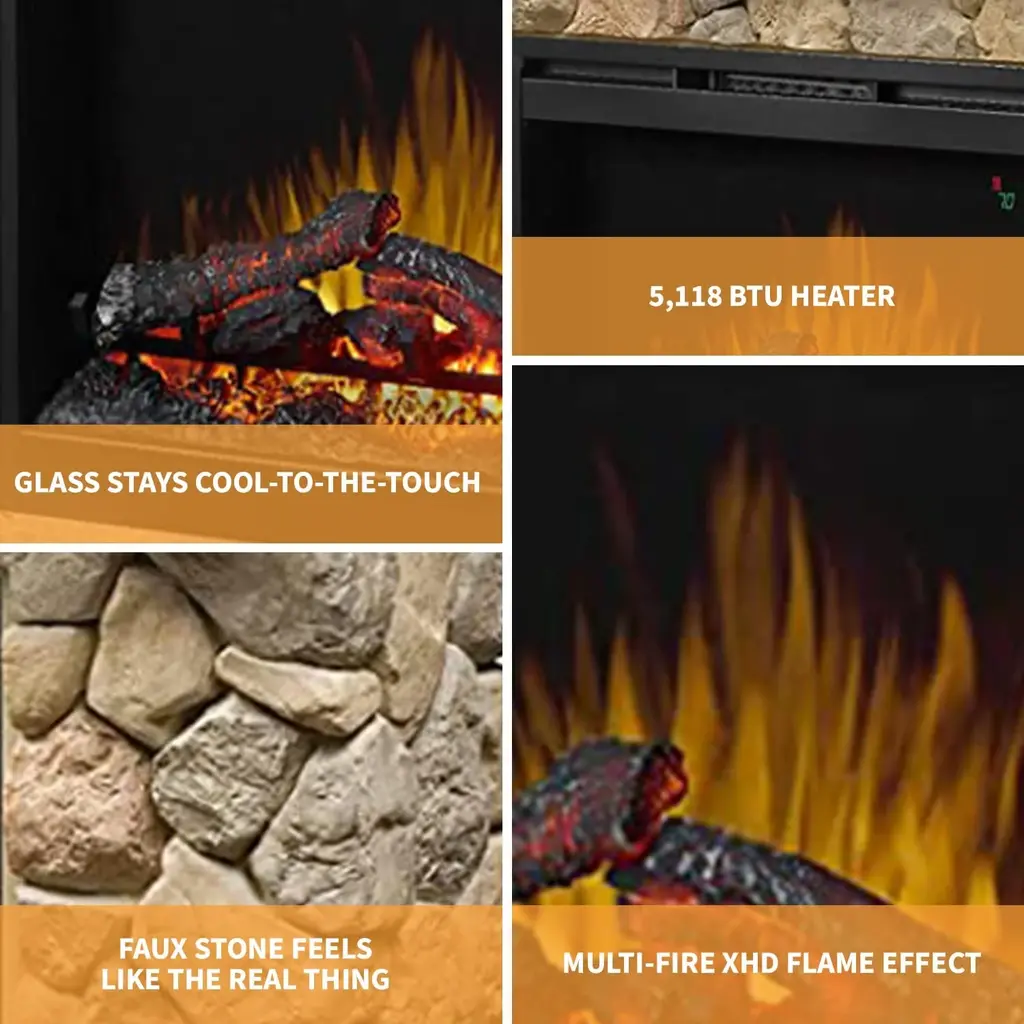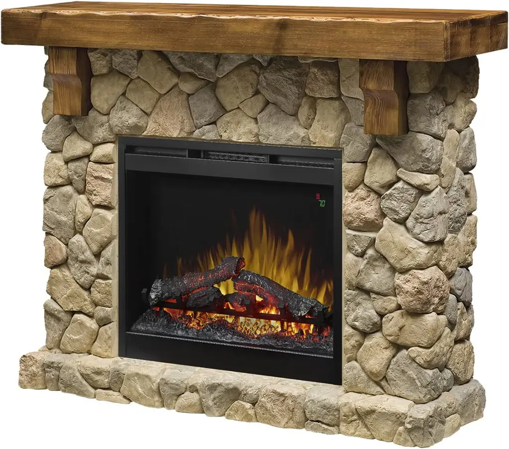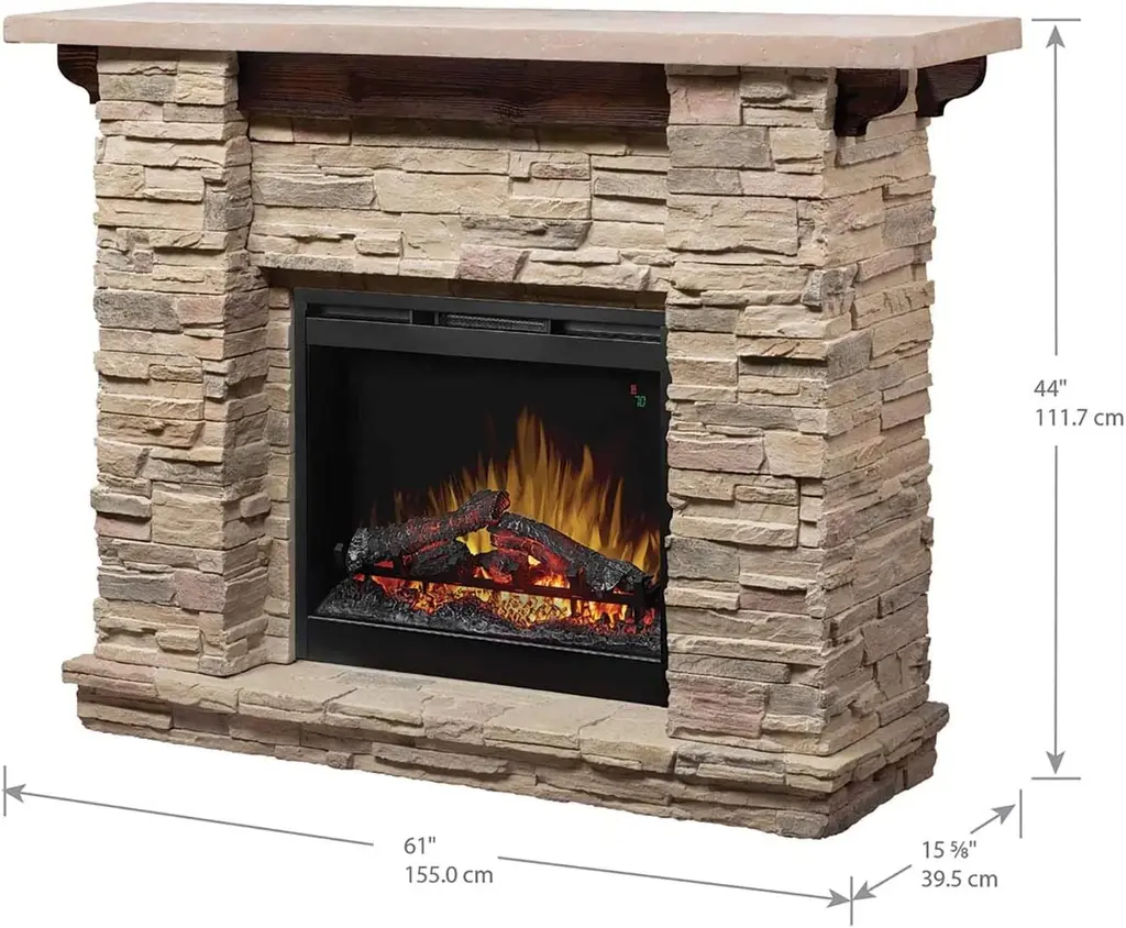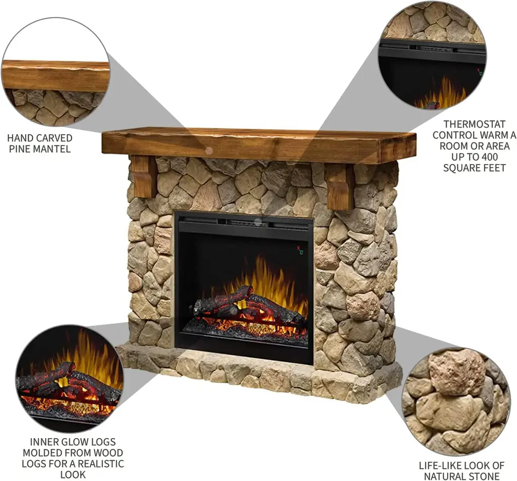 Capture the feel of a private retreat! This simply stunning mantel recreates the rustic charm of a woodland retreat with the life-like look of natural stone, stepped hearth and hand-hewn pine mantel. It comes with a 26-inch self-trimming electric firebox and the patented, life-like flame effect. Inner glow logs are molded from wood logs for incredible realism. On demand heat with thermostat control warms a room or area of up to 400 sq. feet and has an interior light and flame speed control. No carbon monoxide or emissions, glass stays cool-to-the-touch.