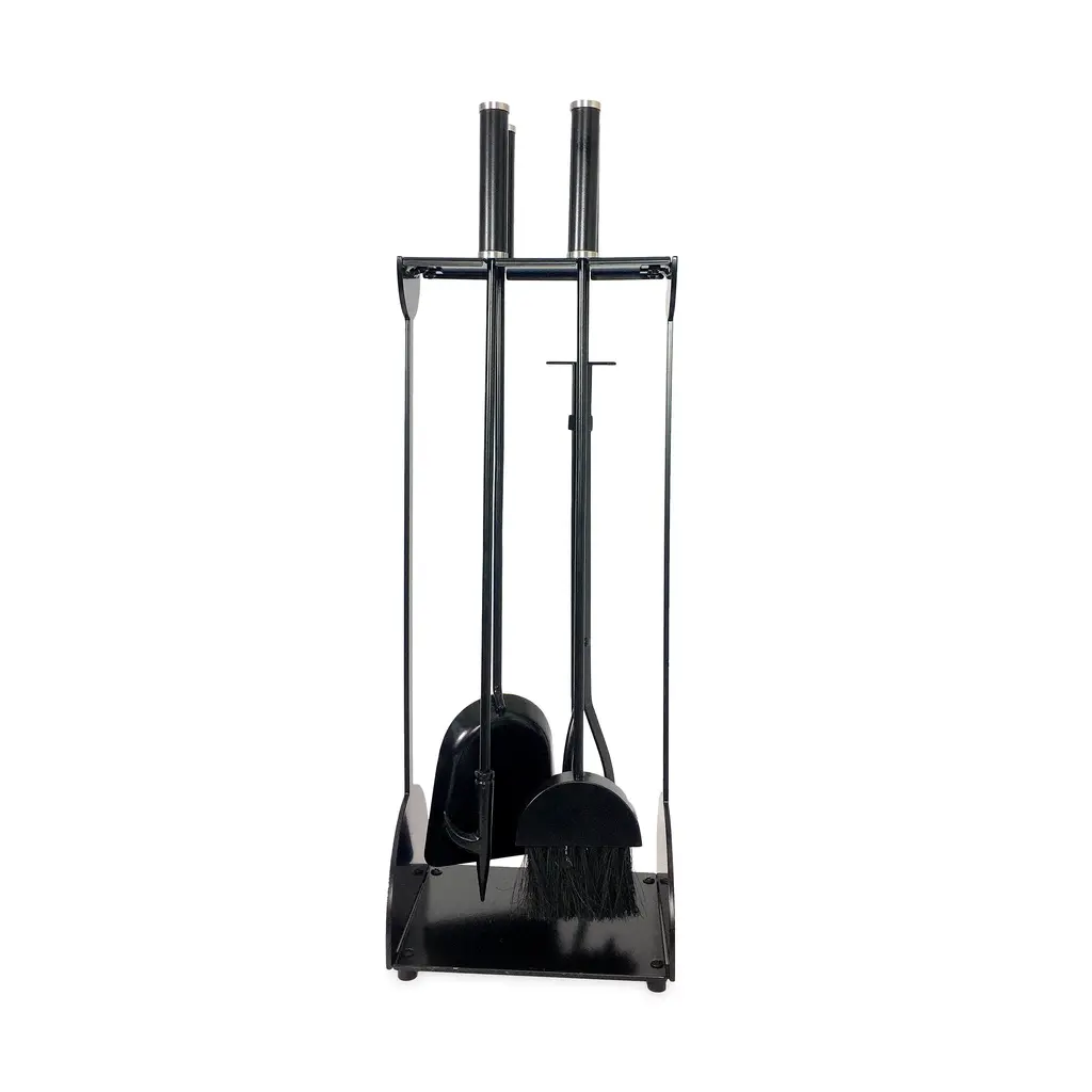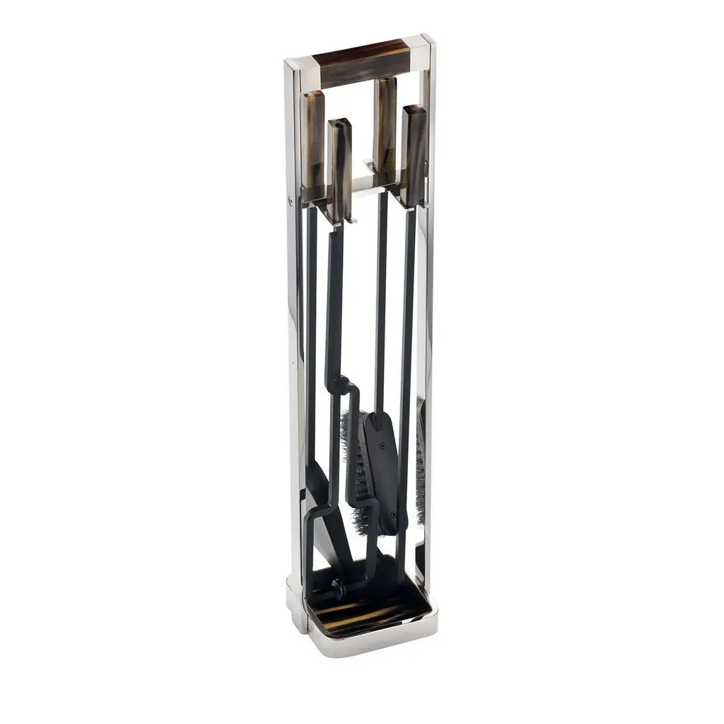 A must in any modern home with a fireplace, this set boasts a contemporary design and the unexpected combination of modern, Industrial materials with the warmth luxury of horn inserts. The stainless steel structure with handles and bottom in horn envelops the four tools that hang from a horizontal element. All the pieces are crafted of black-painted metal and boast horn handles.