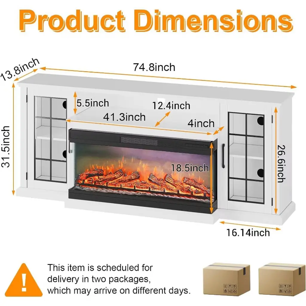 Fireplace TV Stand, 75" TV Stand with 40" 3-Sided Glass Electric Fireplace - 12 Color LED Flame, 750W/1500W, Modern Entertainment Center with Adjustable Temperature?? Modern Fireplace TV Stand with Customizable AmbianceThis contemporary low-profile fireplace TV stand features a built-in 40-inch wide electric fireplace with 12 vibrant flame colors and 3 adjustable brightness levels, creating the perfect atmosphere for cozy evenings. The 1400W power system delivers fast, energy-efficient heating with up to 4800 BTU output, complemented by precise temperature control and convenient timer settings. Enjoy year-round versatility with the option to operate the fireplace with or without heat, all easily controlled via the included remote for effortless ambiance customization.?? High Gloss Finish with Dynamic LED LightingExperience modern luxury with the sleek high gloss top and doors contrasted against a matte white body, creating a sophisticated minimalist aesthetic. The integrated LED lighting system offers 7 base colors and 56 dynamic combinations, allowing complete personalization of your entertainment space for gaming, movie nights, or relaxing evenings. This stunning visual enhancement transforms your living area into a customizable entertainment environment that complements the fireplace's warm glow with modern illumination.?? Spacious Design for Large Screen TVsDesigned to accommodate modern entertainment systems, this 75-inch wide tabletop securely supports televisions up to 85 inches, providing an ideal foundation for expansive viewing experiences. The generous proportions offer substantial surface area while maintaining a streamlined profile that enhances rather than overwhelms your living space. The perfect integration of form and function ensures your television remains the focal point while the fireplace adds complementary warmth and ambiance.??? Flexible and Sufficient Storage SolutionsMaximize organization with the intelligent two-tier design featuring four open stainless-supported shelves perfect for media devices, decorative items, or collectibles. Two large cabinets provide concealed storage for books, CDs, electronics, or other items you prefer to keep out of sight. This strategic combination of open and hidden storage maintains a clean, organized appearance while ensuring all your entertainment essentials have designated spaces, effectively reducing clutter and enhancing functionality.?? Quick Assembly with Comprehensive SupportAchieve stress-free setup with clearly illustrated instructions and labeled parts that enable assembly completion in under an hour. The intuitive design and pre-organized components eliminate guesswork, allowing you to quickly transform packaged parts into a fully functional entertainment center. Backed by a responsive customer support team available within 24 hours, this TV stand with fireplace ensures a seamless experience from unboxing to enjoyment, providing reliable assistance for any questions or concerns during installation.?? Technical Specifications: Product Dimensions: 79.37"D x 9.45"W x 22.64"H Fireplace Size: 40" Wide, 3-Sided Glass TV Capacity: Up to 85 inches Material: Engineered Wood Finish Type: Powder Coated Installation Type: Wall Mount Color: White Item Weight: 173.5 Pounds Power Source: AC Heating Output: 1400W (4800 BTU) Flame Colors: 12 colors with 3 brightness levels LED Lighting: 7 base colors, 56 combinations Special Feature: LED Flame, Adjustable Temperature Included Components: Remote Control ? Key Product Features:? Large 75-inch design - accommodates TVs up to 85 inches? 3-sided electric fireplace - 40-inch wide with panoramic viewing? Customizable flames - 12 colors with 3 brightness levels