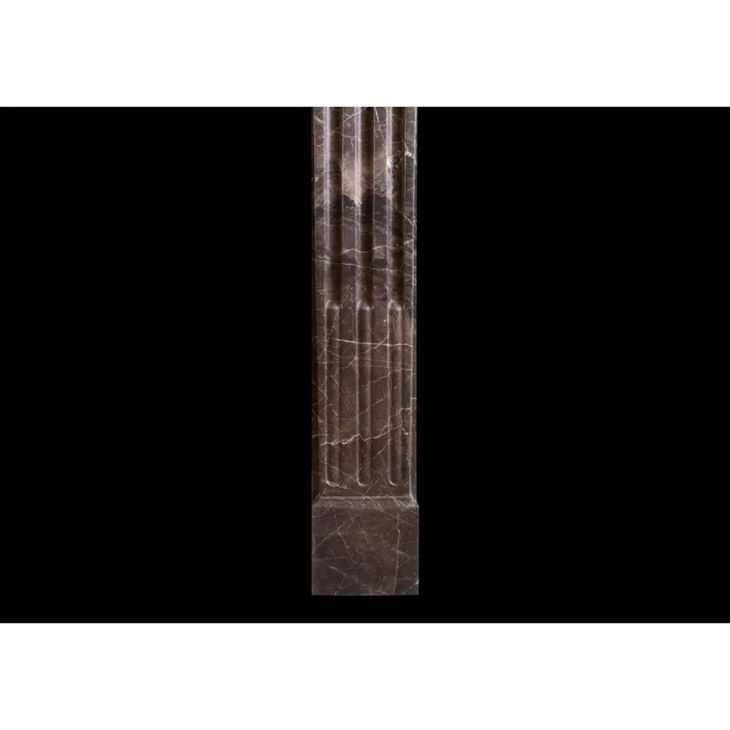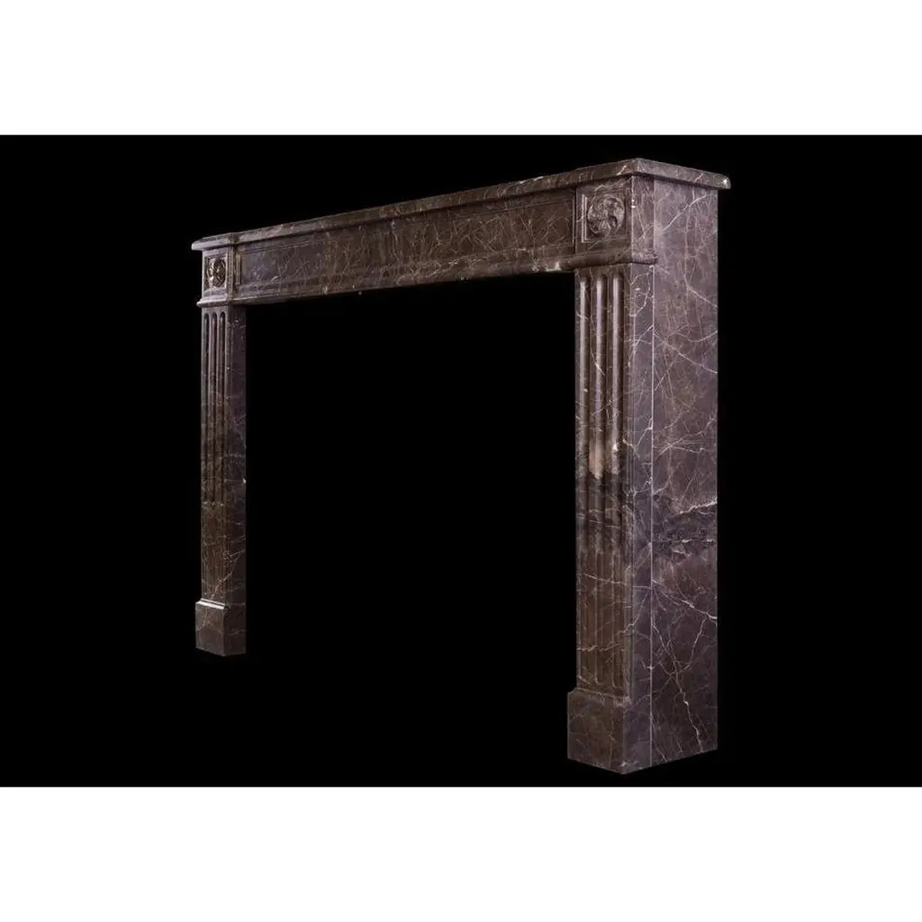 A French Louis XVI style fireplace in veined brown/grey marble. The stop fluted jambs surmounted by carved swirling paterae to end blocks. Panelled frieze surmounted by moulded shelf. A copy of an 18th century original.Additional information:Shelf Width: 1652 mm / 65"Overall Height: 1145 mm / 45 ⅛"Opening Height: 953 mm / 37 ½"Opening Width: 1300 mm / 51 ⅛"Depth Of Shelf: 270 mm / 10 ⅝"Overall Plinths: 1596 mm / 62 ⅞"