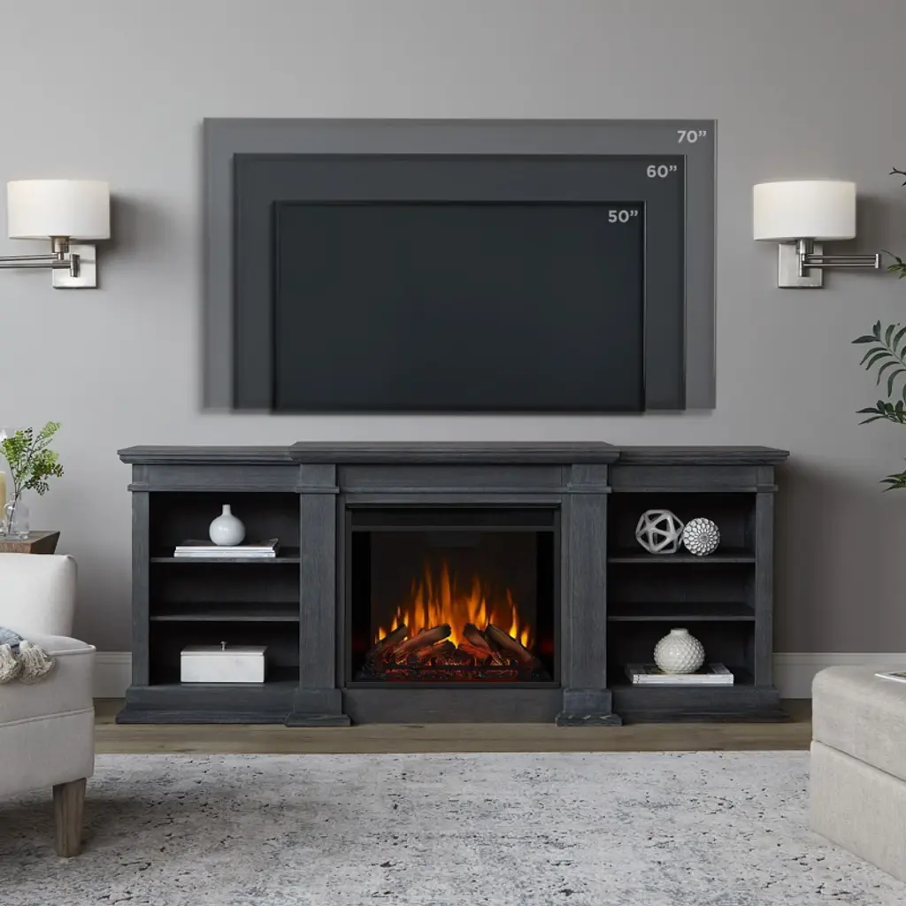 Elevate the comfort of your home with the refined style of the Fresno electric fireplace tv stand. This striking entertainment center offers plenty of adjustable side shelving and a generous mantelpiece that can accommodate a TV up to 70". The Real Flame® VividFlame™ electric firebox mimics the look of a real, flickering fire, but does not require a chimney or vents and conveniently plugs into a standard outlet. Features a mantel with a real wood finish, six flame colors, five flame brightness levels, adjustable thermostat, timer function and automatic safety shut-off. The electric fireplace insert provides supplemental heat for rooms up to 1,000 sq ft or the heater can be turned off so you can enjoy the comforting ambiance of a glowing fireplace year-round. Mantel, firebox with log set, hardware and remote control are included.