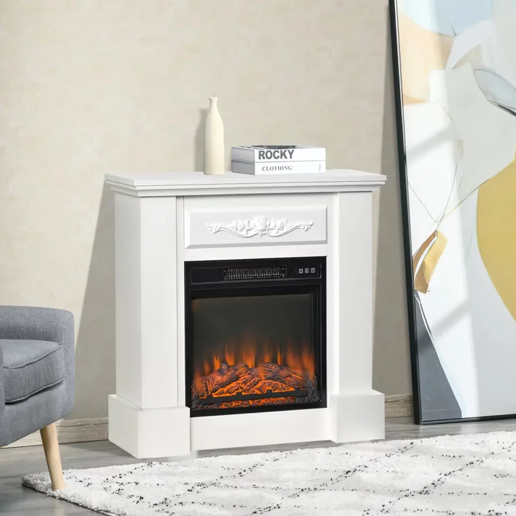 Homcom 32" Electric Fireplace With Mantel, Freestanding Heater With Led Log Flame, Overheat Protection And Remote Control, 1400w, White