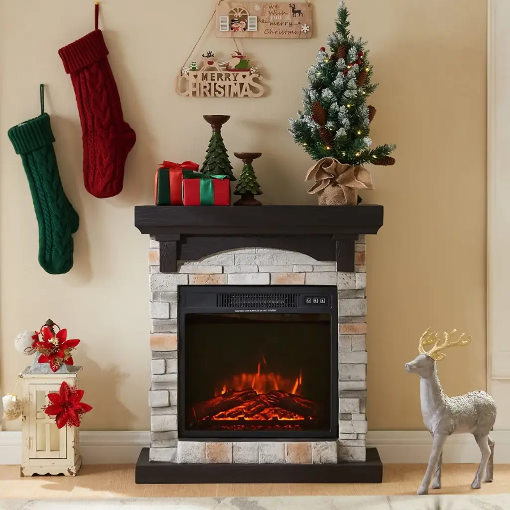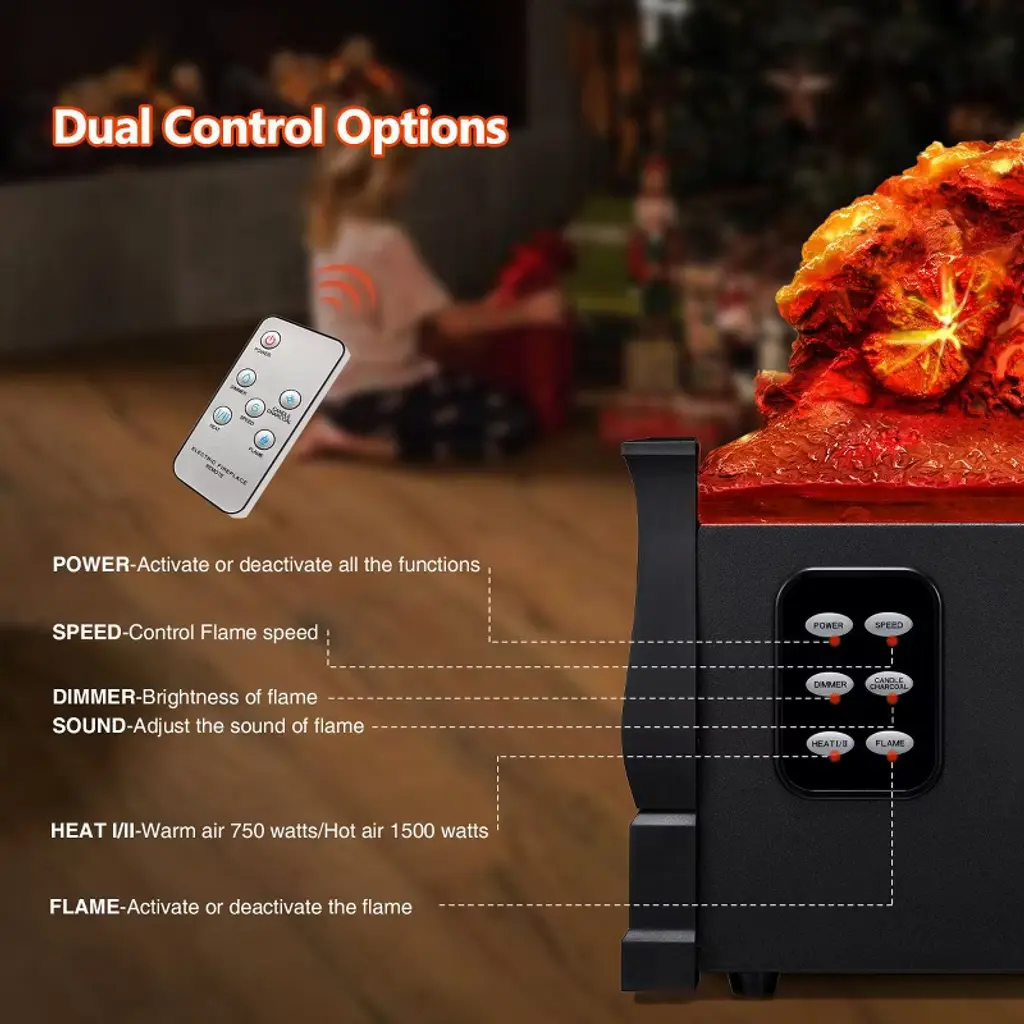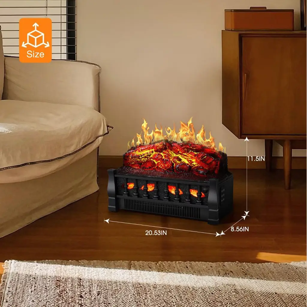 This electric fireplace log set heater delivers a remarkably realistic experience with its imitation wood logs that glow with vivid red light upon activation, creating the authentic appearance of burning embers. Offering versatile control, its electronic flame effect (adjustable across 5 brightness levels, 5 speed settings, and 2 temperature modes) and heating function (750W or 1500W) operate independently for customized ambiance and warmth. Convenience is key with included remote control for effortless adjustments from across the room, supplemented by manual controls on the unit's side panel. Designed for safety, it produces no real flames, emits zero gases, and incorporates overheating protection for worry-free operation. Measuring a portable 20.53" L x 8.56" W x 11.51" H, it's perfectly sized to enhance spaces like living rooms, bedrooms, kitchens, or offices.