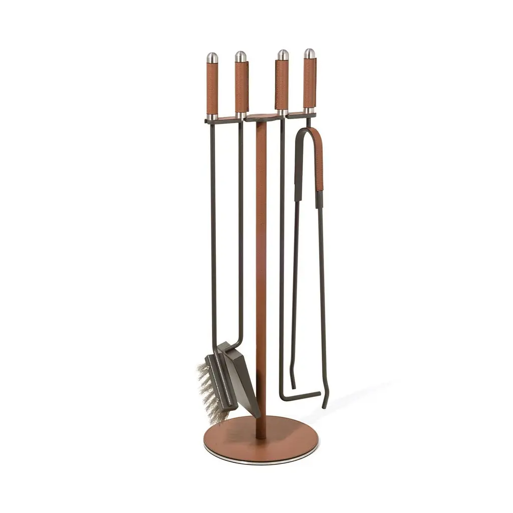 Sleek lines and meticulous leather detailing characterize this superb fireplace set that merges Industrial and modern styles. The stand is composed of a tall stem topped with a horizontal bar with four divots that safely hold the fireplace tools, entirely supported by a round base. The set comprises a Tampico brush, poker, tongs, and shovel. The burnished iron and stainless steel handles are upholstered in red leather for a stunning visual effect. This set is the perfect home decor solution that adds charm and ensures efficiency to your fireplace hearth. Available in various leathers and colors.