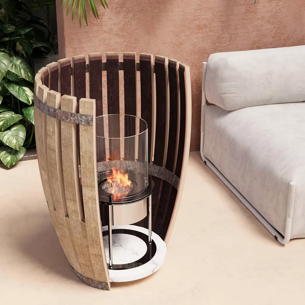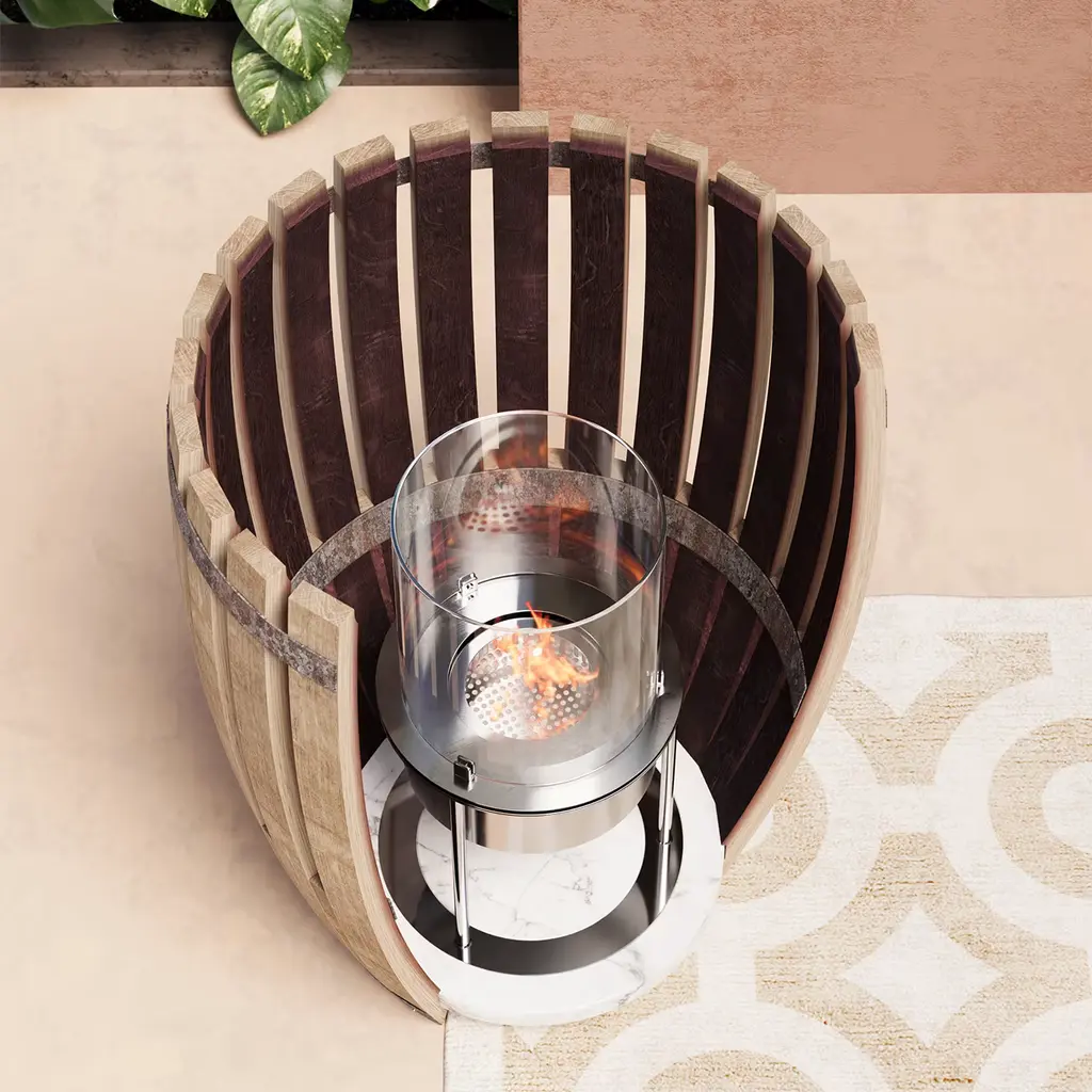 Mise en Rose is both a bio-fireplace and an innovative and functional piece of furniture. Inspired by the barrel manufacturing, its design combines the oak’s warmth with the iron’s strength. The fire, fueled by bioethanol, spreads from the heart of the barrel. The curvature of the oak stave is the central element, in contrast with its Palissandro marble’s base and the steel burner. The wine hues inside the barrel add a touch of sophistication, while the fire creates a play of lights and shadows.
