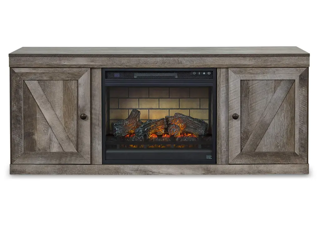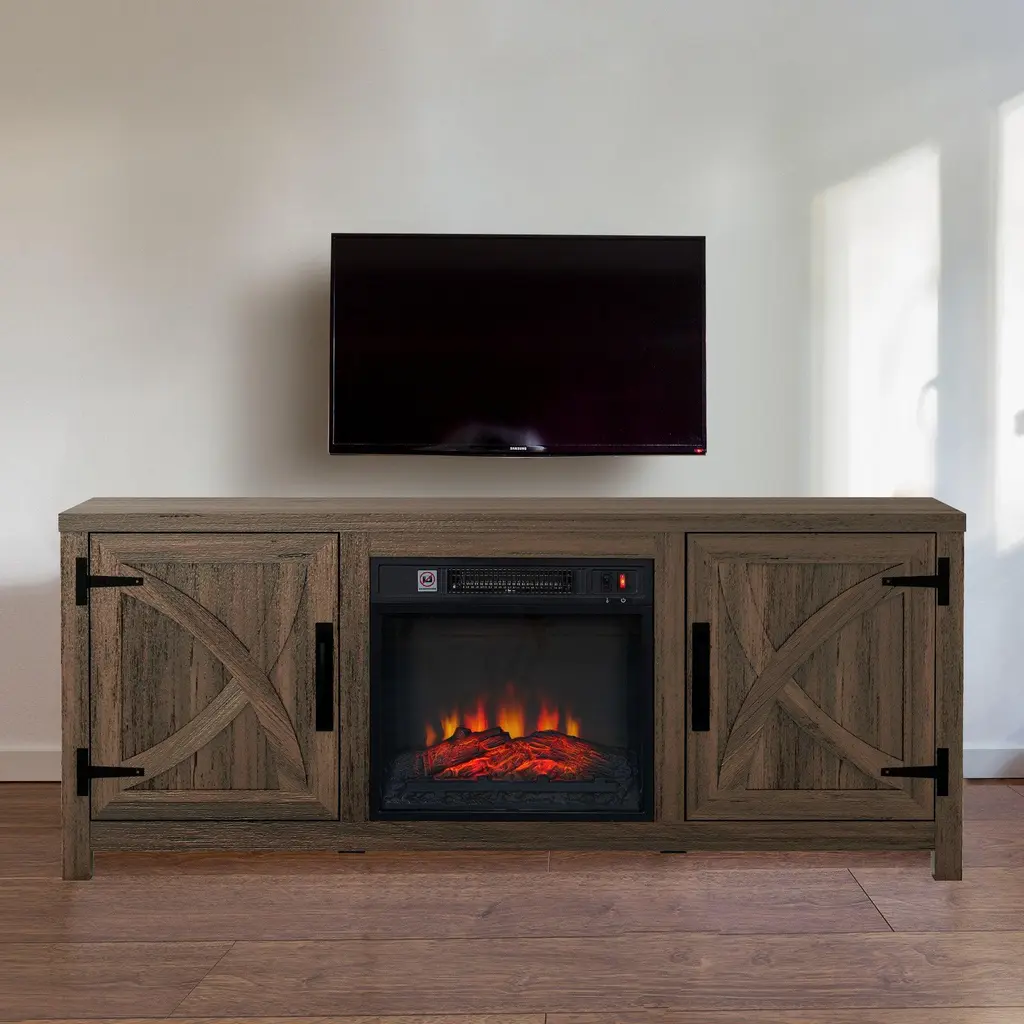 Decorated in a rustic white/brown/grey finish, this sophisticated media electric fireplace features a recessed wood panel door marked with an attractive "X" logo. This farmhouse style TV stand is the perfect combination of beauty and functionality. Made from wood, it has a sophisticated finish and exudes a modern appeal that we absolutely love. This TV Stand Fireplace features two interior cabinets that provide ample space for DVDs, games, media players, and other entertainment essentials.