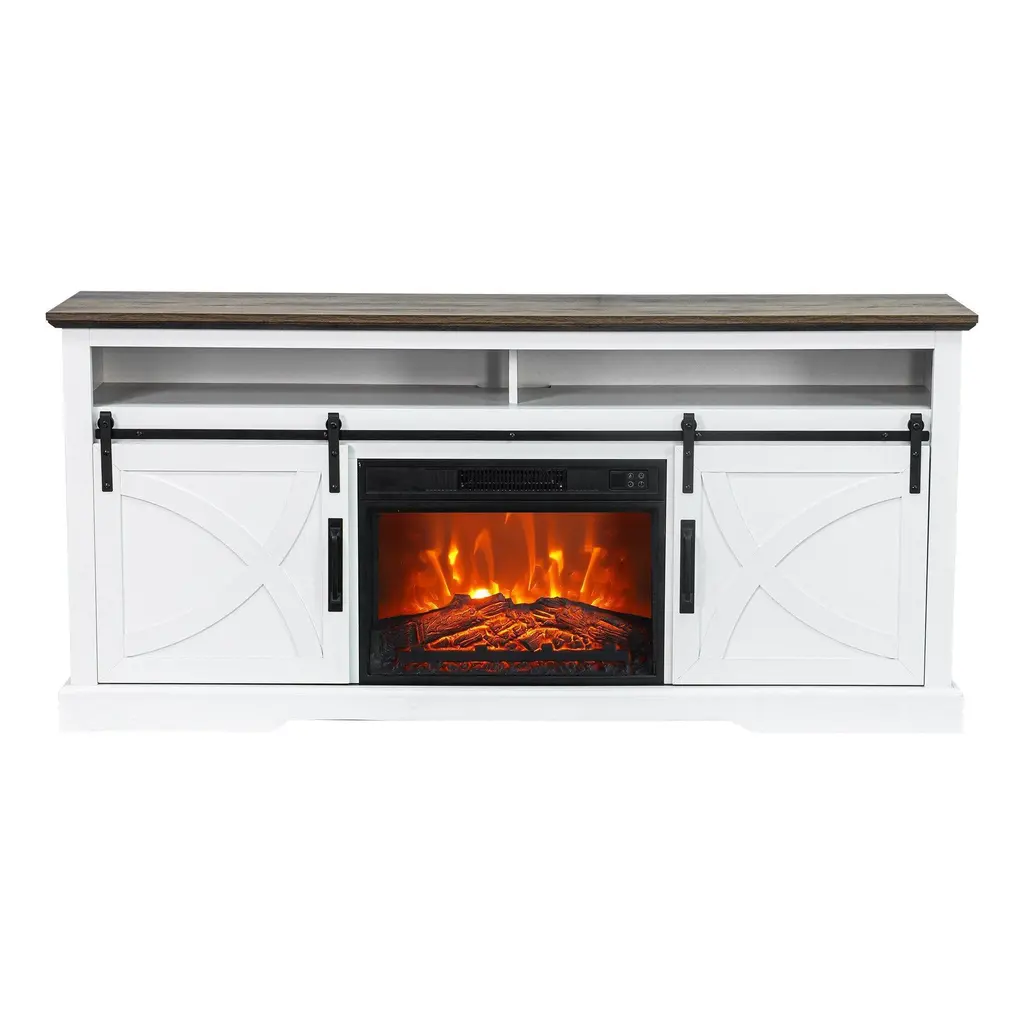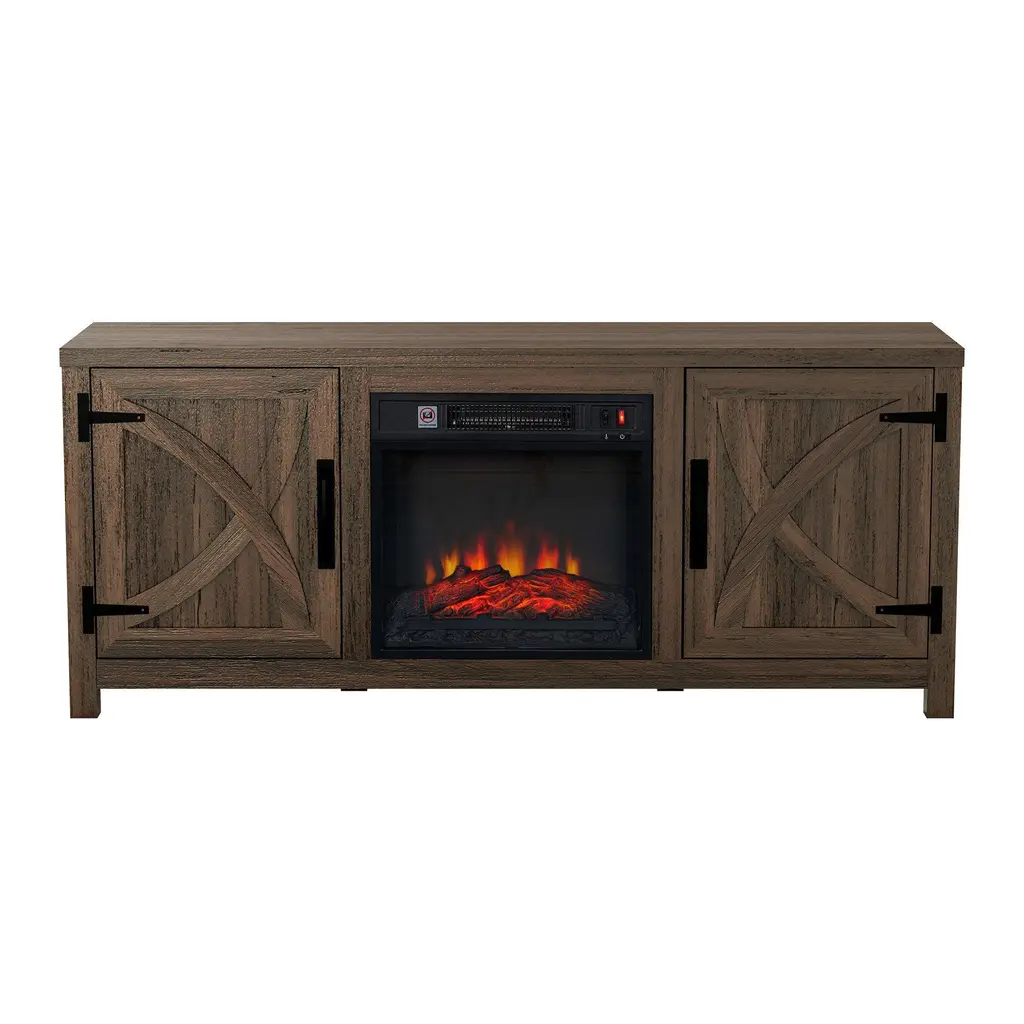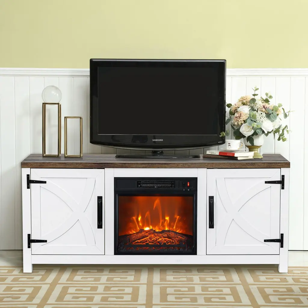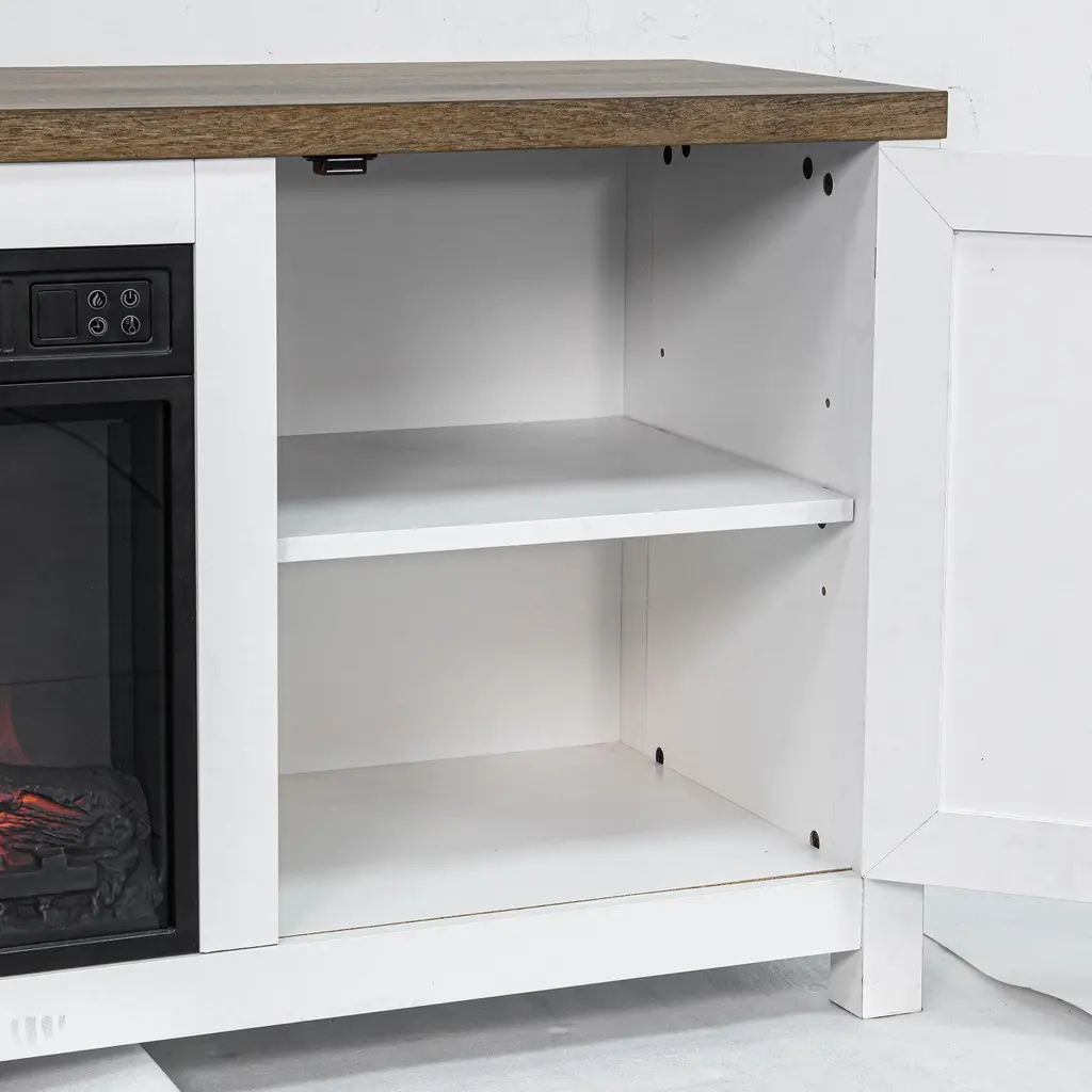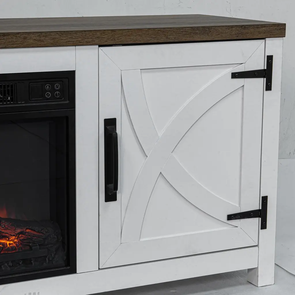 Decorated in a rustic white/brown/grey finish, this sophisticated media electric fireplace features a recessed wood panel door marked with an attractive "X" logo. This farmhouse style TV stand is the perfect combination of beauty and functionality. Made from wood, it has a sophisticated finish and exudes a modern appeal that we absolutely love. This TV Stand Fireplace features two interior cabinets that provide ample space for DVDs, games, media players, and other entertainment essentials.