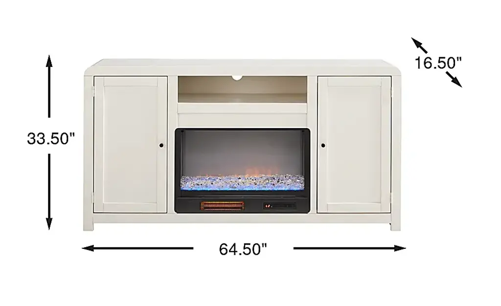 Symmetrical and timeless with a charming perspective of cozy warmth and poise, the Montavilla console is designed to enhance both style and comfort in your home. This contemporary piece boasts a white finish that effortlessly complements any style. Showcasing two doors that provide easy access to storage and a top center cubby that offers the perfect space for media devices or display items, this console is built to accommodate televisions up to 65 inches. Adjustable shelves ensure customizable organization, while wire management holes keep cords neatly concealed. The removable fireplace portion features a realistic energy-saving LED firebox with remote controlled heat and ambient lighting with four color changing options. LED color effects can be used with or without heat.