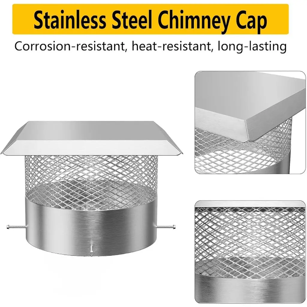 Protect your fireplace or stove vent with this stainless steel round chimney cap, designed for all-weather performance and safe ventilation. Its extended hood protects against rain and snow, preventing water backflow and corrosion, while the surrounding mesh ensures smooth smoke exhaust and blocks unwanted debris or animals. Constructed from heavy-duty galvanized steel with a weather-resistant coating, this chimney cover is built to last even in extreme conditions. Available in multiple sizes (6"–20"), it easily fits a wide range of round flues for both residential and commercial heating setups. With its bolt-on adjustable design, installation is fast, secure, and requires no drilling—making it a reliable solution for long-term chimney protection.