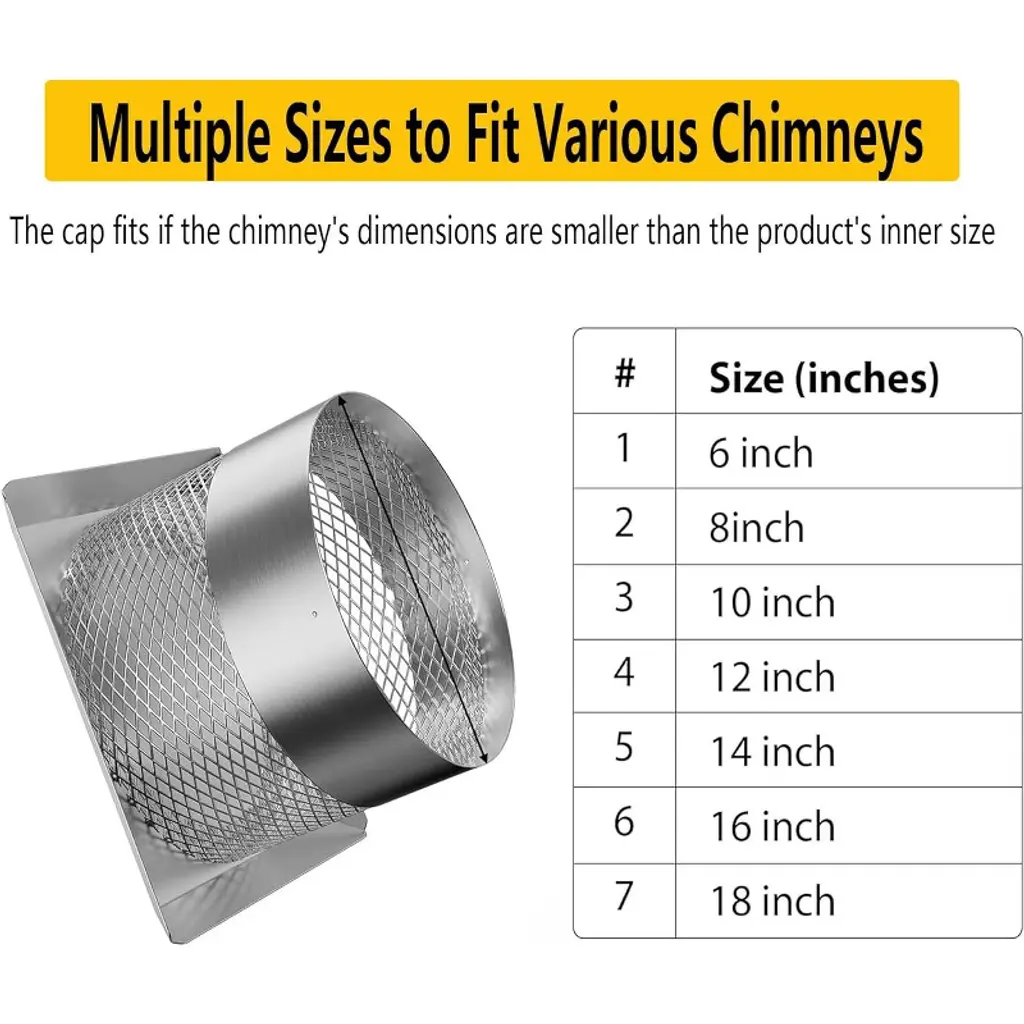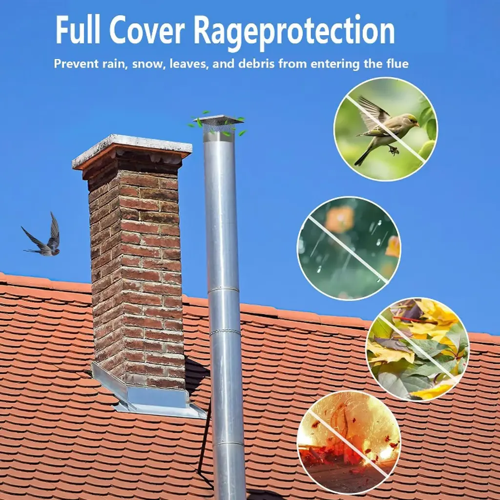 Protect your fireplace or stove vent with this stainless steel round chimney cap, designed for all-weather performance and safe ventilation. Its extended hood protects against rain and snow, preventing water backflow and corrosion, while the surrounding mesh ensures smooth smoke exhaust and blocks unwanted debris or animals. Constructed from heavy-duty galvanized steel with a weather-resistant coating, this chimney cover is built to last even in extreme conditions. Available in multiple sizes (6"–20"), it easily fits a wide range of round flues for both residential and commercial heating setups. With its bolt-on adjustable design, installation is fast, secure, and requires no drilling—making it a reliable solution for long-term chimney protection.
