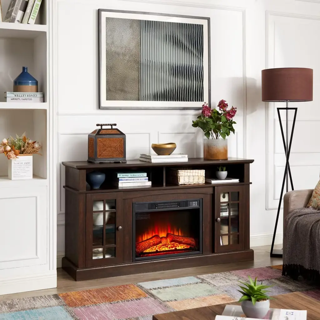 NAYSAYE Indoor Fireplace Media Console combines the charm of realistic flames with functional storage to create a cozy and stylish focal point in any room. Its espresso textured finish and open and closed compartments offer ample space for books décor or media accessories while adding a classic yet modern accent. This versatile console can serve as a TV stand sideboard or display table enhancing warmth and elegance in living rooms bedrooms or entertainment areas.