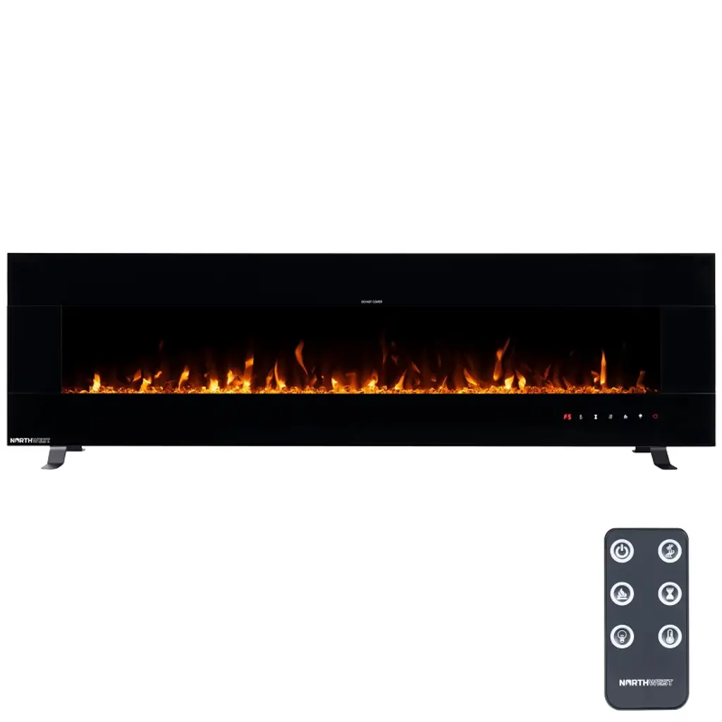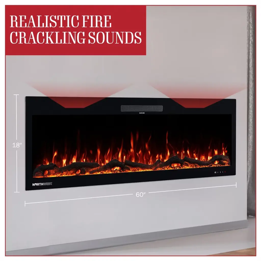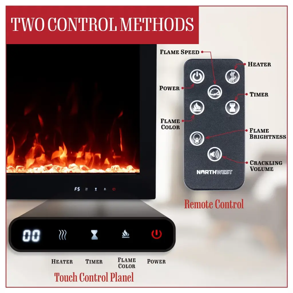Bring the beauty and warmth of a real fireplace into your living space without any of the mess with the 60-Inch Wall Fireplace Electric with Remote Control by Northwest. This faux fireplace includes a remote control that lets you power the unit on and off, change between low (750W), high (1500W), and no heat settings, set a 30-minute to 8-hour automatic shutoff timer, switch up the color-changing effects, adjust the brightness of the flames, or control the flame speed from anywhere in the room. The versatile fireplace insert includes mounting hardware for easy wall mounted or recessed installation below your mantle or on your bedroom wall, making it a great addition to any space as functional room decor.