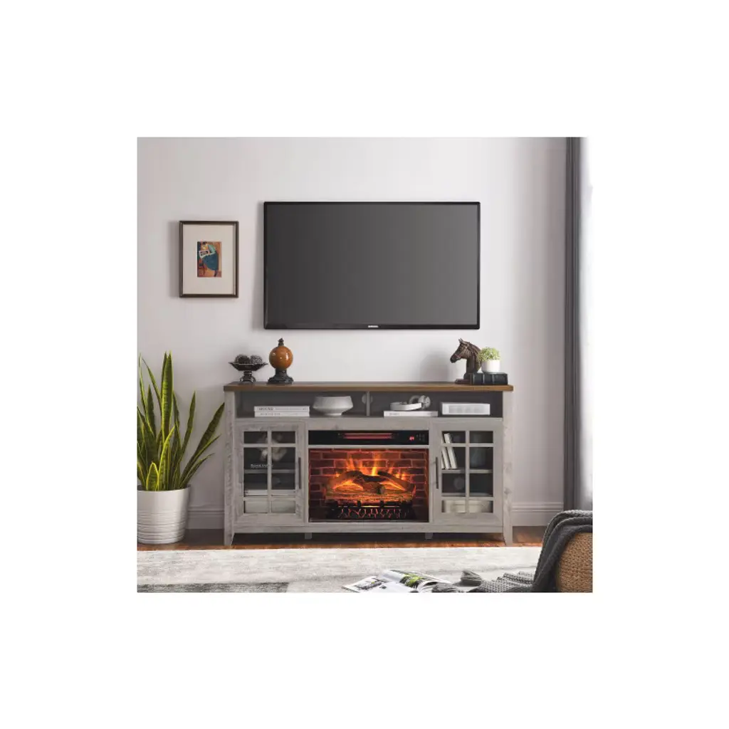 The gentle tones and casual elegance of the Oakwood Terrace collection brings soft, breezy sophistication to your home entertainment center. This console features a sandy beige finish and a clean rectangular frame, offering a warm, grounded look that suits both casual and elevated interiors. Two paneled doors open to reveal spacious shelving for tucked-away storage, while three cubbies at the top provide display space for decorative accents. At the center, a removable fireplace portion features flickering flames and faux embers, working with or without heat for a warm ambiance year-round. Tapered legs and black metal pulls add subtle contrast and tailored appeal, making this console sophisticated and refined.