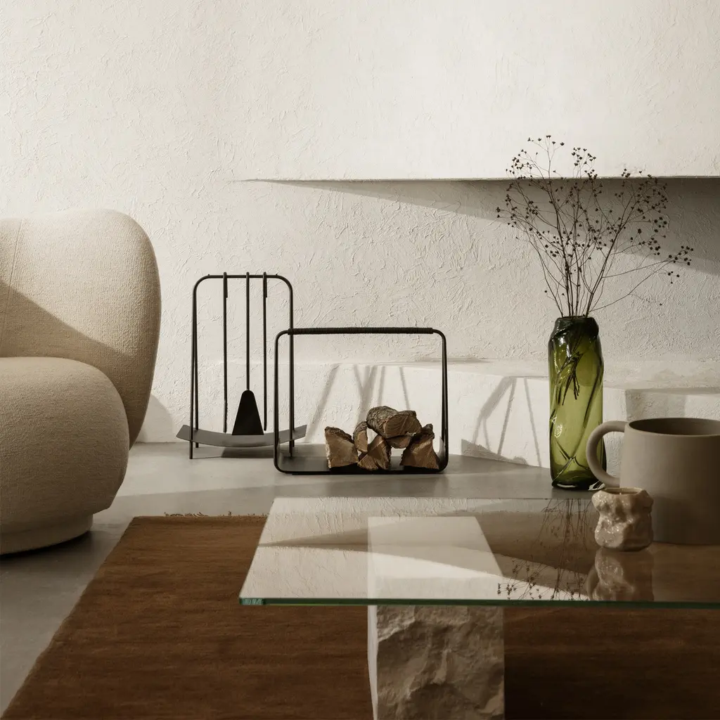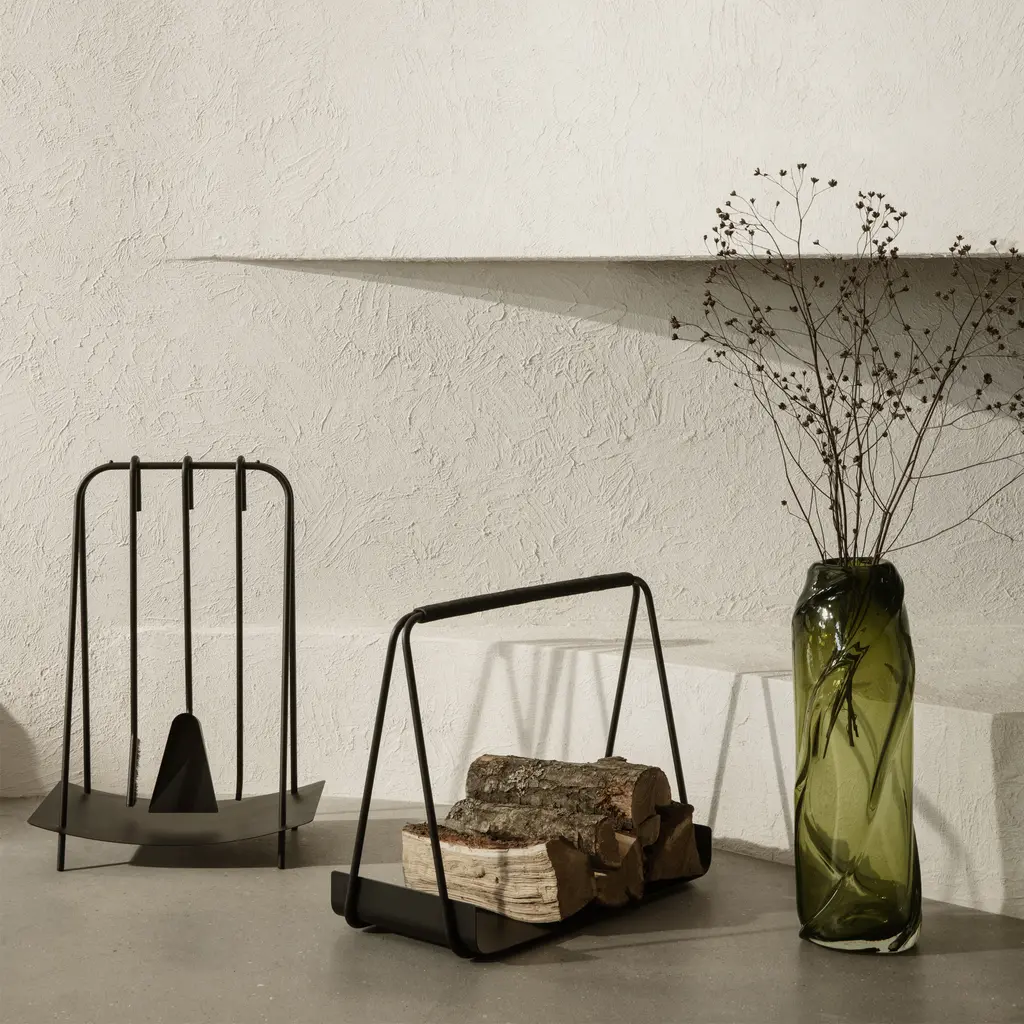 This set of fireplace tools, inspired by the elegance of jewelry, enhances the functionality and style of your hearth. Crafted from powder-coated steel, the set features organic shapes and delicate lines, blending aesthetics with practicality. The ensemble includes a stoker, spade, broom, and a stand, all designed to help you manage your fire with grace. Available in sleek black and elegant brass, this set not only aids in fire maintenance but also serves as a stylish addition to the area around your fireplace.