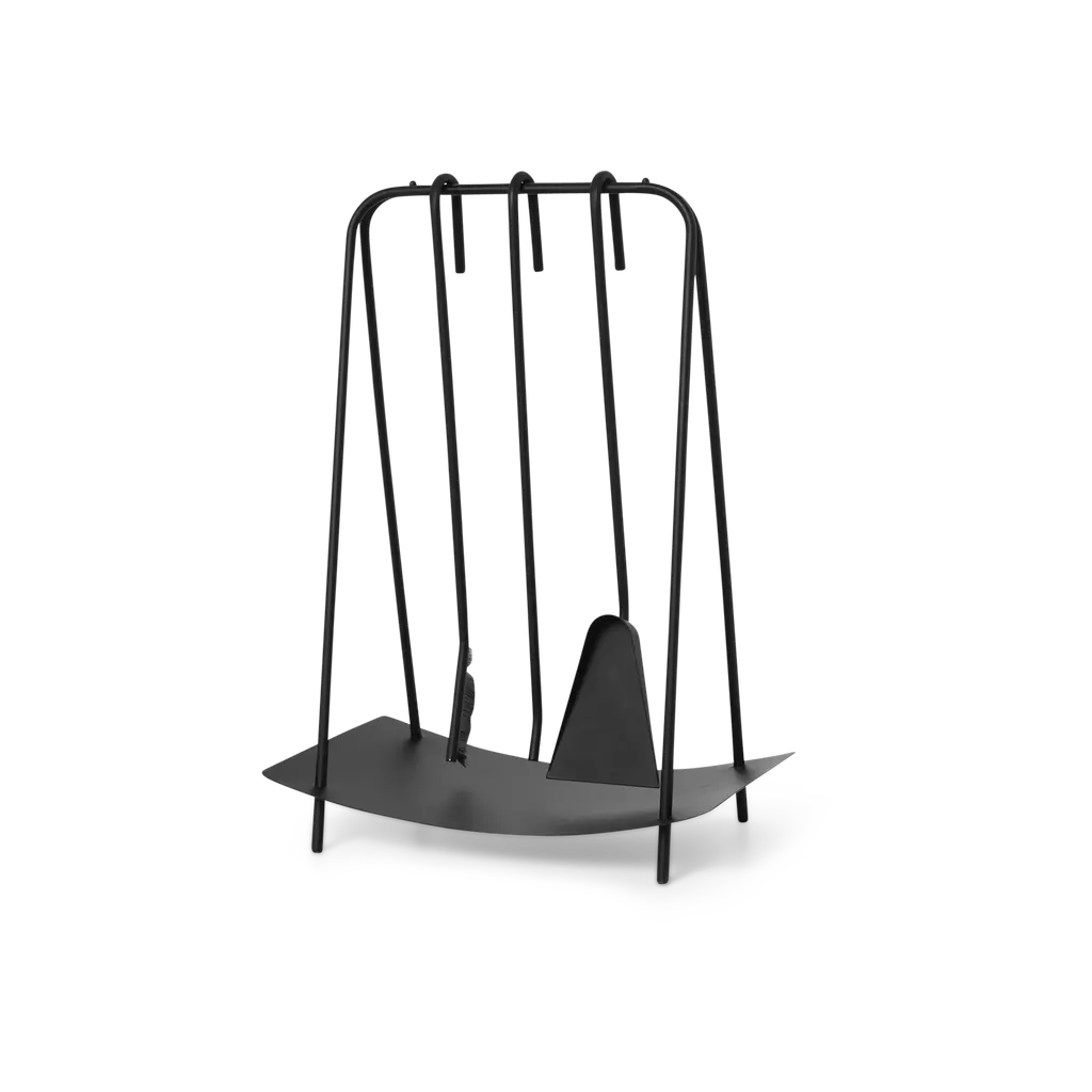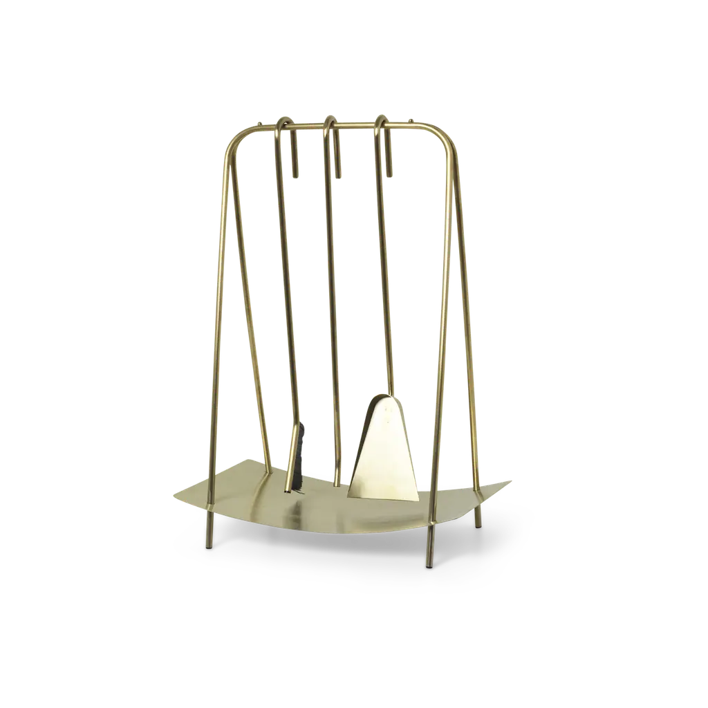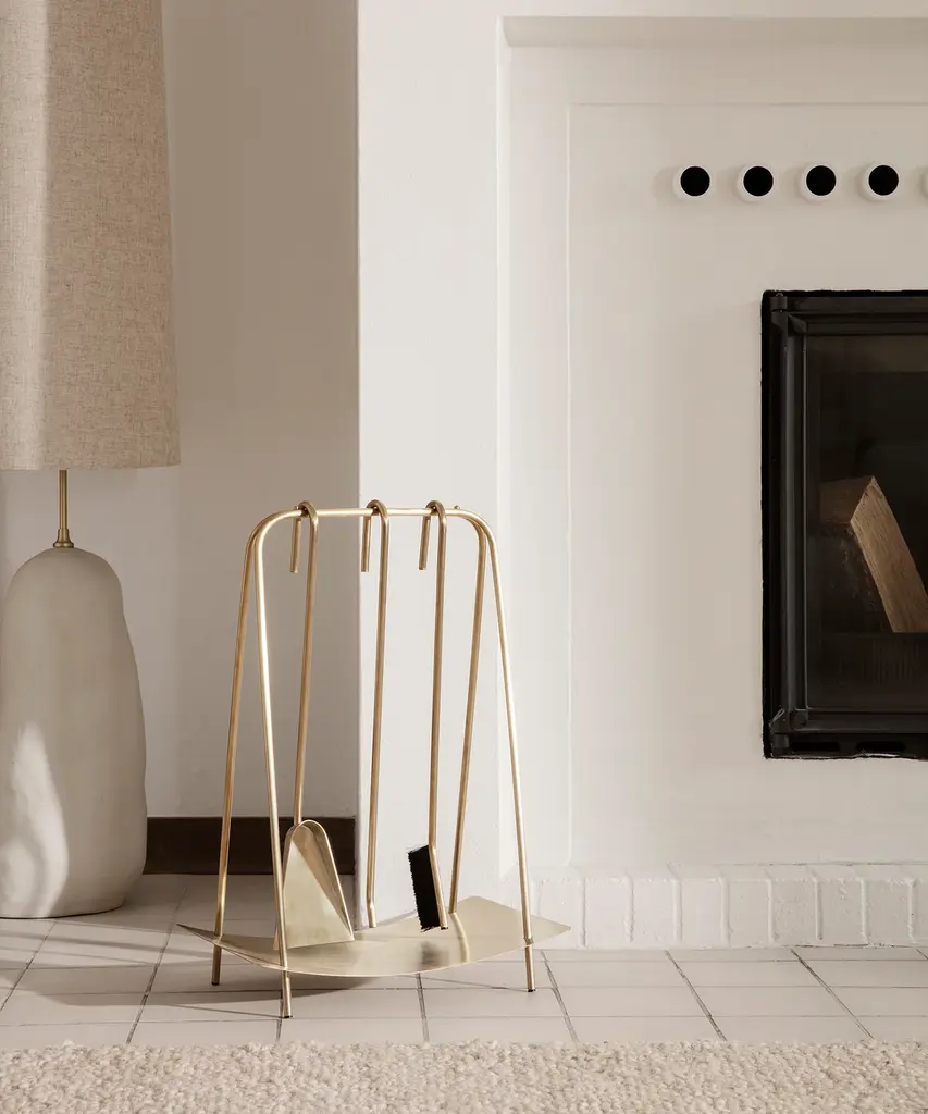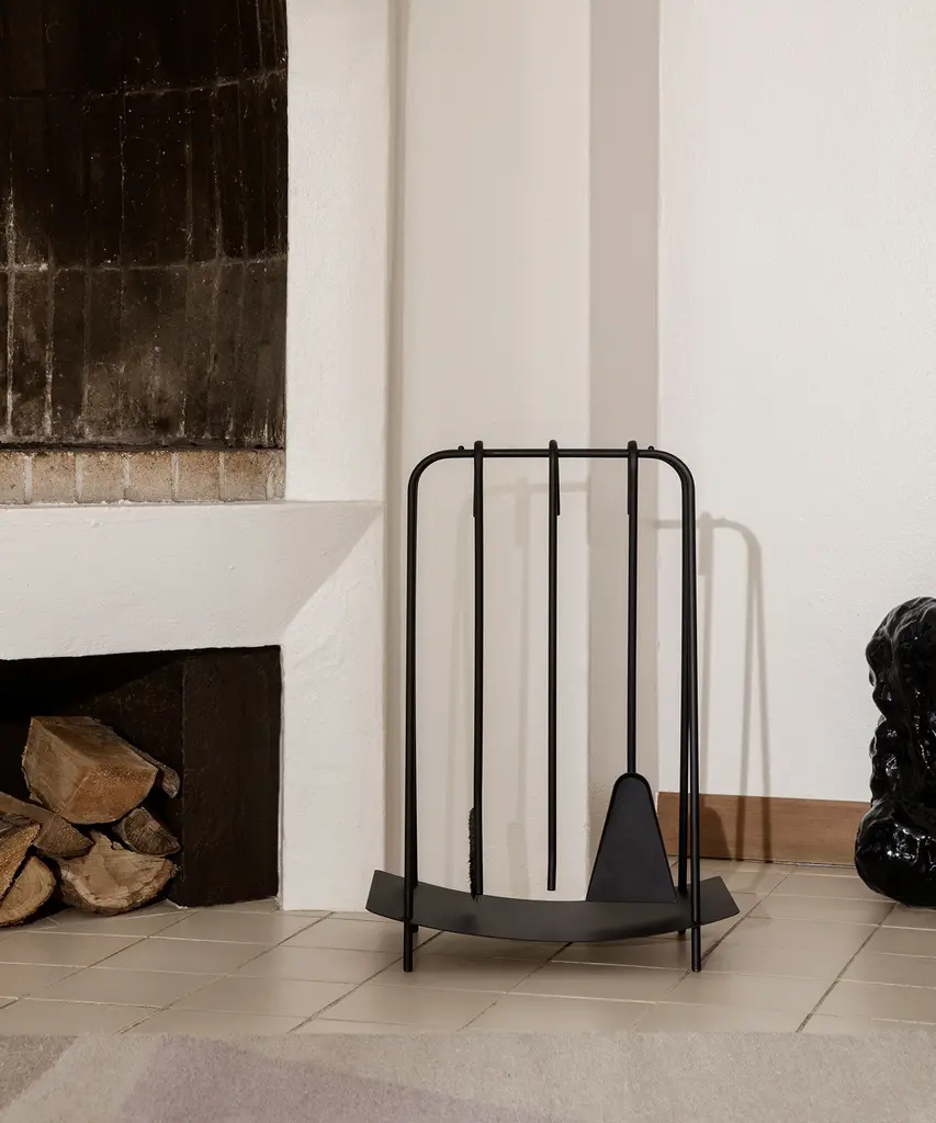 Inspired by jewelry, this set of tools brings out the best of your fireplace. With organic shapes and delicate lines, the powder-coated steel ensemble helps you tend to the fire in style. Merging functionality and aesthetics the set lightens up the area around your hearth or fireplace. The set includes a stoker, a spade, a broom, and a stand. Available in black and brass. Designed and produced by the Copenhagen-based studio Ferm Living.
