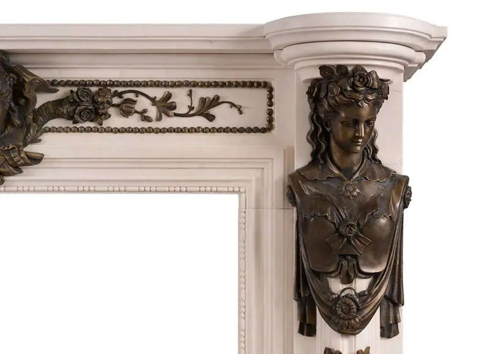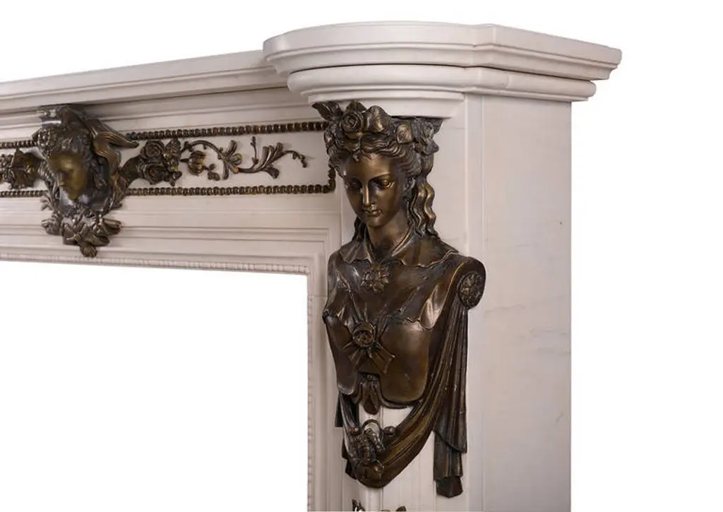 A striking Regency style fireplace in white marble with fine quality bronze detailing. The frieze with bronze female mask and ribbons with trailing foliage. The fluted jambs with carved inner mouldings, adorned with bronze female figures and stiff acanthus leaves to base. Shaped breakfront moulded shelf. A copy of a period original.Measures: Shelf width - 1880 mm / 74 inOverall height - 1335 mm / 52 1/2 inOpening height - 995 mm / 39 1/8 inOpening width - 1040 mm / 41 inDepth of shelf - 470 mm / 18 1/2 inOverall Plinths - 1735 mm / 68 1/4 in