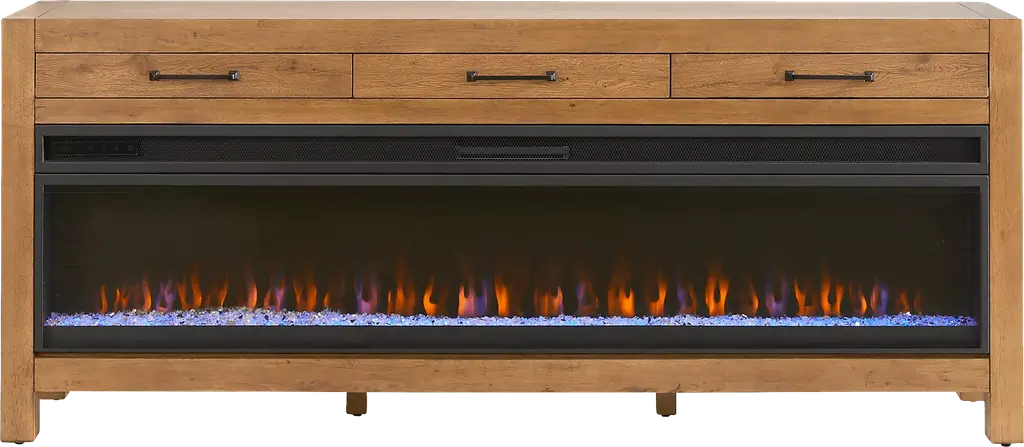 The Rime wood media stand features a built-in electric fireplace at its center, slide-open storage compartments up top and adjustable hidden shelves on each side. This showstopping entertainment center presents a large flat-screen TV on its mantel, keeps electronics stored out of sight and mimics the flickering flames of a real fire. The brightness, color and temperature settings of the firebox can be adjusted on the fly with a remote control.