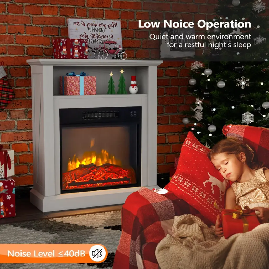 The freestanding electric fireplace with mantel boasts 1400W heating power, which can quickly and effectively warms up 400 sq.ft. space. Using an electric fireplace might be a cost-efficient way to get warm in cold winter days while not hurting your wallet. This smart appliance is also easy to operate, the life-like flame effect can be used with or without heat, buttons both on heater body and remote control for easy and convenient operation. Fluted pilasters and timeless craftsmanship details complete the classic demeanor of traditional style; This fireplace Mantel is beautifully crafted in a modern design that complements virtually any home decor, perfect for bedrooms, family rooms and dining rooms. You'll fall in love with mantel fireplace piece. Bring this fireplace home and discover more possibilities in the winter. Specification: 1. Model: 105-18G+HA231-30 2. Power: 1400W 3. Temperature: 62~82°F/17~27°C 4. Timer Range: 0.5 Hour - 6 Hours 5. Three Flame Level: L1-L2-L3 6. Digital Display: Yes 7. Operation Method:Control Panel & Remote Control 8. Features: Auto-Shutoff, Overheat Protection, Tip-over Protection 9. Material: Wooden, Iron & Glass 10. Work Decibel: Approximately 40db 11. Certifications: CSA 12. Warranty: 1 Year 13. Color: Black & White 14. Weight: 41 lb 15. Fireplace Dimensions: 18.11"W x 4.53"D x 17.32"H 16. Wooden Cabinet Dimensions: 26.7"W x 9.84"D x 29.96"H Package Includes: 1 x Electric Fireplace Insert 1 x Wooden Cabinet 1 x Remote Control 1 x User's Manual 1 x Mounting Screw Pack