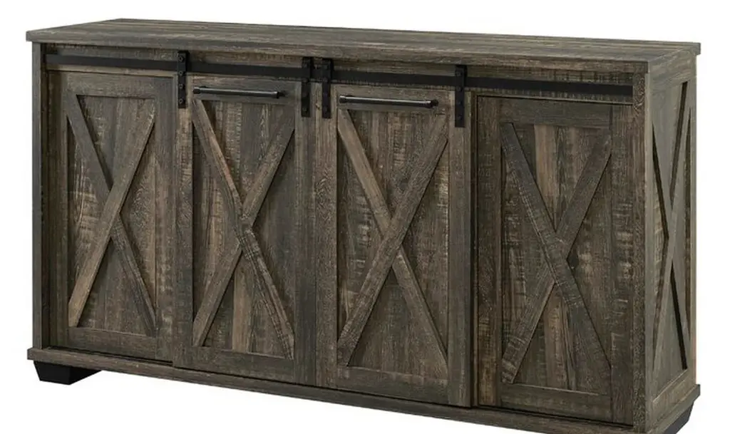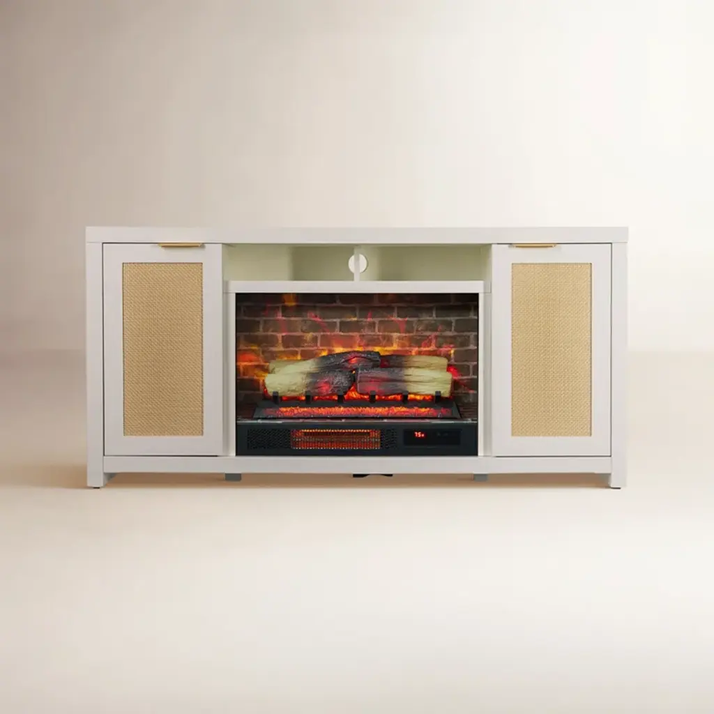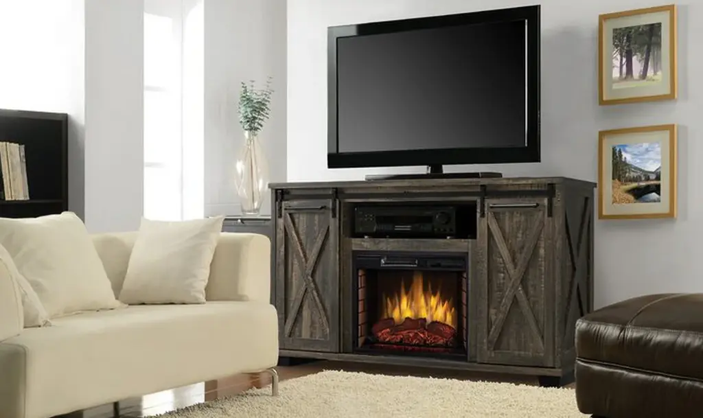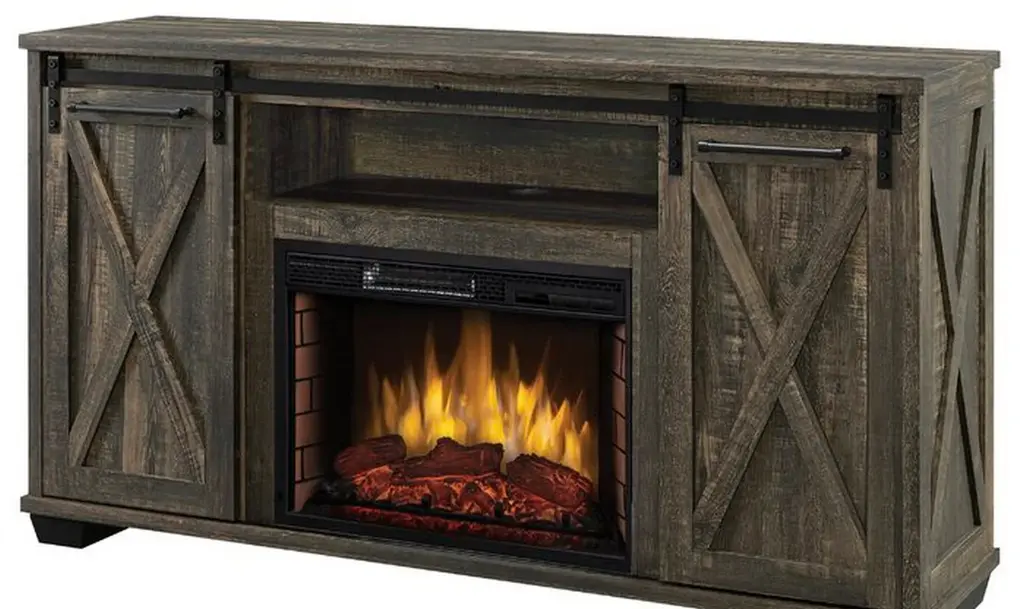 58 in. Media Mantel Electric Fireplace • Dimensions: 58 in. W x 15.5 in. D x 32 in. H • 1,000 sq ft Heating Area – Economical way to provide zone heating • The rustic finish media center, barn-door-style panels and industrial-style rivets add an upscale feel to any space. • 13 Thermostatic Temperature Levels – Keeps your room at a consistent, comfortable temperature • 3 Flame Adjustments – Allows you to control the ambiance, with or without the heater for 4 season enjoyment • 8 Stage Timer – Turns fireplace off automatically for safety and convenience • LCD Display – Viewable display confirms settings and fades after 10 seconds • Remote Control – Convenient operation anywhere in your room • Media mantel offers shelf for media components and accessories • Holds up to 60 in. flat screen TV