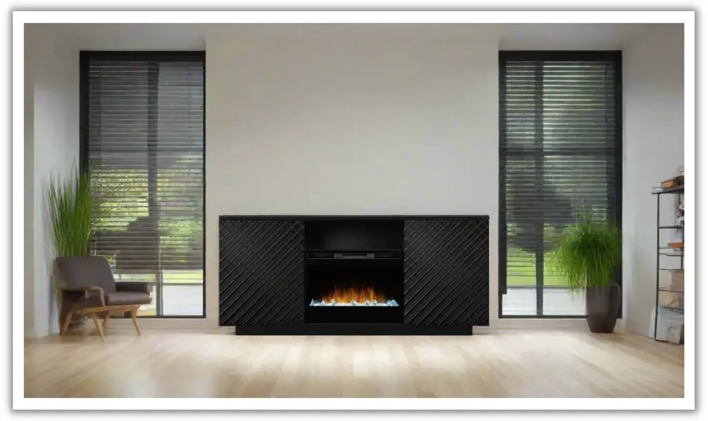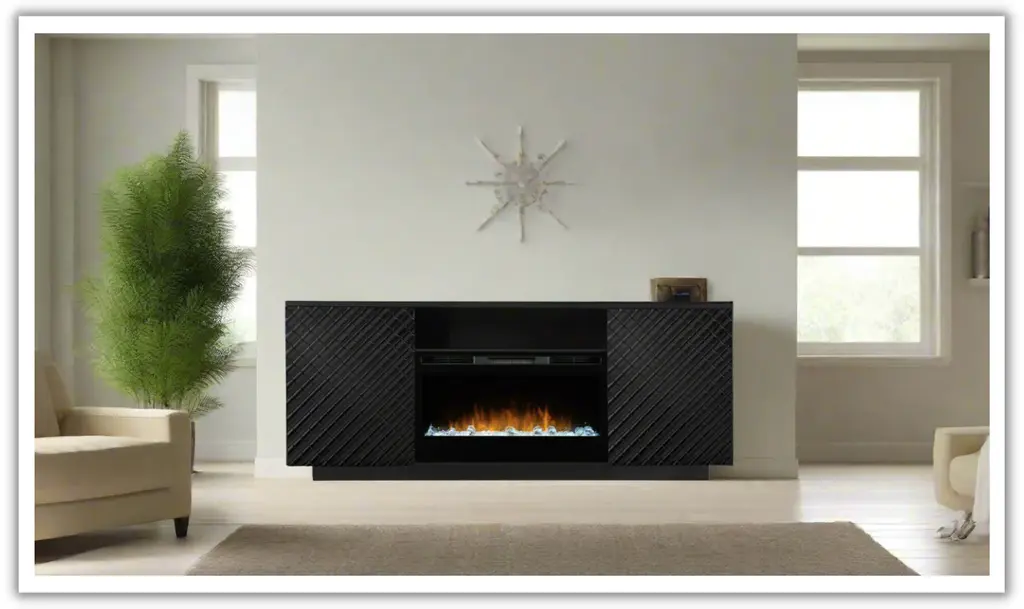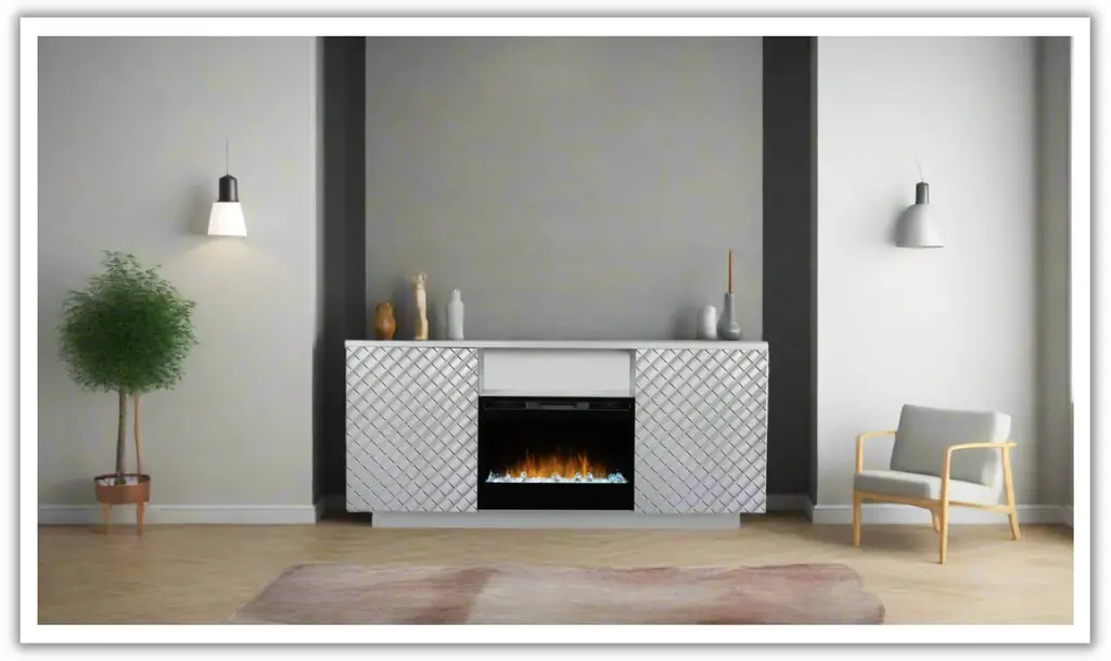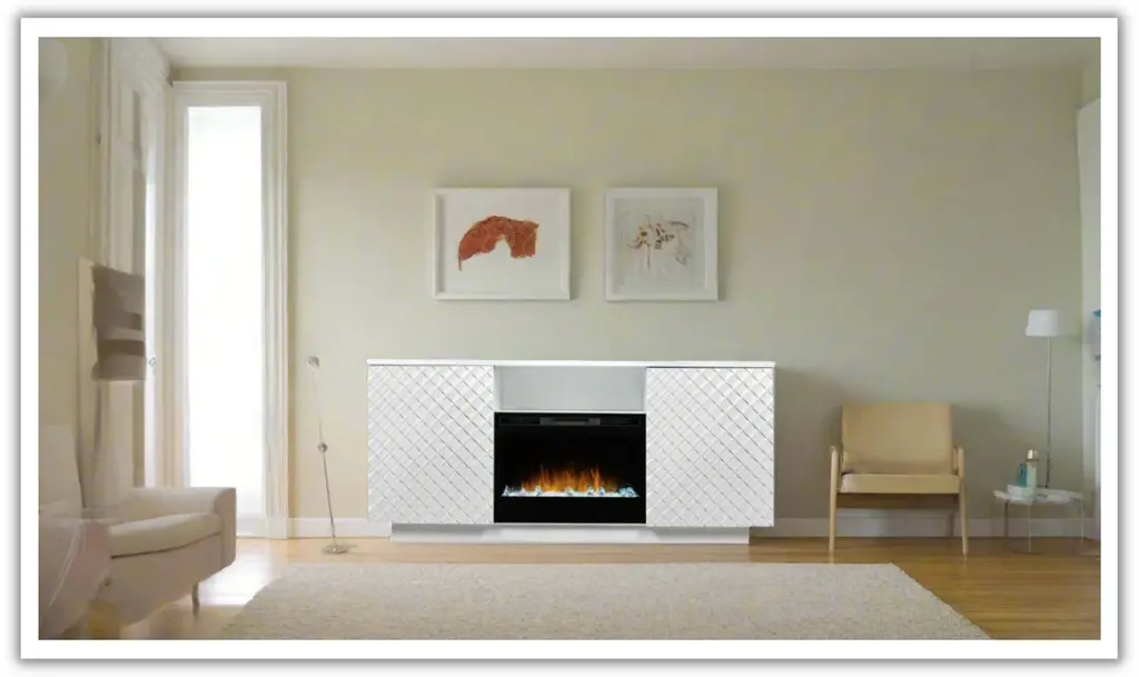 Transform your living space with the Diamond Console with Fireplace Insert from Smart Furniture. It features the cutting-edge Prism Series electric fireplace. This modern centerpiece combines warmth, ambiance, and versatility, offering a vibrant flame effect with customizable RGB colors that illuminate a diamond-like acrylic ice ember bed. Designed to heat areas up to 400 sq. ft., it includes an efficient fan-forced heater and energy-saving LED technology. The adjustable flames can operate independently from the heater, providing year-round functionality. The unit supports flexible installation options—wall-mounted, recessed, or built-in—and works with a standard 120V outlet or hardwiring. Control is effortless with a multifunction remote and a sleek control panel, ensuring a seamless user experience. Its cool-to-touch glass enhances safety, while the minimalist design integrates beautifully with contemporary and traditional interiors alike. Fireplace Insert comes along with the Console.
