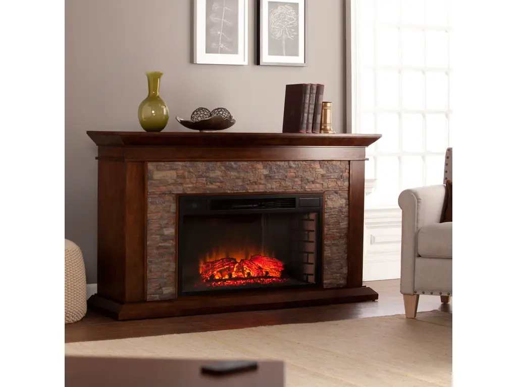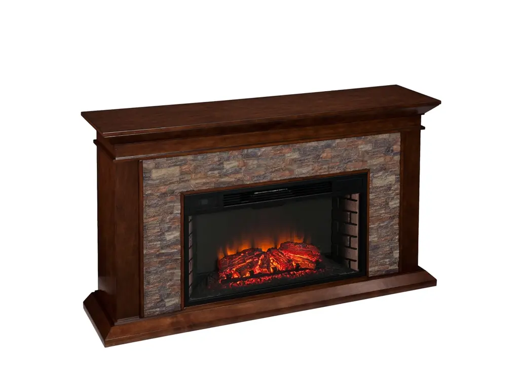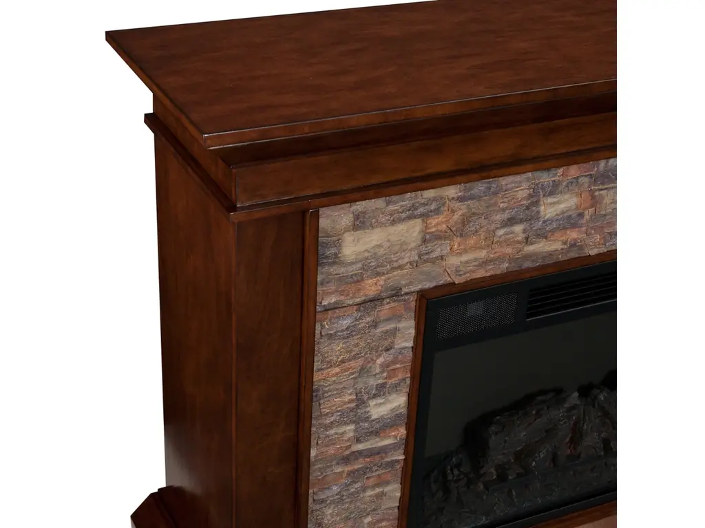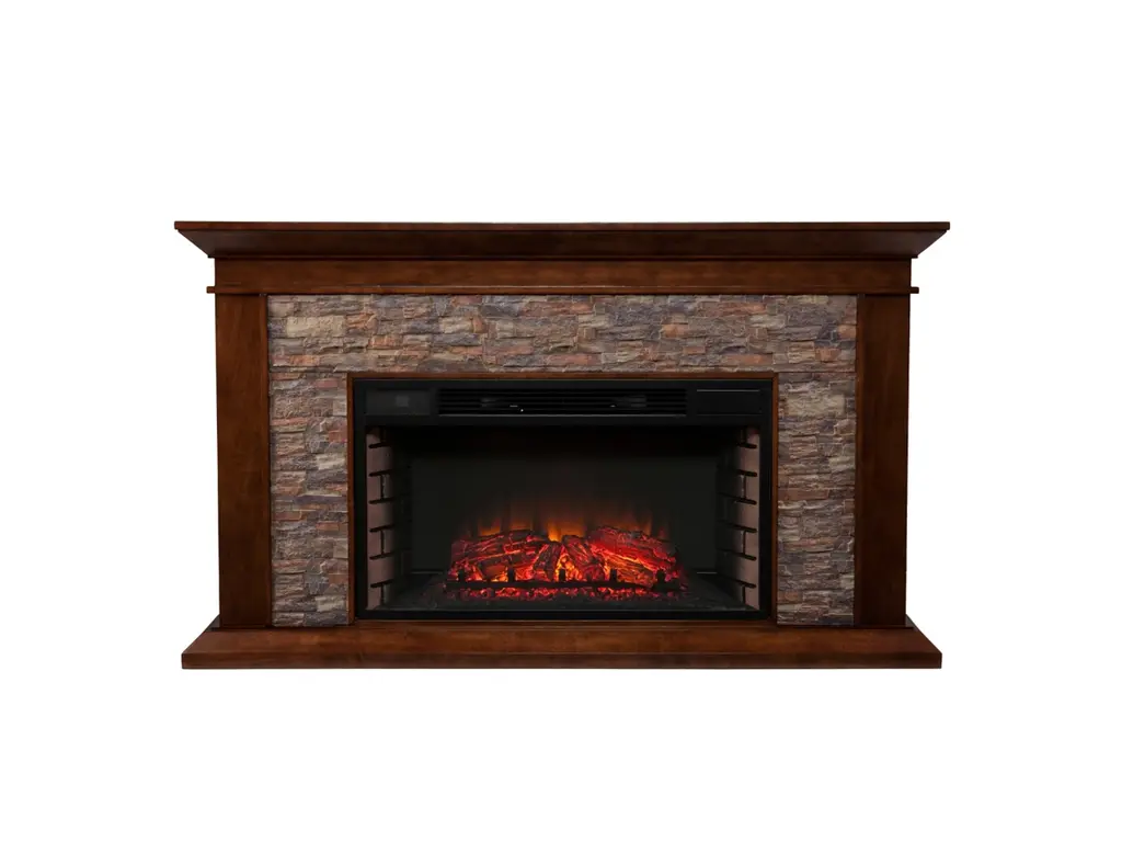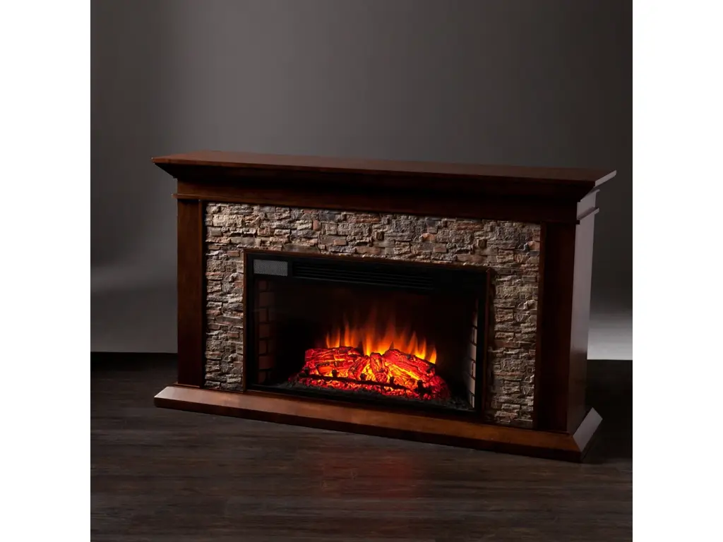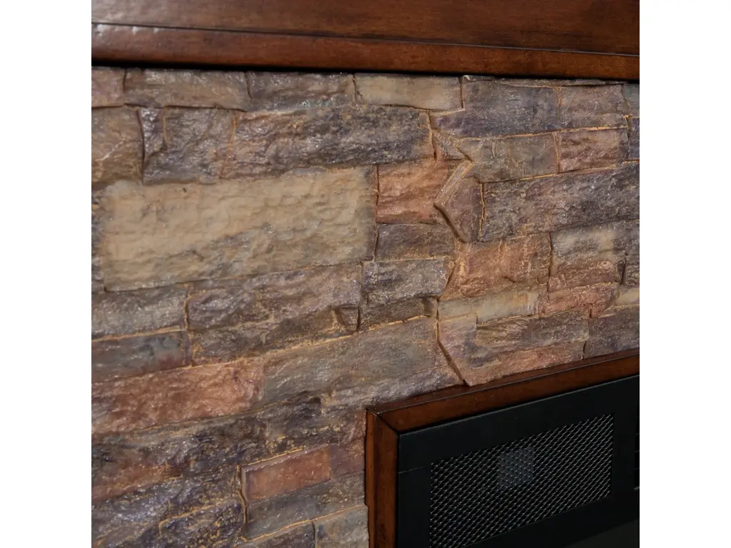 Western romanticism comes to life in this strikingly sleek electric fireplace. Handsome whiskey maple finish, subtle woodwork and smartly stacked, simulated stone encase a firebox which has multicolor flames, glowing embers and an interior brick design for a more lifelike look. Extra wide fireplace ignites the senses and fills both great rooms and cozy nooks alike, wowing any crowd. Conjure the ambience of a blazing hearth in an entertaining parlor, living room or dining area with this stunning, traditional fireplace
