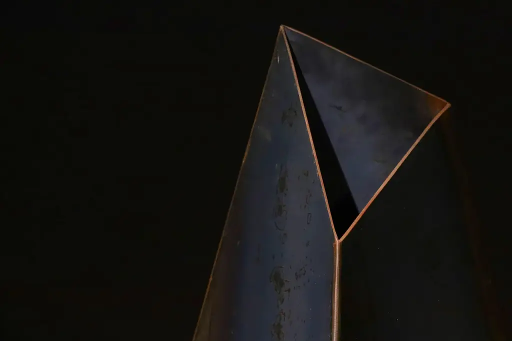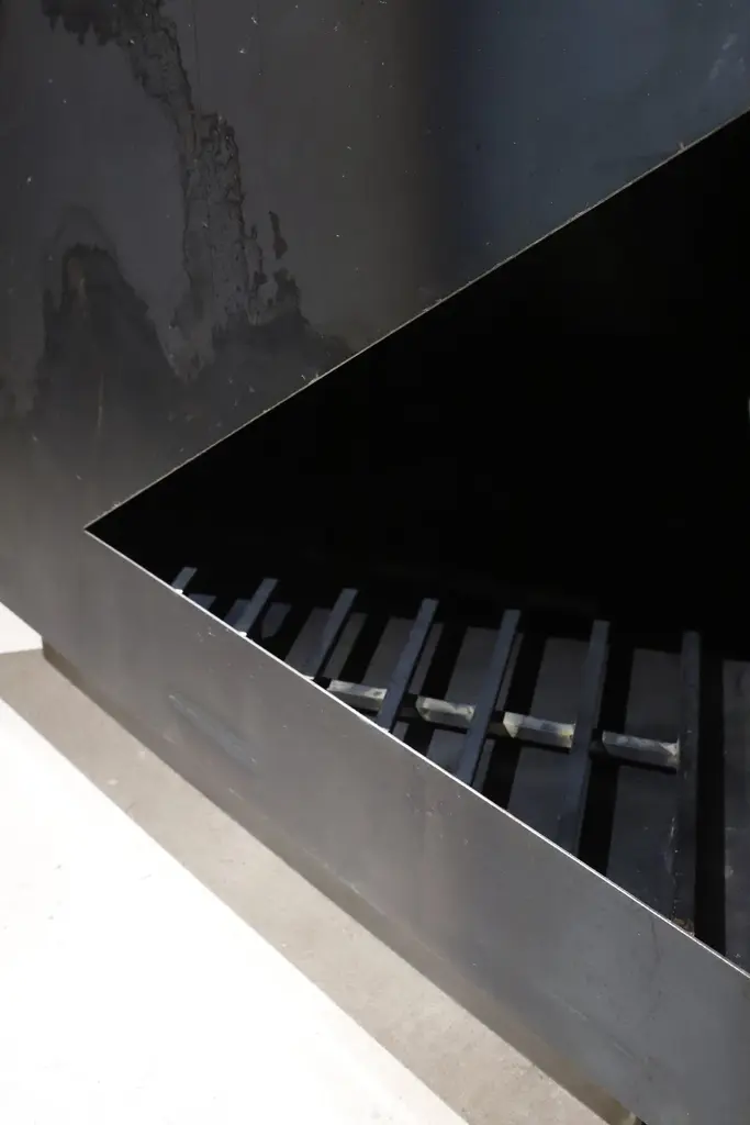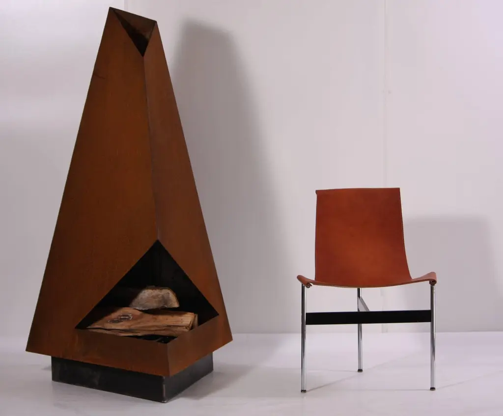 Not your normal chiminea or fireplace. This high design, raw steel sculptural piece will make a statement in any outdoor space. Functionally, it is perfect on that cold evening, but also serves as an amazing art display the remainder of the year. Features a solid stock steel rack that can be easily removed for cleaning fire debris and a handy poker. In addition, the chiminea is designed to hold standard split logs, not just the tiny bagged wood. Pictured with hand truck and sling chair by William Katavolos for scale. Follow local laws and common sense when it comes to starting a fire. Rusted finish varies. Also available in waxed raw steel that will patina to a rust finish over time.