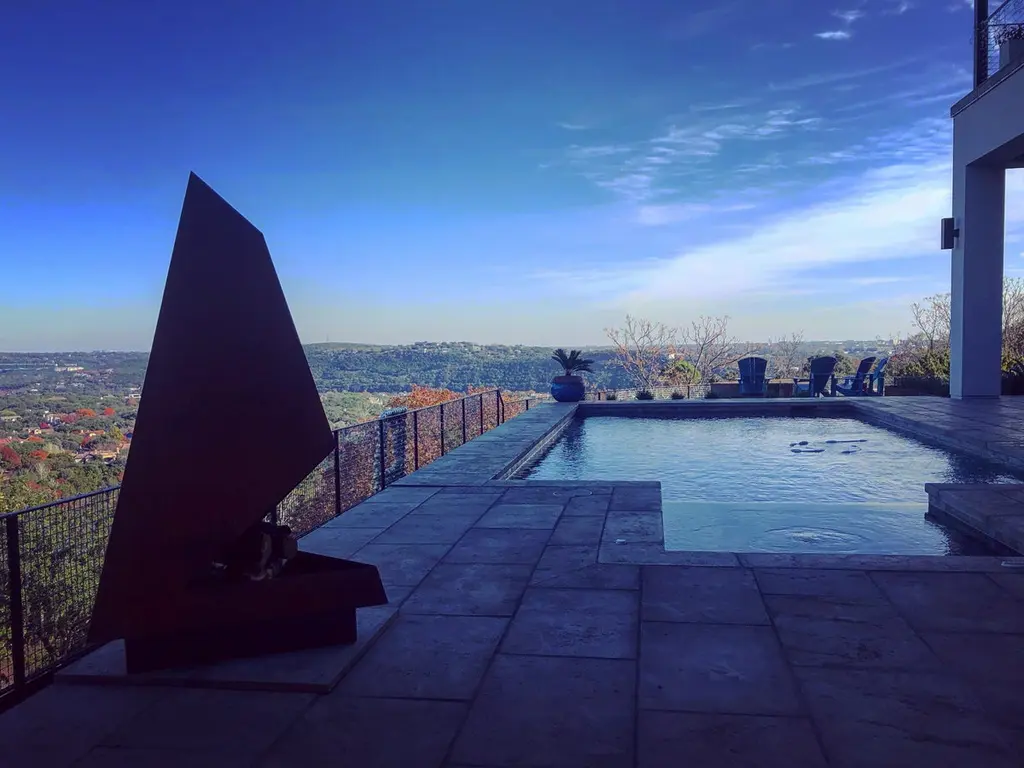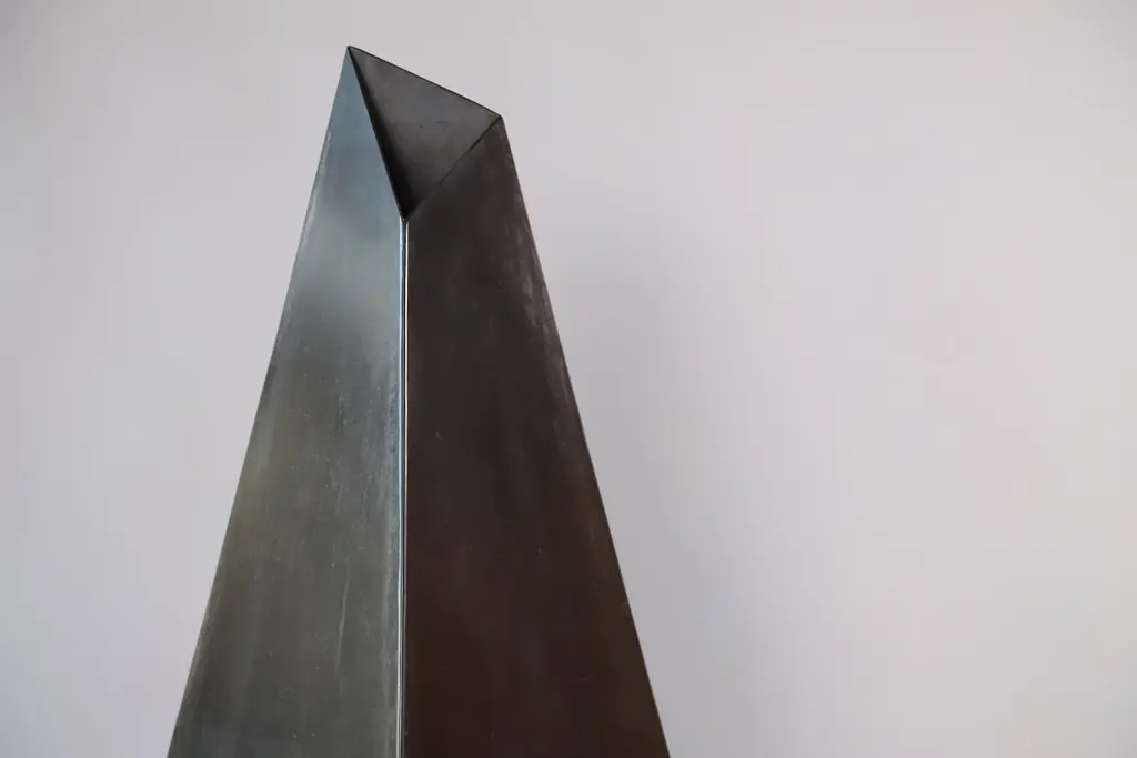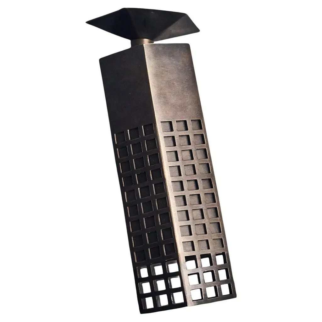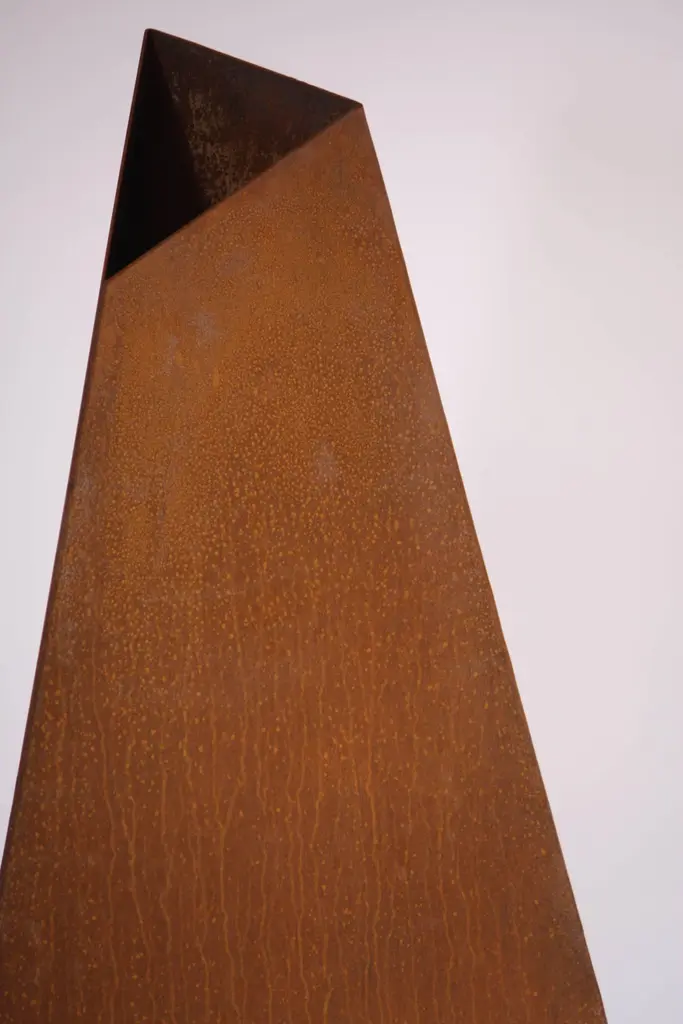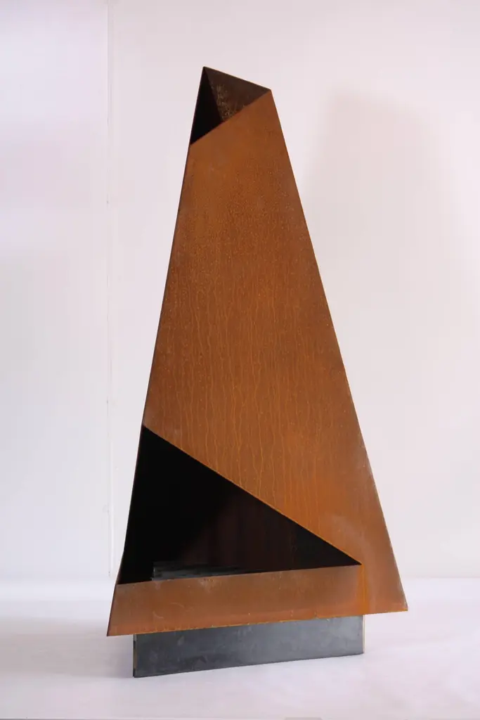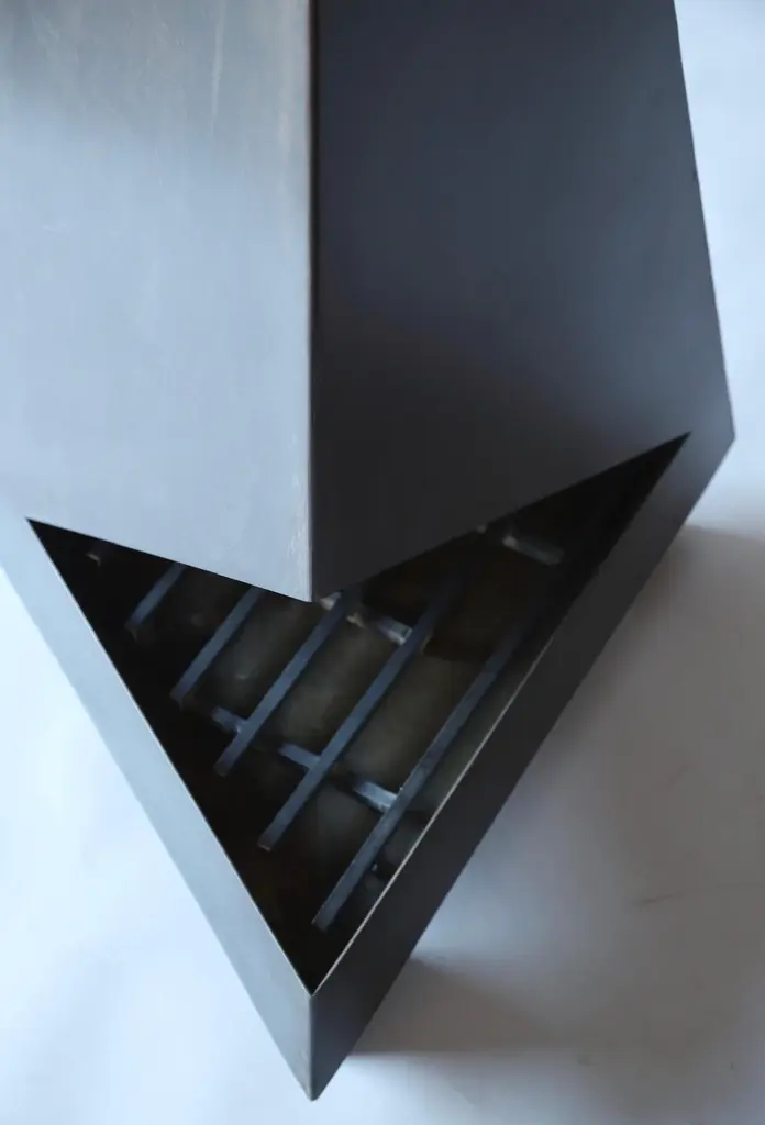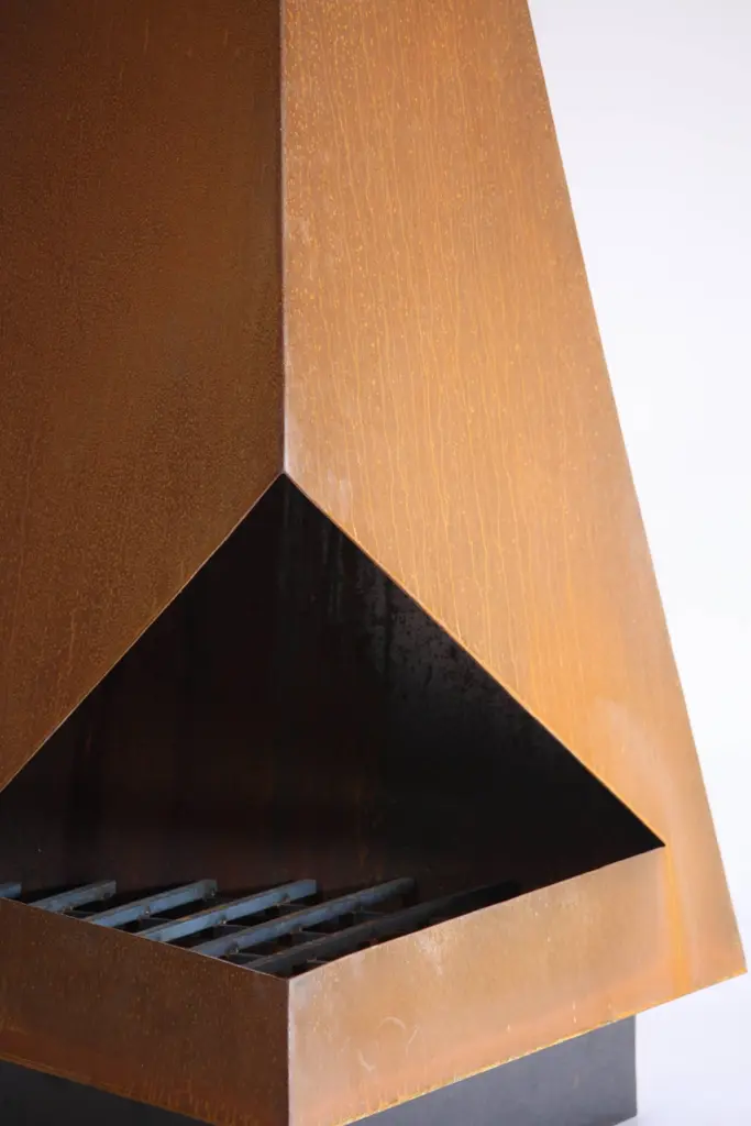 Not your normal chiminea or fireplace. This high design, raw steel sculptural piece will make a statement in any outdoor space. Functionally, it is perfect on that cold evening, but also serves as an amazing art display the remainder of the year. Features a solid stock steel rack that can be easily removed for cleaning fire debris and a handy poker. In addition, the chiminea is designed to hold standard split logs, not just the tiny bagged wood. Pictured with hand truck and sling chair by William Katavolos for scale. Follow local laws and common sense when it comes to starting a fire. Rusted finish varies. Also available in waxed raw steel that will patina to a rust finish over time.