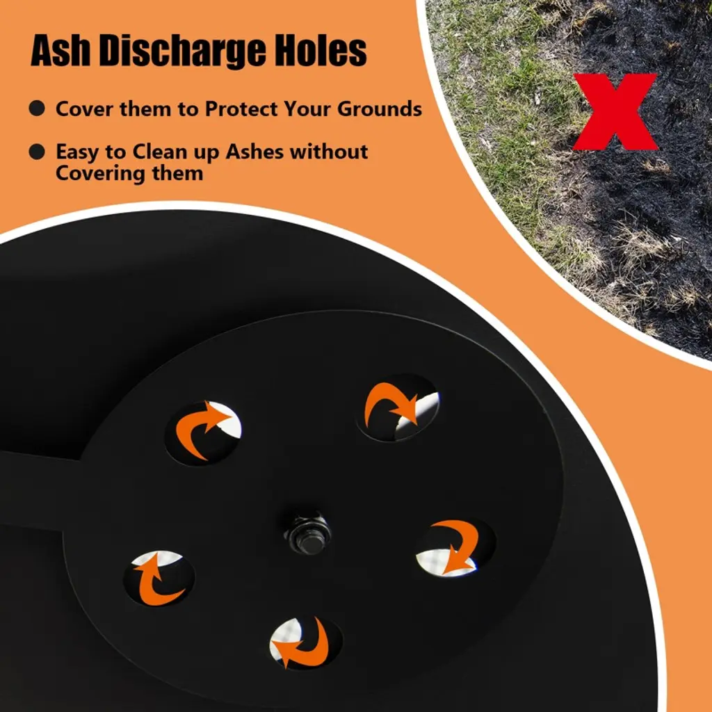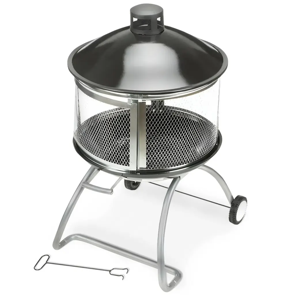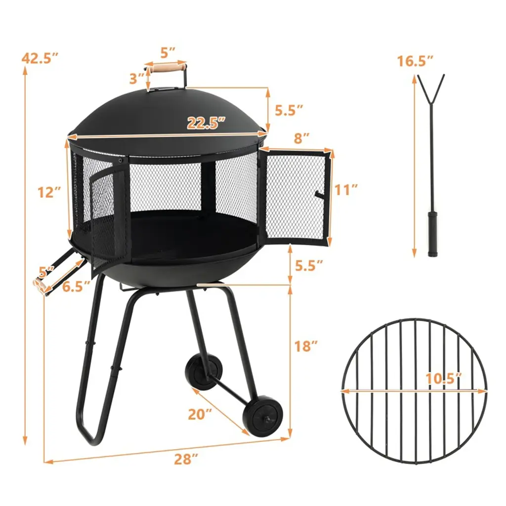 Never let the cold weather stop your outdoor gatherings by using this patio rolling fireplace! Through an anti-scalding handle and smooth wheels, this fire pit allows you to move it to the desired place easily. After that, the door with 180° wide-angle opening is convenient for you to add firewood. Once the firewood is lit, the all-around mesh design and log grate will keep the fire burning all the time. What’s more, the solid domed lid helps push heat outward rather than straight up, making outdoor gatherings warmer and cozier. If you want to stir up the fire, just use the included poker for great convenience. After burning, the ash discharge holes facilitate ash cleaning.FeaturesDoor with 180° wide-angle opening for marshmallow roastingHigh-temp resistant and rustproof metal frame for higher durabilityThe domed lid helps push heat outward for sufficient warmthLog grate and mesh design for air circulation to get a roaring fireConvenient to stir up the fire with included pokerEasy to clean the ashes with ash discharge holes2 wheels and an anti-scalding handle for easy movementSpecifications: Color: Black Material: Metal, Pine Wood Overall Dimension: 28” x 20” x 42.5” (W x D x H) Net Weight: 20 lbs Weight Capacity: 88 lbs Package Includes: 1 x Outdoor Fire Pit 1 x Fire Poker 1 x Log Grate 1 x Instruction