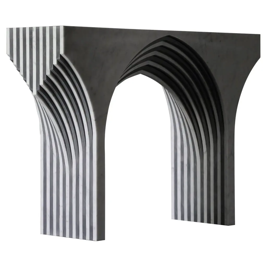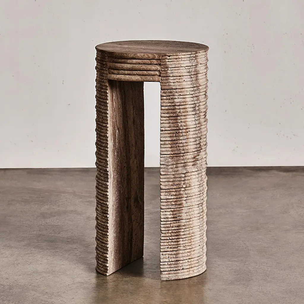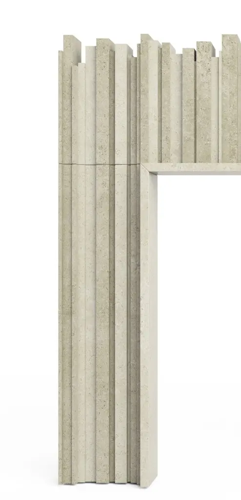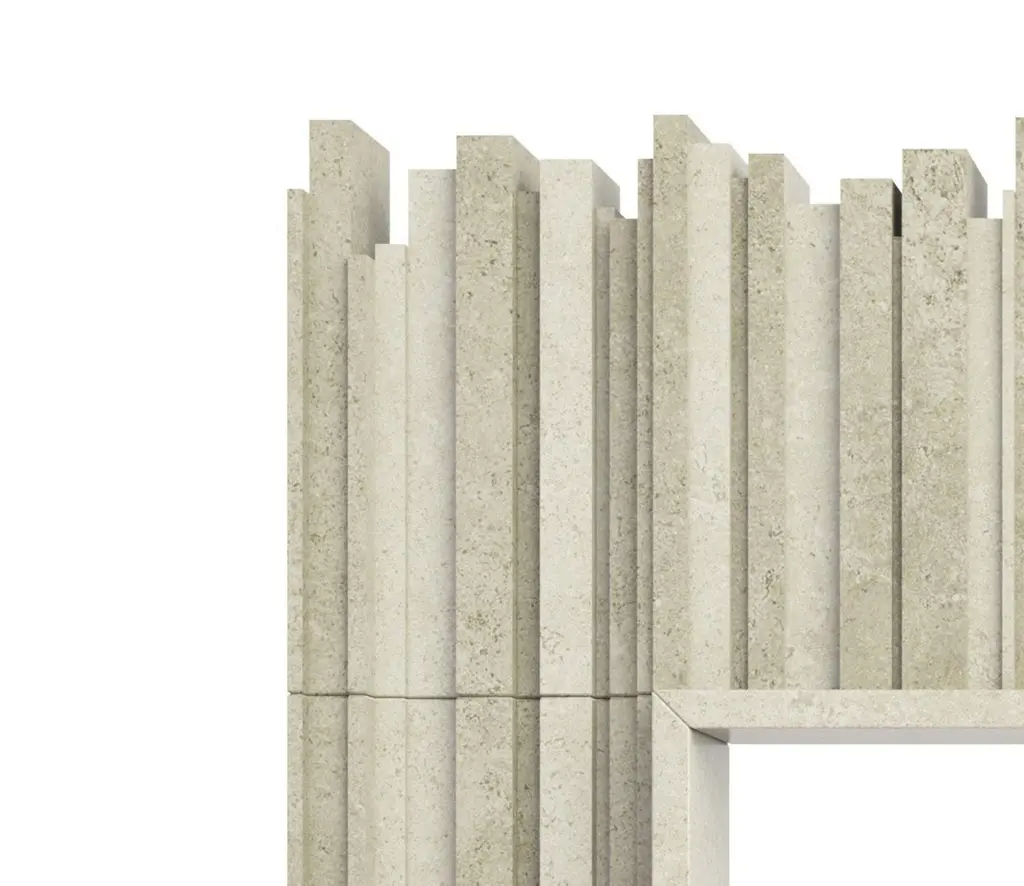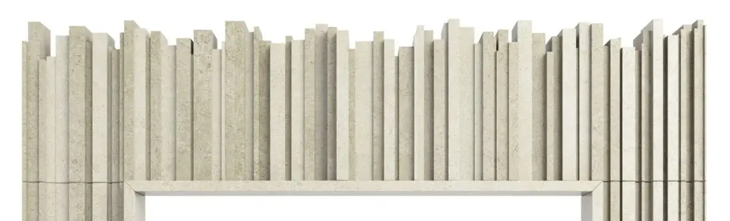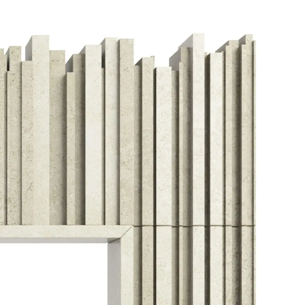 The Hemingway Stone Fireplace, from our Elizabeth Scott Collection, is playful and distinctive, with multiple levels of vertical stone segments coming together to create an eye-catching fireplace surround. The opening is surrounded by a thin raised frame on all three sides. Then the vertical segments continue - longer up through the fireplace legs, and shorter across the lintel piece. This design is available in limestone, travertine or marble, and it would be an amazing focal point in a modern Living Room, Great Room, or even Primary Bedroom. This design is made-to-order, and custom sizes are available.