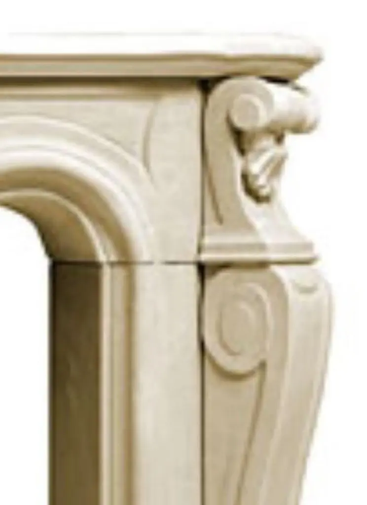 The Louis XV stone fireplace includes a curving top opening, typical of the 18th century Louis XV era in France. There are many variations of this fireplace style, but ours includes a detailed anthemion carving as the centerpiece of the lintel, with a subtle recessed frame to either side. The molding around the curving opening features more curves in the profile. Ornate legs turn out at 45 degrees, with a smaller scrolled detail at the top, followed by a carved shell, and then into another larger scrolling, curved section, down to the blocks of the plinths. The thin shelf piece also features plenty of curves, both in plan view as well as the edging detail. This fireplace looks beautiful in either limestone or marble, and works very well in a Living Room, Great Room, Dining Room, or Primary Bedroom. Custom sizes are available.